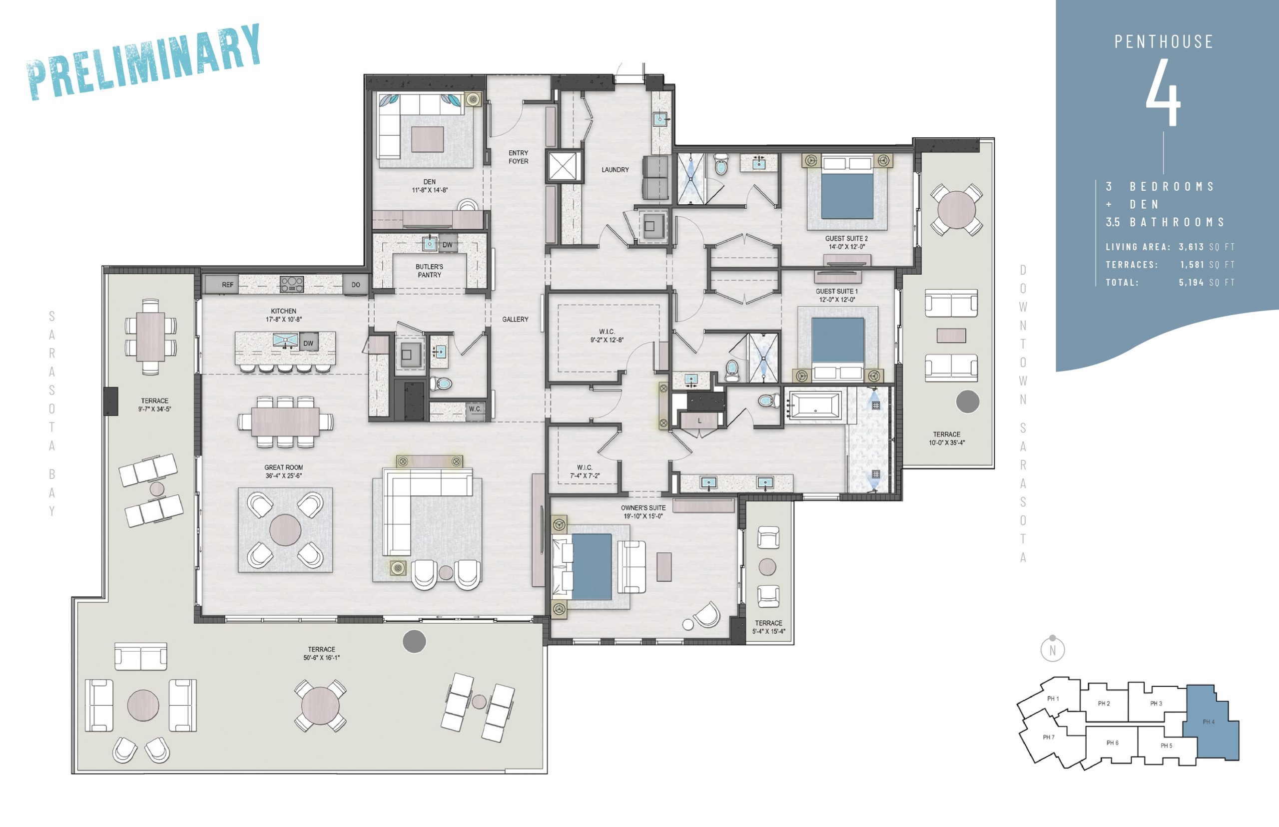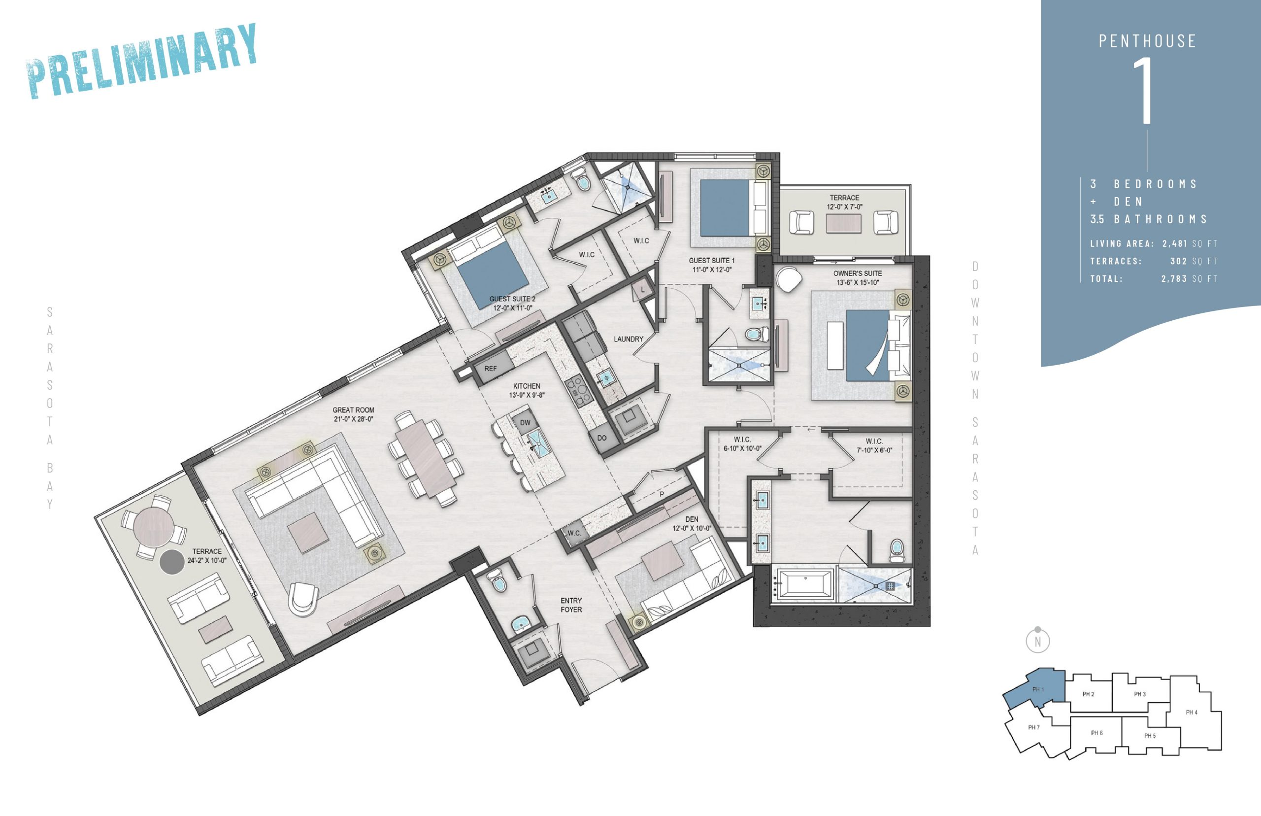 Each floor plan is unique with 12-foot ceilings and multiple terraces. Just imagine living in Penthouse 4 with 1,581 square feet of terrace space looking North, East, and South – and at two different marinas. Perhaps you only want 2 bedrooms with extra walk-in closets. In that case, the creative floorplan of PH6 may be the perfect solution. No matter what you desire, Bayso Sarasota offers a Penthouse for every discerning buyer.