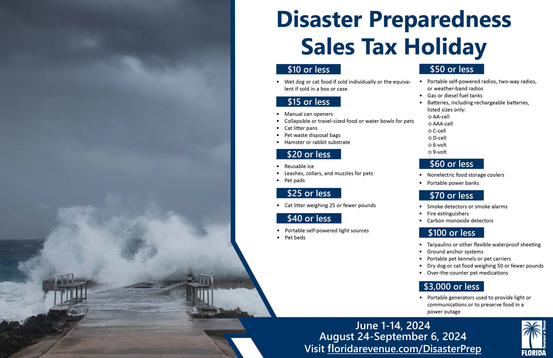 Florida consumers can purchase qualifying disaster preparedness supplies exempt from tax during the 2024 Disaster Preparedness Sales Tax Holiday. Passed by the Florida Legislature and signed into law by Gov. Ron DeSantis, the sales tax holiday begins Saturday, June 1 and extends through Friday, June 14.