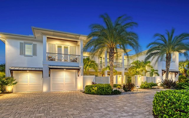 Crystal clear coastal waters and brilliant blue skies converge to create a beautiful backdrop of sweeping views from this Anna Maria Island waterfront luxury home.