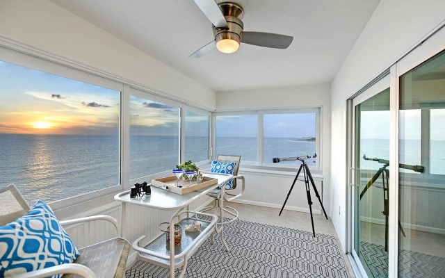 Downtown Sarasota third-floor end unit featuring two wrap-around balconies with spectacular sunrise and sunset views.