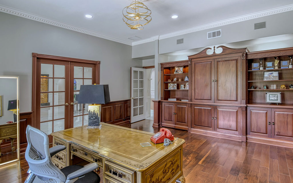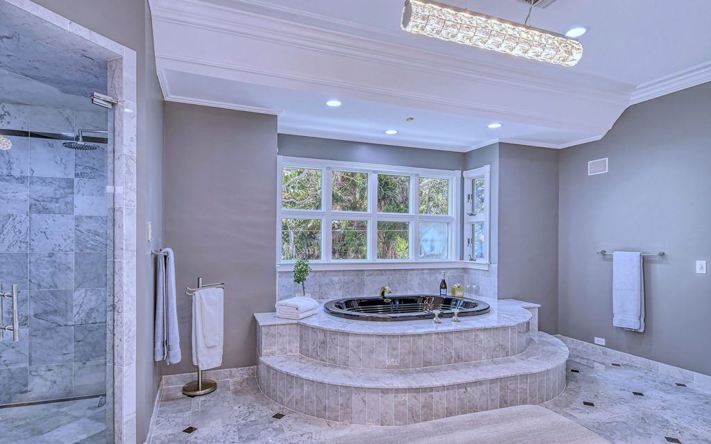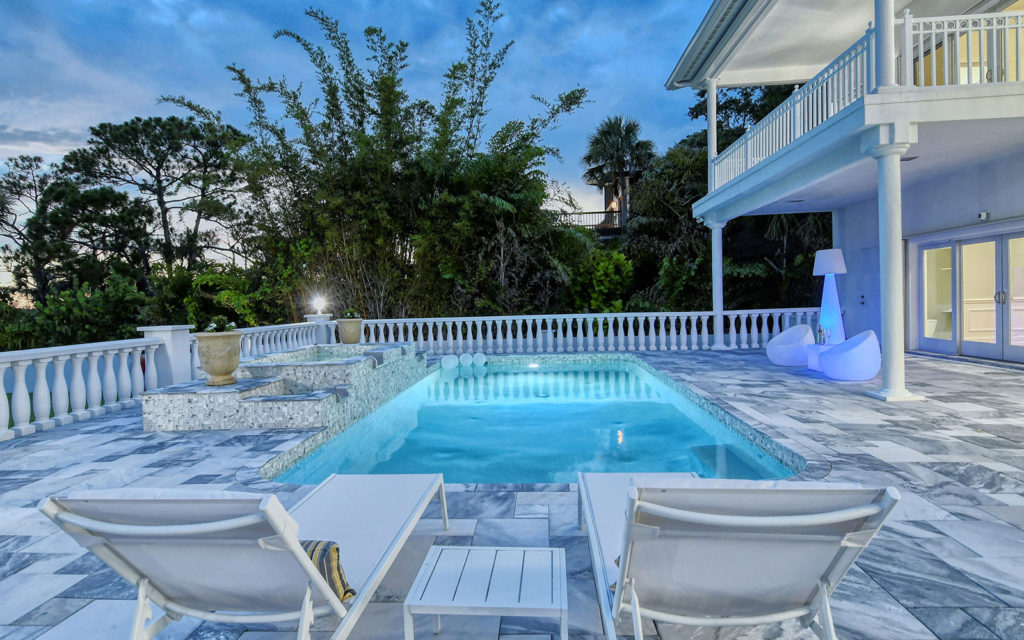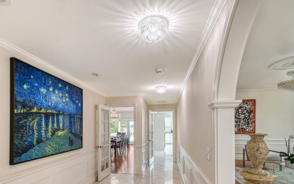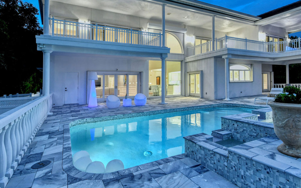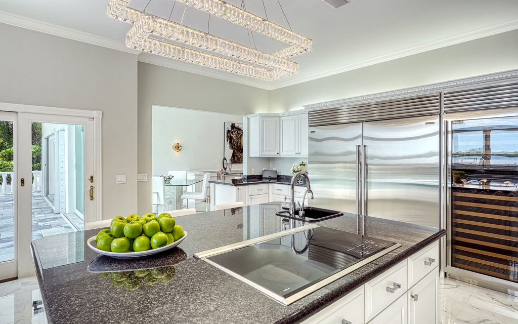 Inside, gentle arches, soaring ceilings, intricate woodwork and Schonbek crystal lighting attest to the home’s impressive nuances. Substantial upgrades in the last year include kitchen remodel including 150-bottle SubZero DualZone wine storage, stainless steel knobs/pulls and ice marble backsplash; new Euro-Wall sliding glass doors with arched transom in breakfast room; Schonbek light fixtures throughout; LED recessed ceiling lights inside and out; LED lights in light fixtures; 13×13 Emser tile in kitchen and breakfast room; three full-bath remodels; 9-ft. marble fireplace surround in family room; marble fireplace mantel in primary bedroom; pool renewed with PebbleTek surface, salt-water system, glass Emser tile and underwater LED lights; new landscape and irrigation; custom automatic entry gate with new motor, entry pad and WiFi remote control; environmentally-friendly LED dock lights; 1300W dual-fuel generator with two propane tanks; and more.