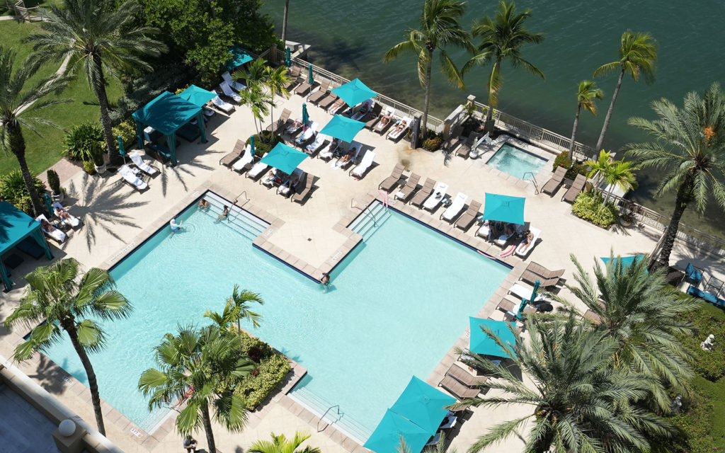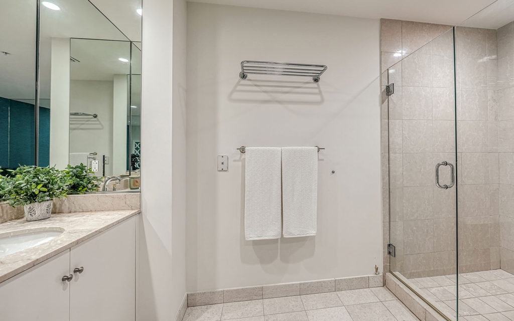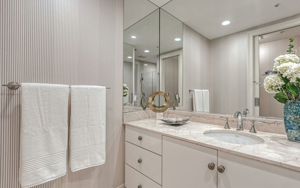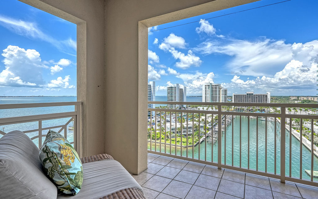 The main attraction here is the 28-ft. bayside balcony with waterfront view. In addition, every room has a water view and beams with the relaxed ambiance of a tropical paradise. This 2,239 sq. ft. split-plan residence features two deluxe bedroom suites, one at each end of the residence (this residence was previously combined with 1001, and the wall to one of the bedrooms is still open to the adjoining room). Between the suites, two large open living areas can be configured to your heart’s desire. The kitchen has access to both living spaces and features solid-wood cabinets, granite countertops, SubZero refrigerator/freezer and full wine cooler. This residence has an inside laundry room with washer and dryer. Two household pets under 45 lbs. are allowed with board approval.