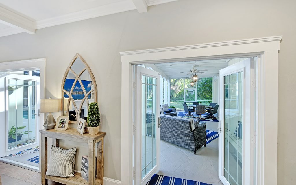 The house sits comfortably on an oversize, .47-acre, corner lot featuring a privacy wall and side-load garage with circular drive. While the front porch is a vestige of the past, the inside is totally today. 2018 updates include new roof, long-plank smoked-oak wood floor in living areas and bedrooms, marble and porcelain tile floor in baths and laundry, new doors and hardware, new trim and baseboards, LED lighting, custom solid-wood cabinetry with quartz countertops, new interior paint, remodeled kitchen, and remodeled baths. 2016 updates include new air conditioning, impact windows, pool surface and pool screen.
