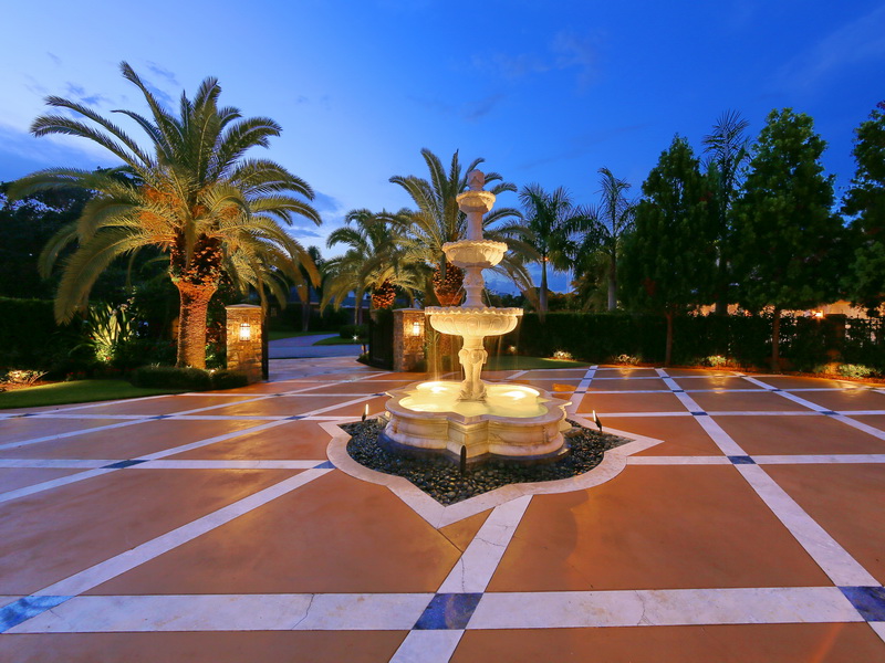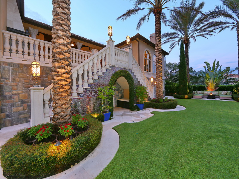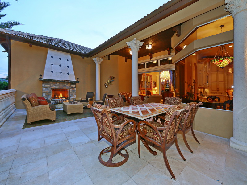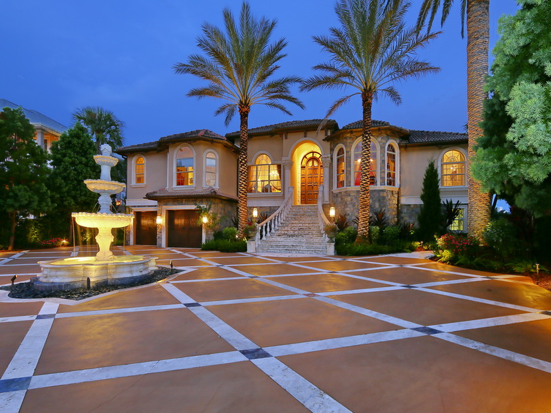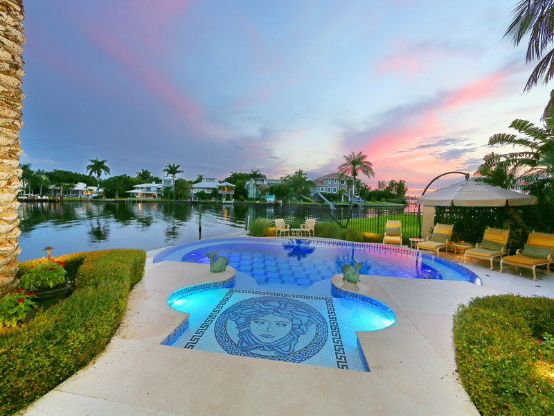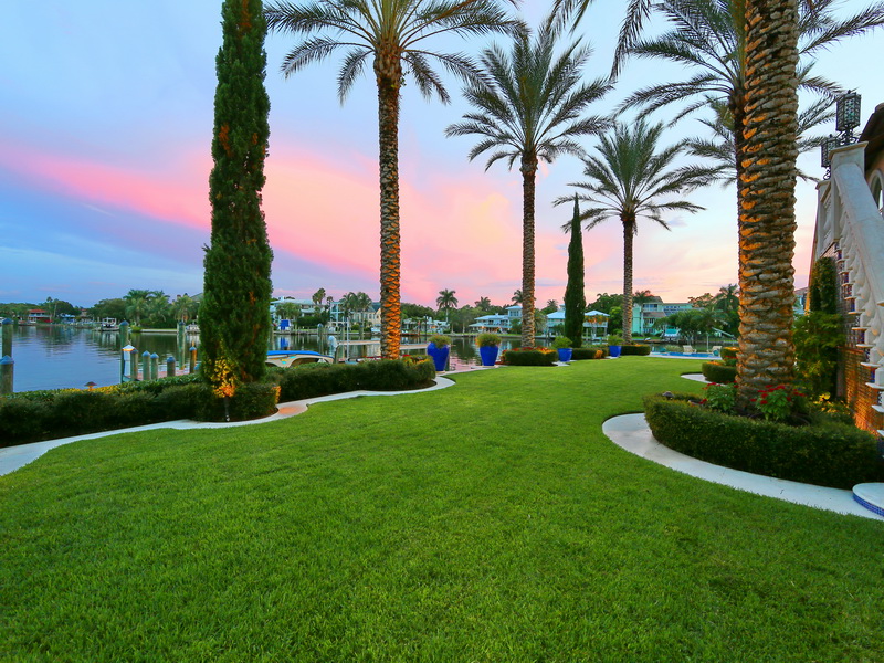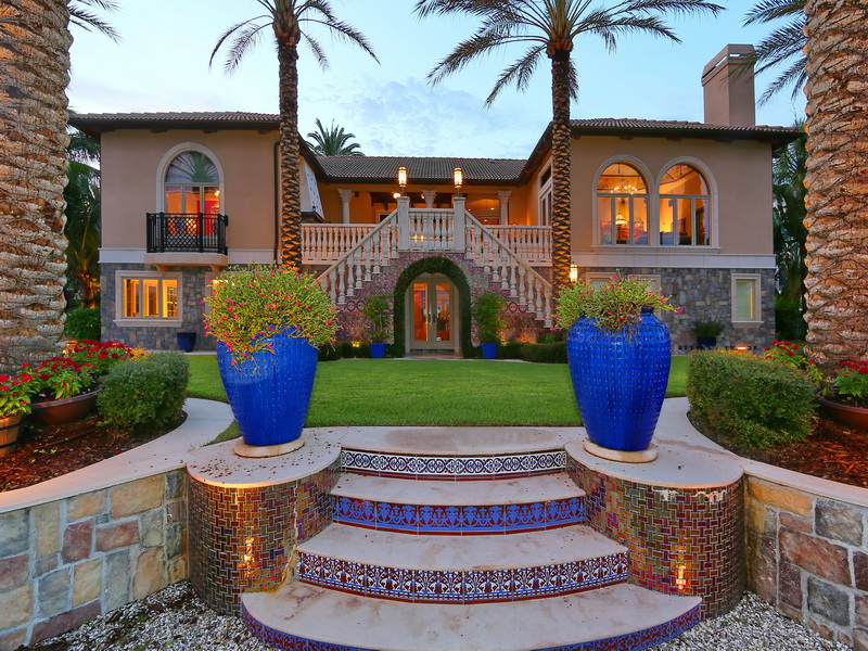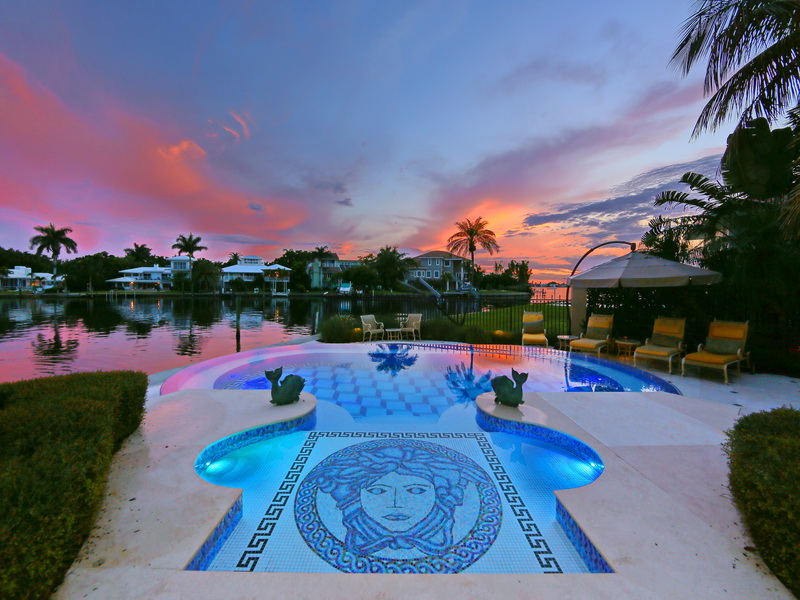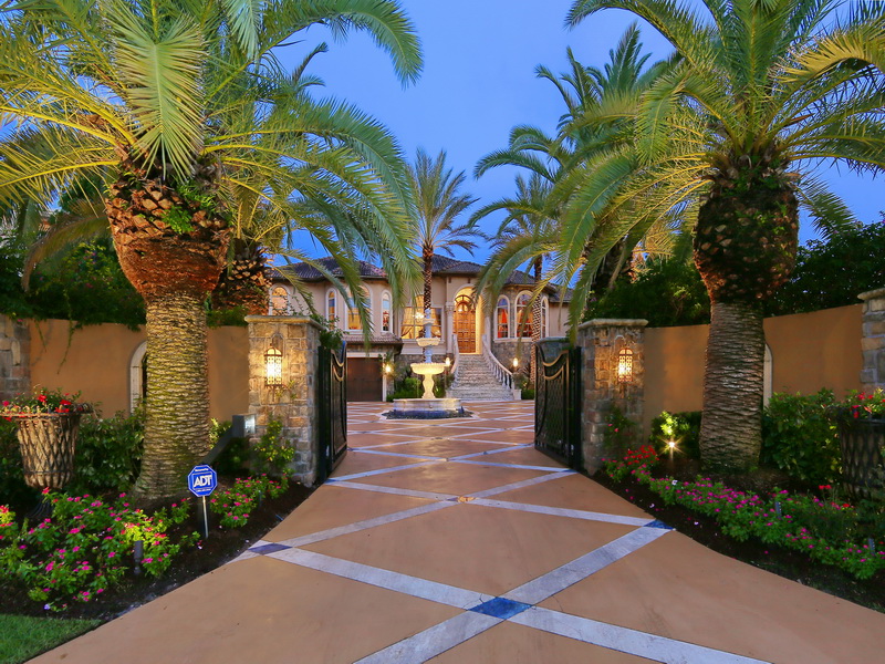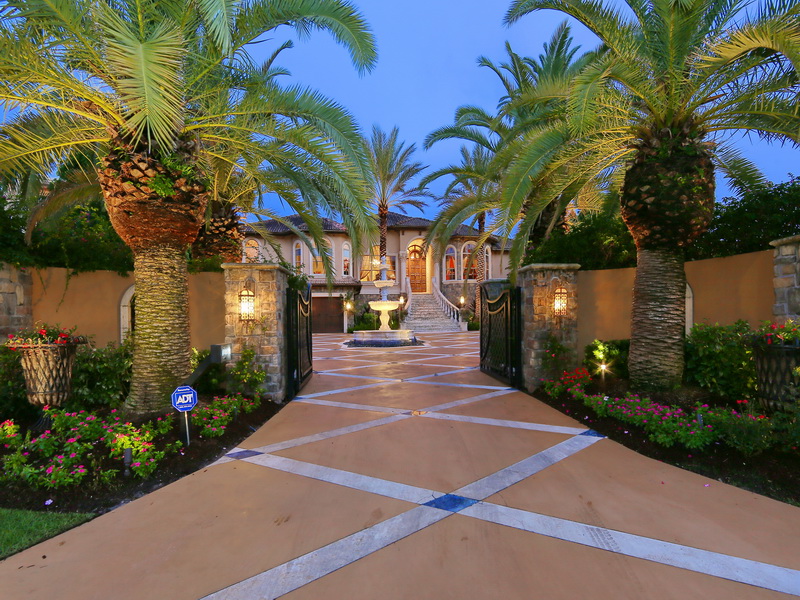 You enter through automatic gates into an Italian courtyard surrounding a 12-foot marble water fountain with impeccably landscaped gardens bordered by specimen palms. The outdoor living and entertainment areas overlooking the spectacular sunset waterfront and bay views are perfect for intimate dinners or family gatherings, and for larger lavish events. From the expansive balcony off of the family and formal living rooms with an outdoor fireplace and kitchen, to the lush Mediterranean-influenced backyard gardens and a 100 percent infinity-edge pool that is hand-set with thousands of mosaic tiles, your choice for the party is unlimited. Add a bonus area of 2,700 square feet and a car enthusiast’s six-car custom garage with full workroom, and you have a complete palace.