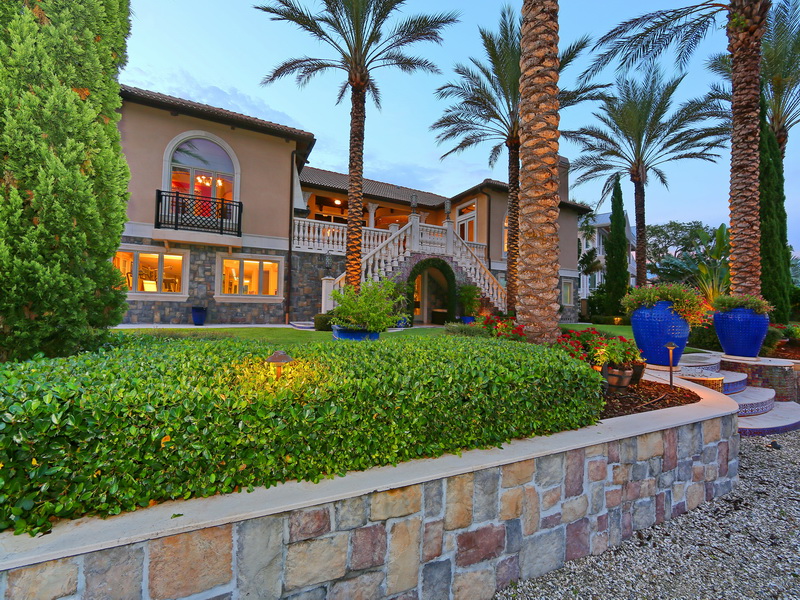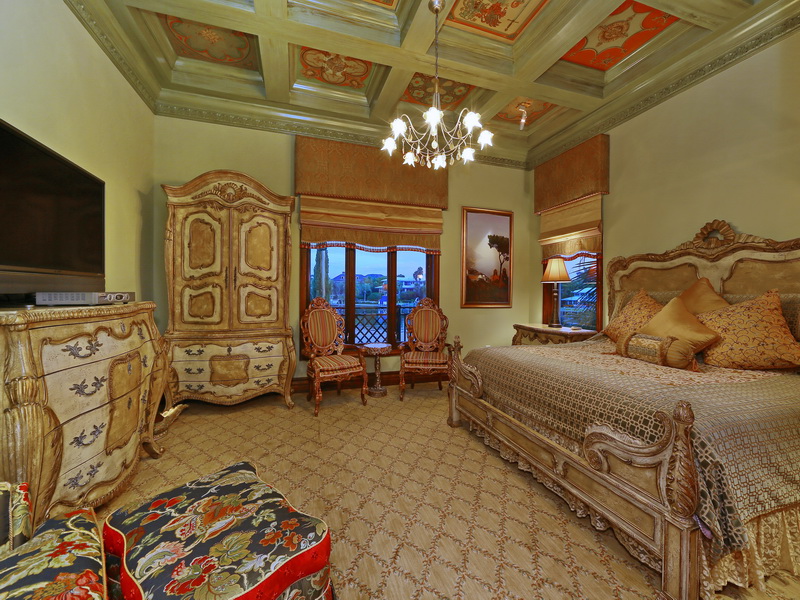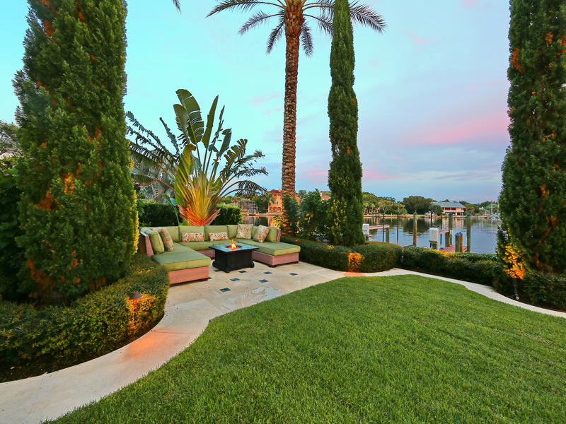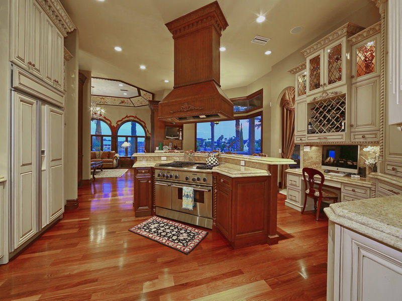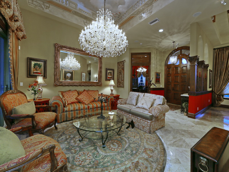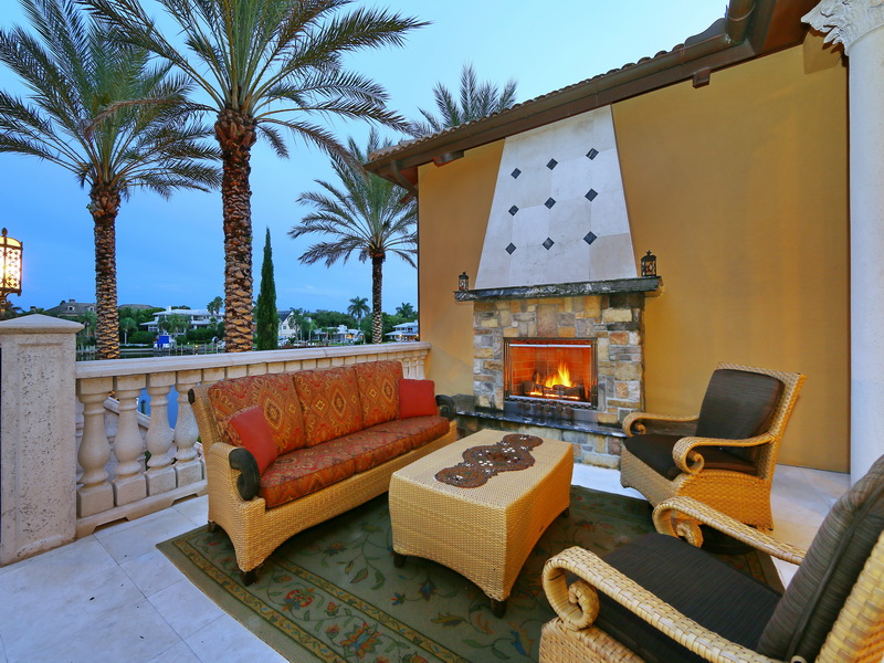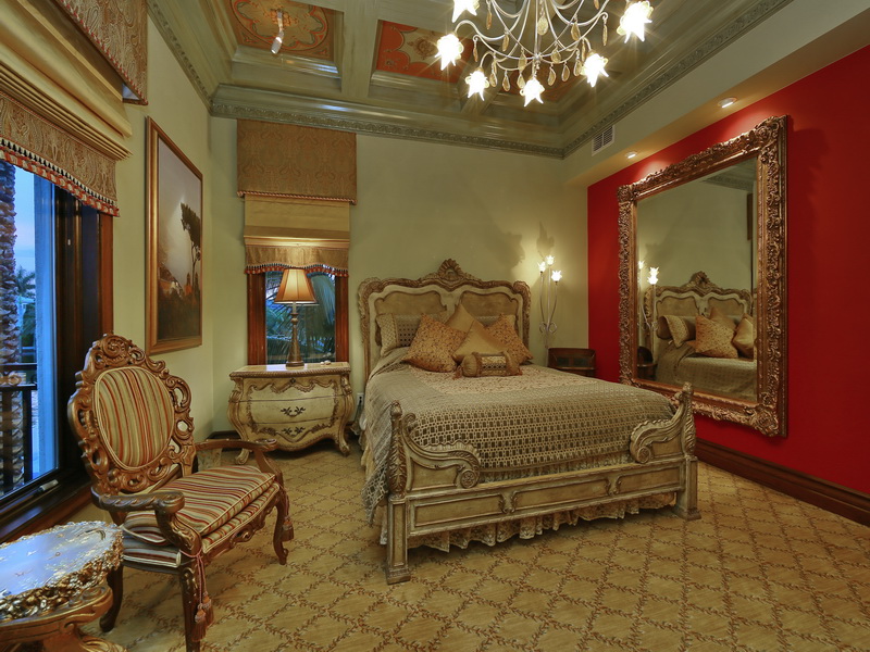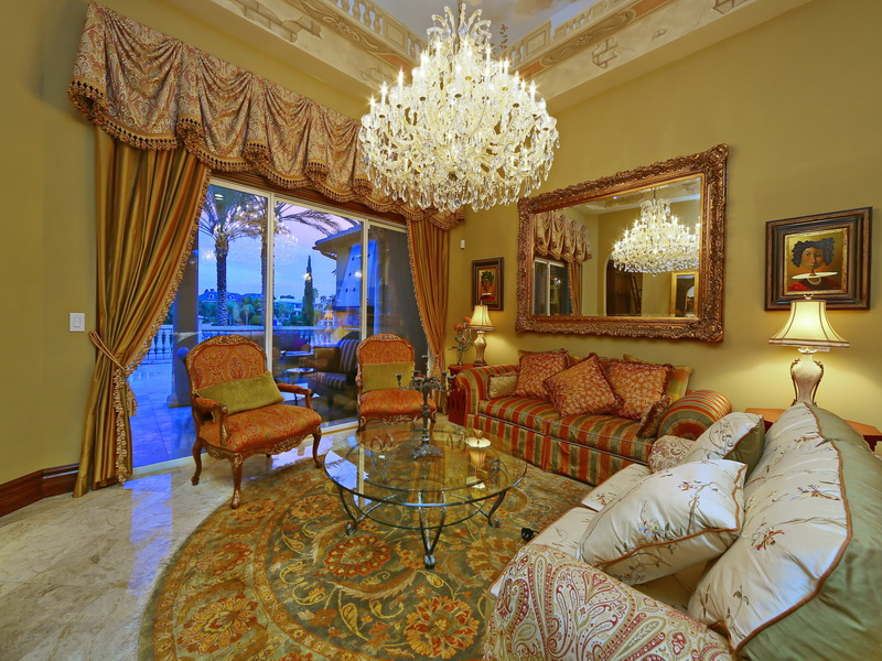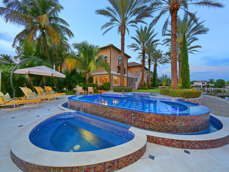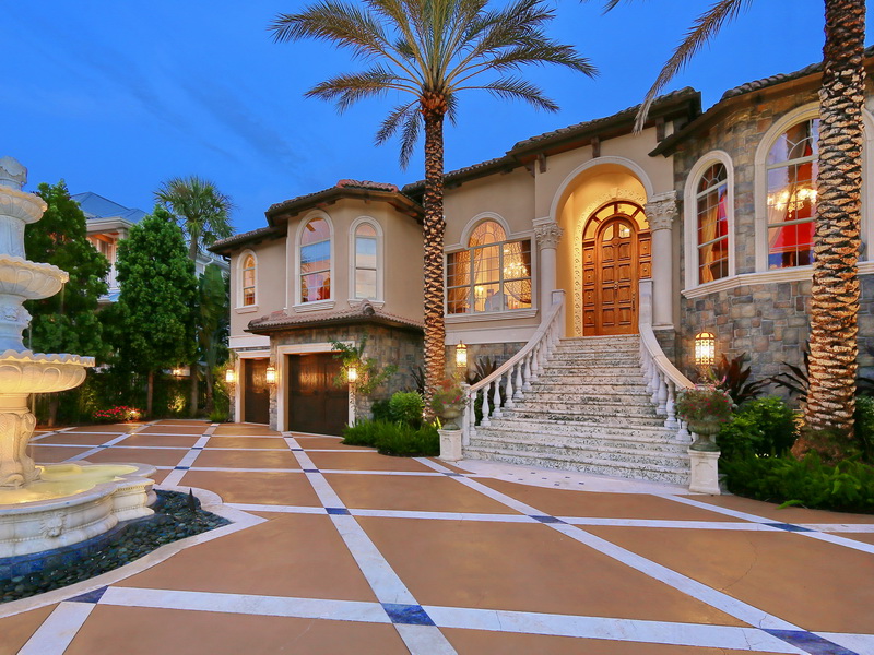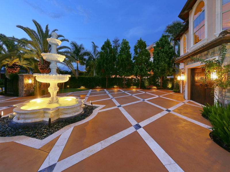 You enter through automatic gates into an Italian courtyard surrounding a 12-foot marble water fountain with impeccably landscaped gardens bordered by specimen palms. The outdoor living and entertainment areas overlooking the spectacular sunset waterfront and bay views are perfect for intimate dinners or family gatherings, and for larger lavish events. From the expansive balcony off of the family and formal living rooms with an outdoor fireplace and kitchen, to the lush Mediterranean-influenced backyard gardens and a 100 percent infinity-edge pool that is hand-set with thousands of mosaic tiles, your choice for the party is unlimited. Add a bonus area of 2,700 square feet and a car enthusiast’s six-car custom garage with full workroom, and you have a complete palace.