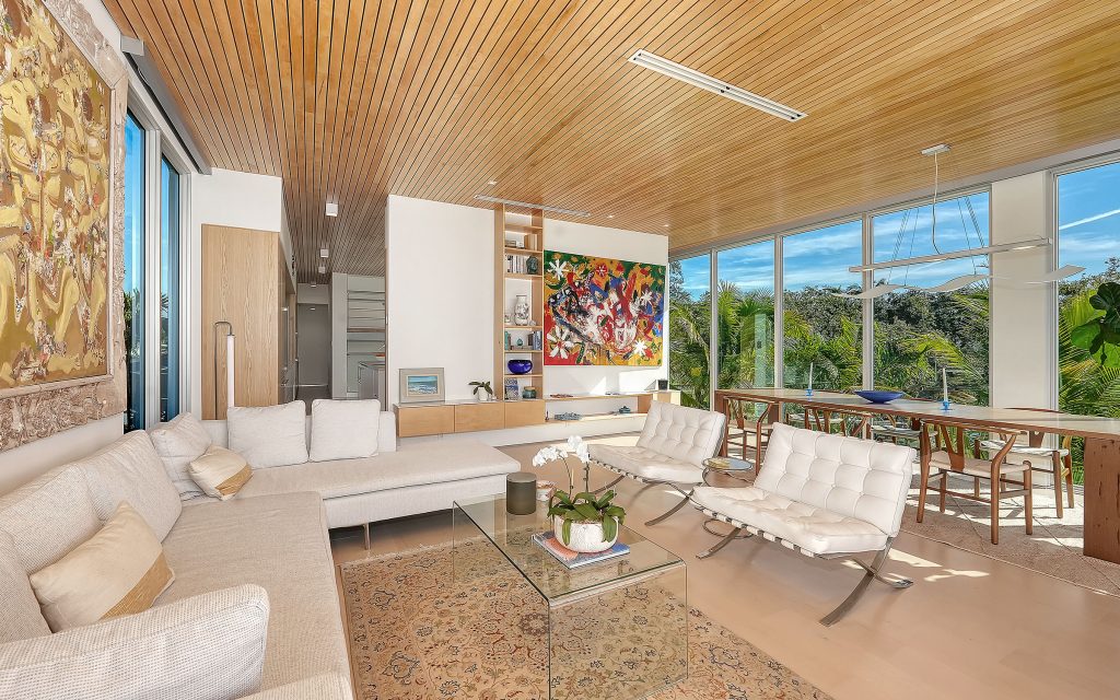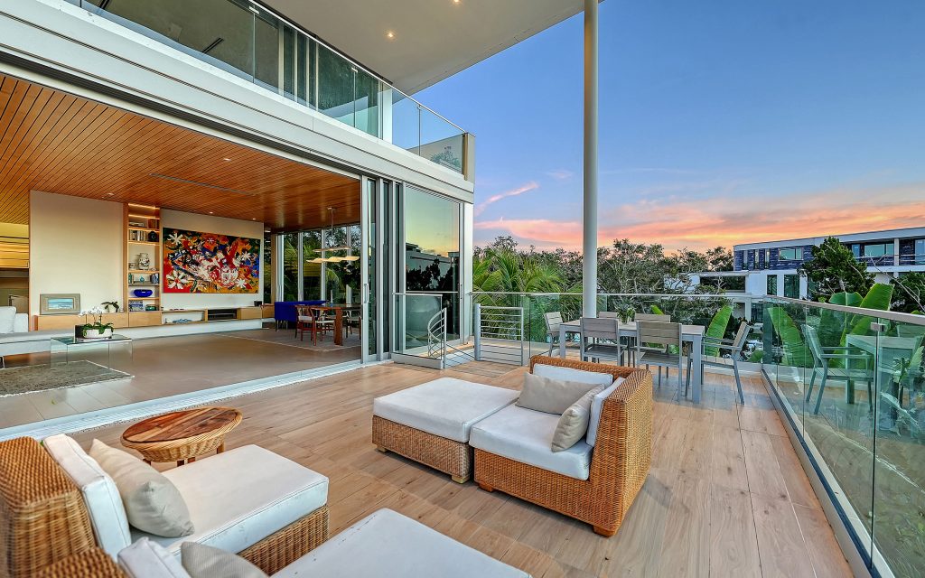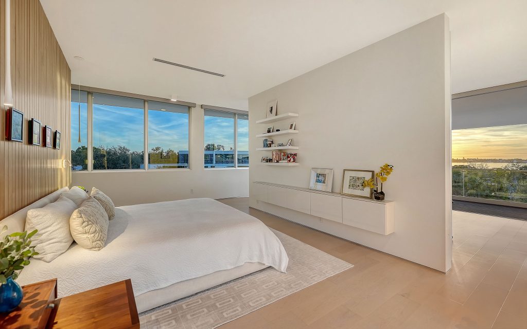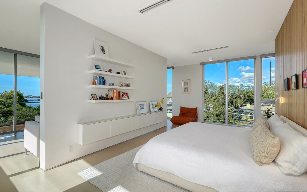 Set at the end of a quiet dead-end street surrounded by boatable water, the 4,042 sq. ft. residence (6,678 sq. ft. total) features clean-lined contemporary architecture, floating stairs with glass railings, an elevator to all levels, and walls of glass that fill the interiors with natural light. Premium finishes include a custom European kitchen with DOCA cabinetry and porcelain countertops, LED lighting throughout, motorized shades and a whole-house generator. Balconies on the second and third floors frame views toward Roberts Bay.