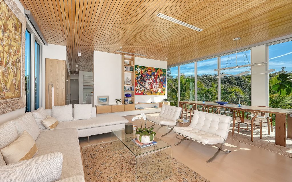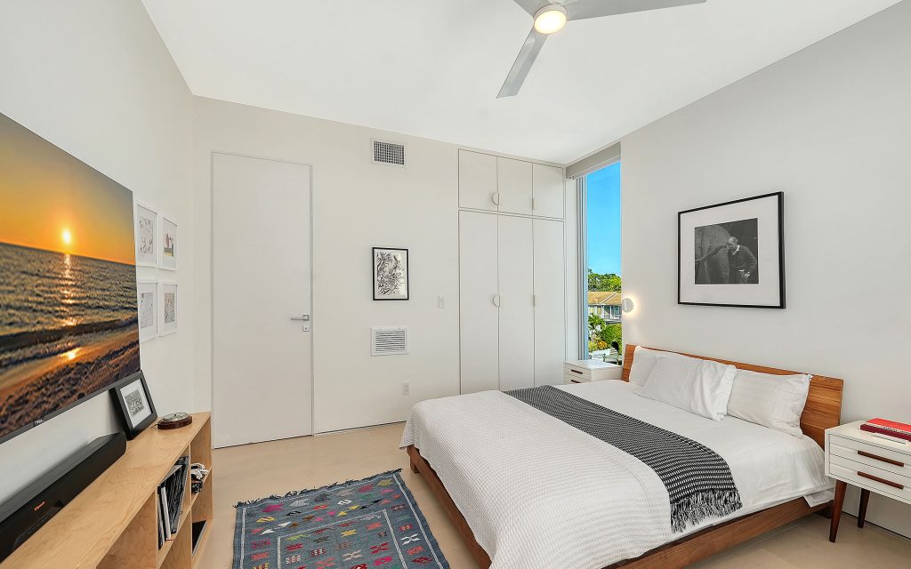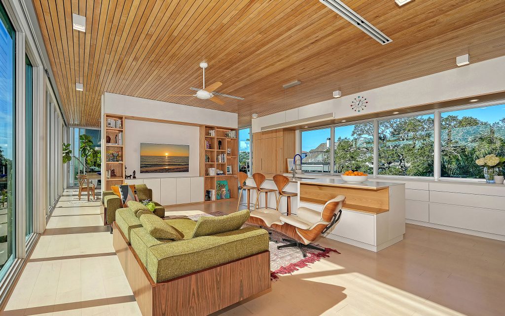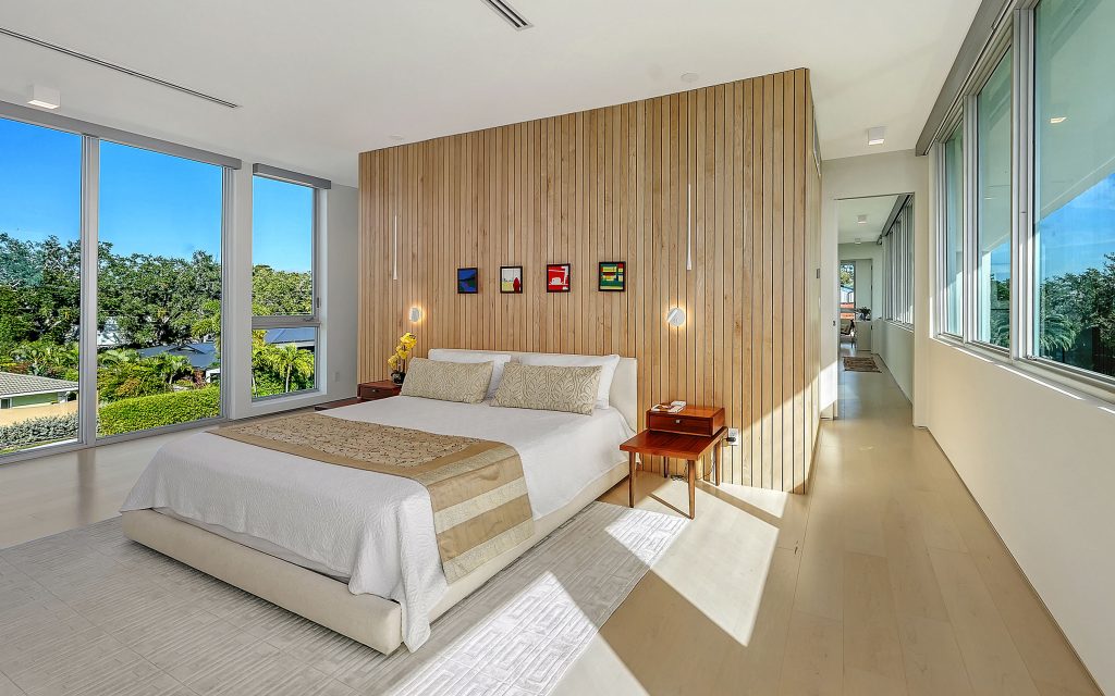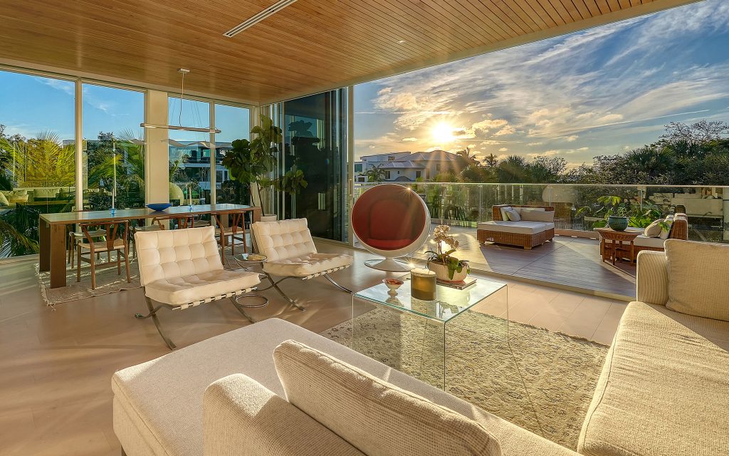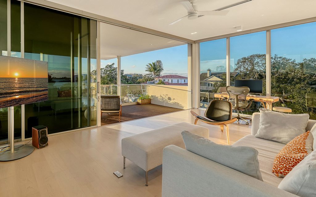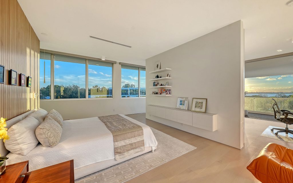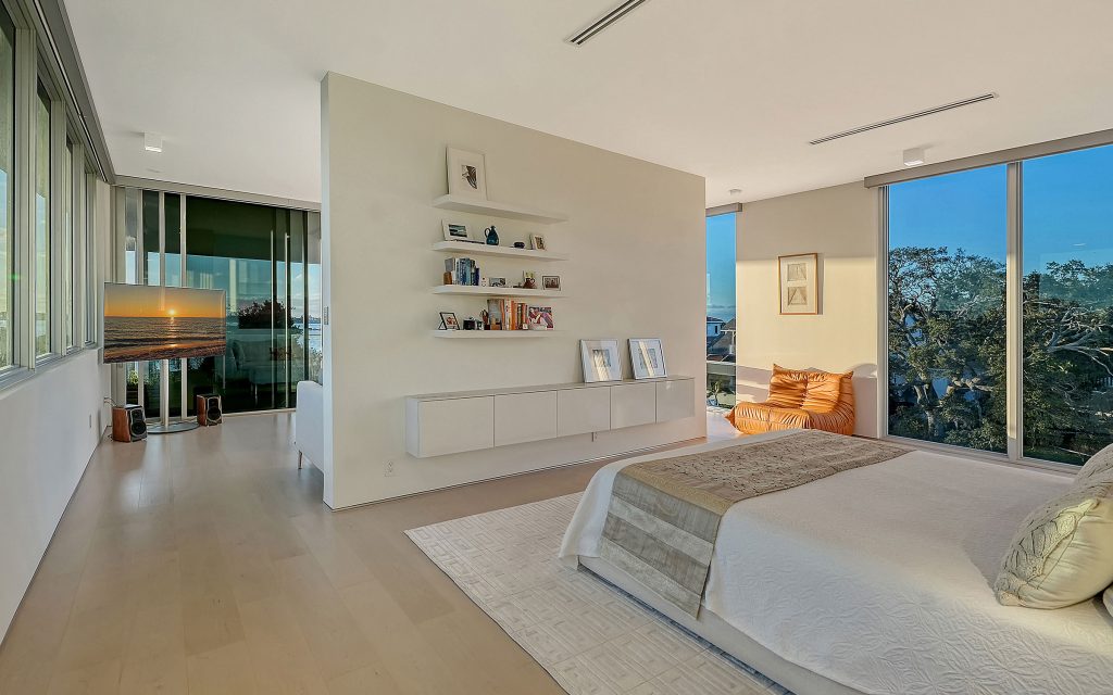 Set at the end of a quiet dead-end street, the home features clean-lined contemporary architecture, floating stairs with glass railings, an elevator to all levels, and walls of glass that fill the interiors with natural light. Premium finishes include LED lighting throughout, pre-wiring for motorized shades, and a whole-house generator. Balconies on the second and third floors frame views toward Roberts Bay.