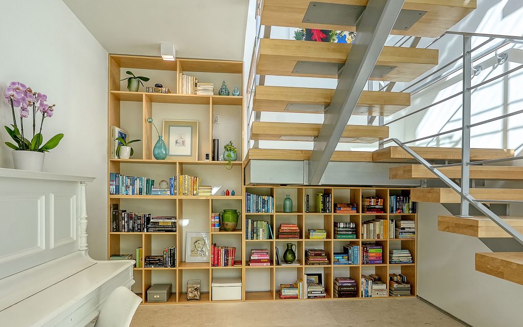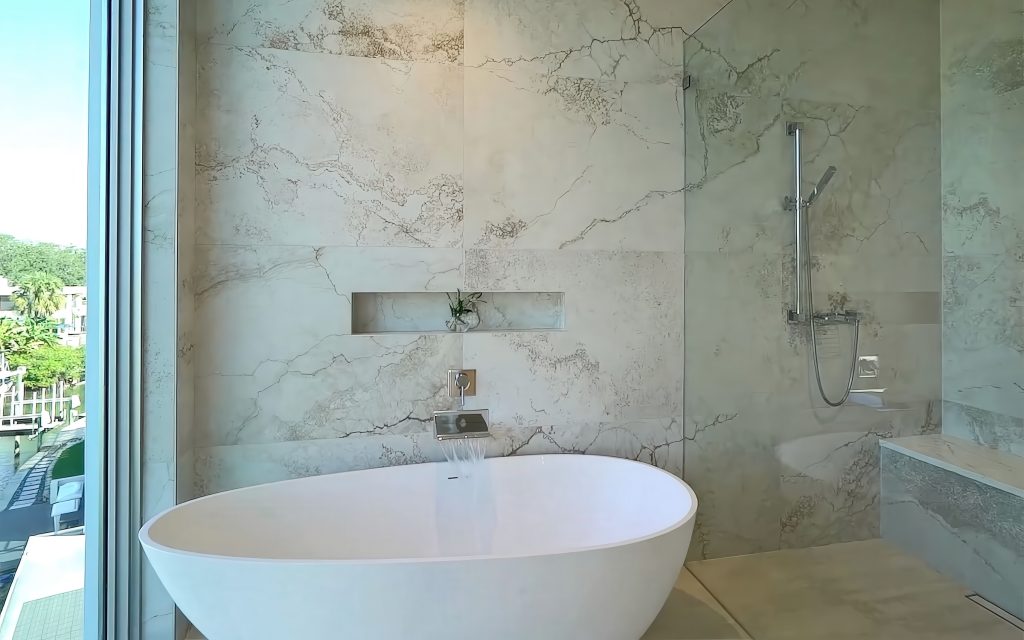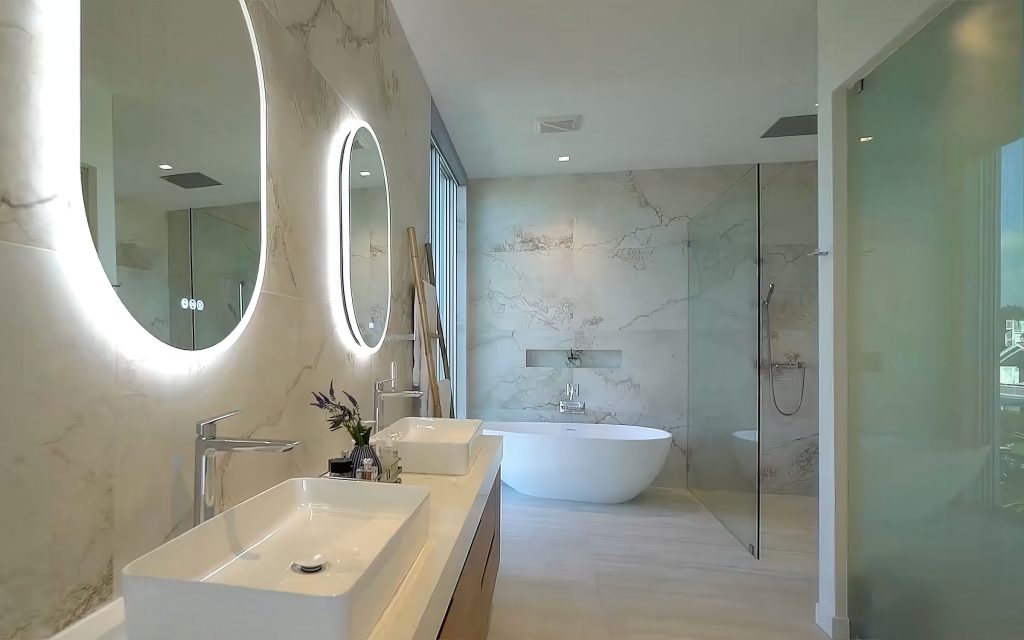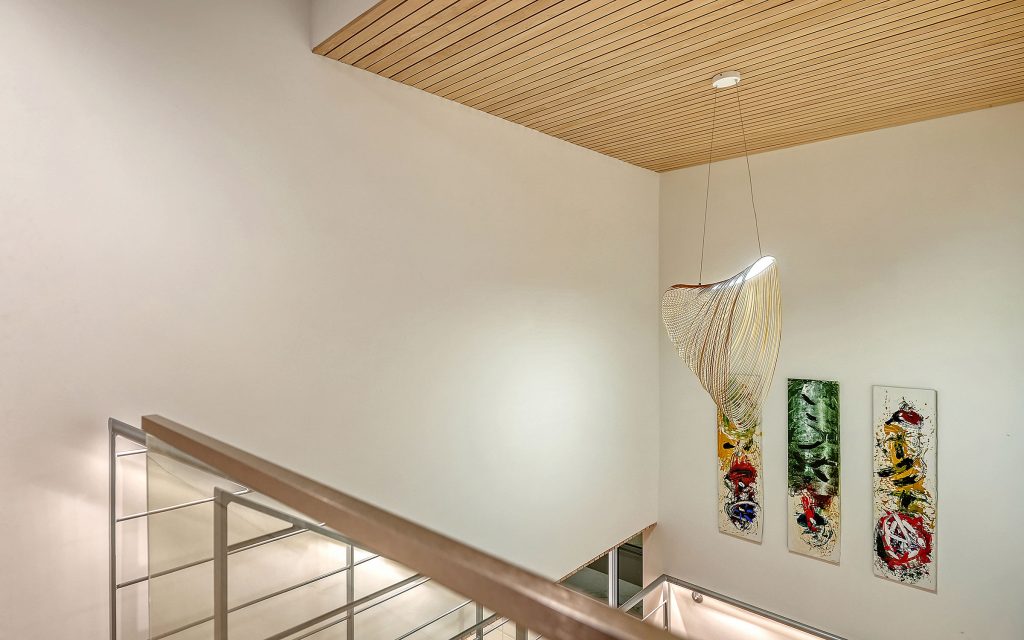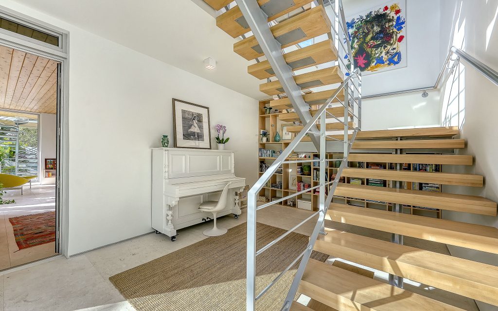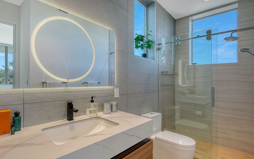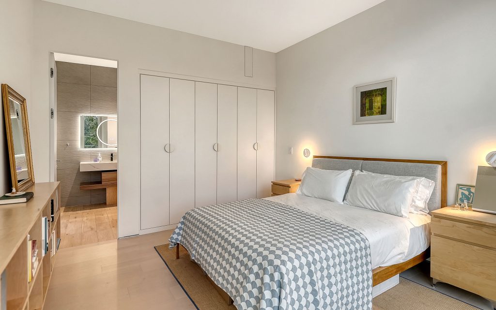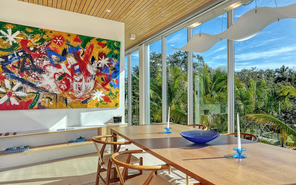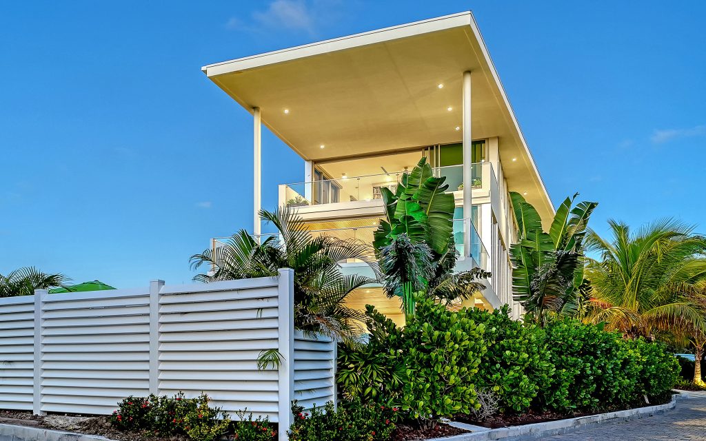 Set at the end of a quiet dead-end street, the home features clean-lined contemporary architecture, floating stairs with glass railings, an elevator to all levels, and walls of glass that fill the interiors with natural light. Premium finishes include LED lighting throughout, pre-wiring for motorized shades, and a whole-house generator. Balconies on the second and third floors frame views toward Roberts Bay.