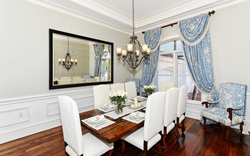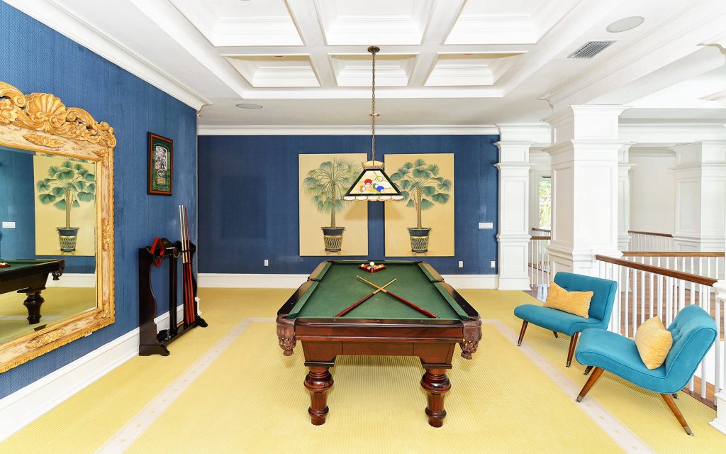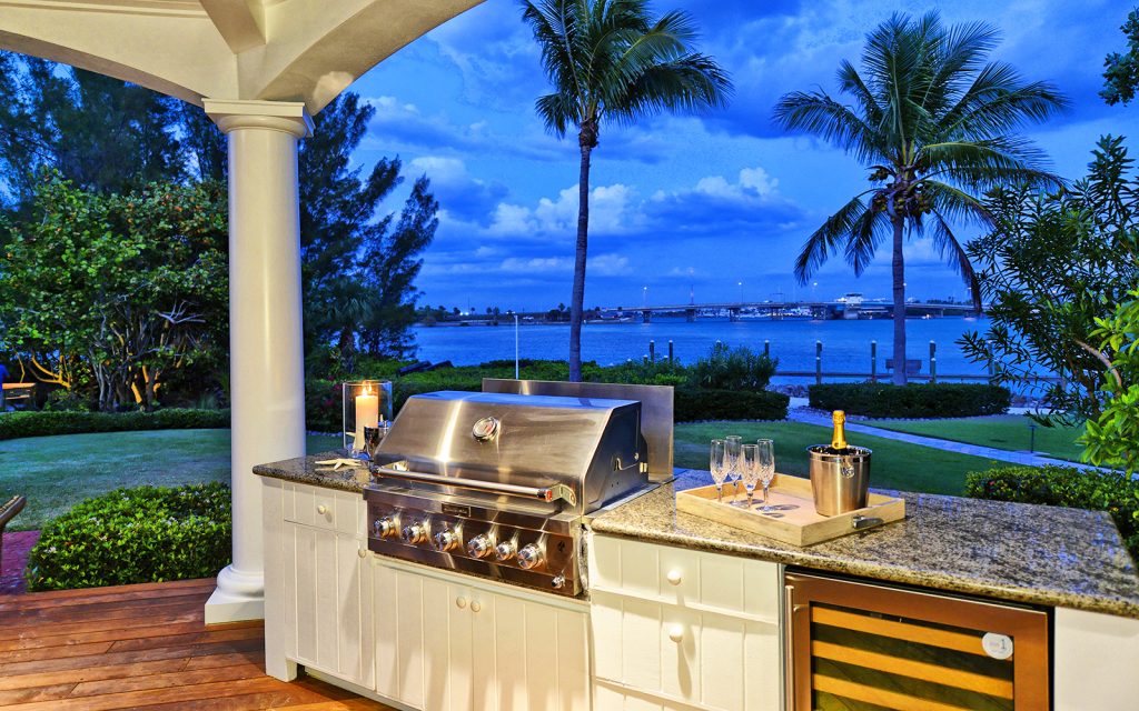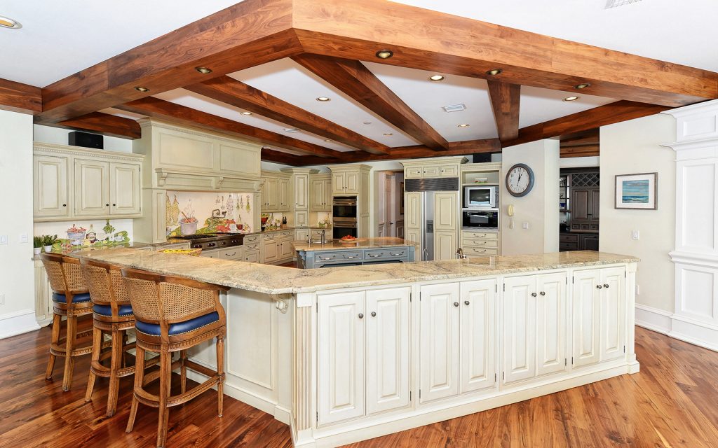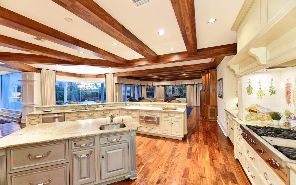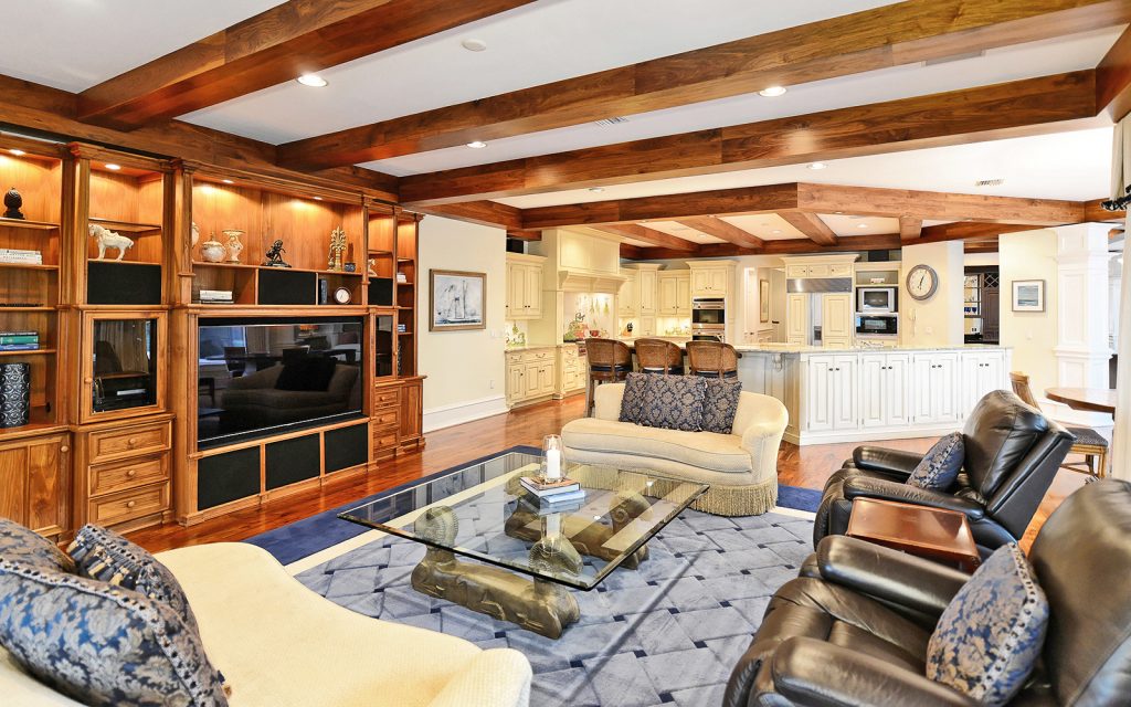 This heavenly retreat is packed top to bottom with sunny rooms, expert craftsmanship, casual elegance and serene water views. The scale is quite large — 9,180 square feet of interior space with 5 bedrooms, 7.5 baths, fitness gym, home office, game room, and 4,345 additional square feet of covered outdoor living space. Soaring ceilings and floor-to-ceiling windows make an impressive entrance that befits the stunning waterfront location. The living room, which extends upward to an octagonal, tongue-and-groove, 22-ft. ceiling, adjoins the formal dining room and well-provisioned wet bar. The open kitchen is a cook’s delight with center island, eat-in counter and top-of-the-line appliances. Next to the kitchen, the family room features sliding glass doors to a covered porch and outdoor kitchen.