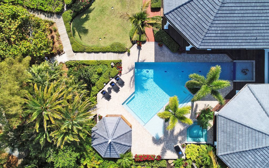 The master bedroom is on the first floor and features two walk-in closets and sliding glass doors to a covered patio. The ensuite master bath has two vanities, two water closets, jetted tub, double walk-in shower and outdoor shower with privacy surround. The other bedrooms are on the second floor along with an expansive game room and wet bar. The 5th bedroom is part of an in-law suite that also includes a sitting area, wet bar, laundry closet, ensuite bath and balcony. For the fitness aficionado, the home has a fully-equipped gym (equipment negotiable) and heated pool with 50-ft. lap lane. Outside, two boardwalks connect the pool deck to the bay — one goes directly to the bay and is ideal for putting in kayaks/paddleboards, and the other goes to the private dock where there is a boat lift and fishing pier. Between the boardwalks, an outdoor firepit surrounded by benches invites informal gatherings in the tropical landscape.
