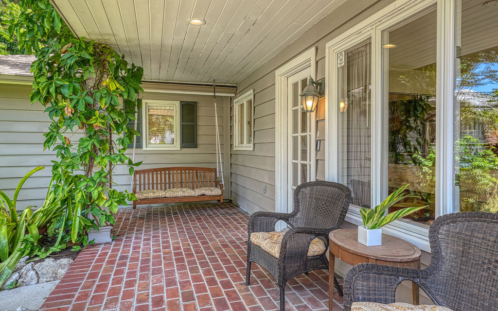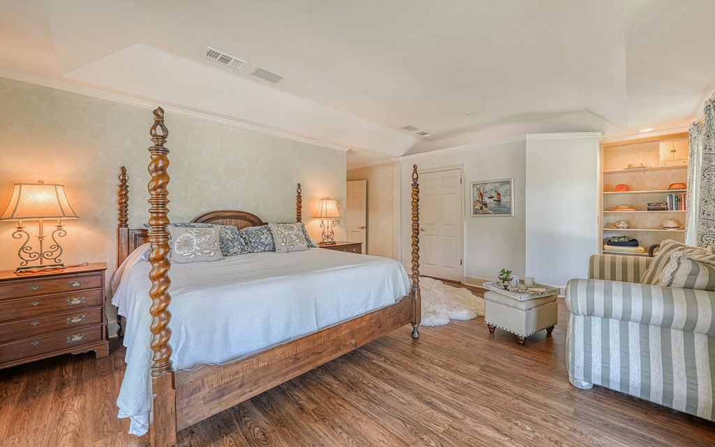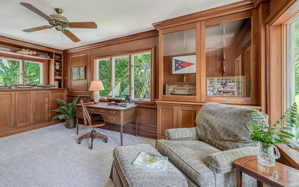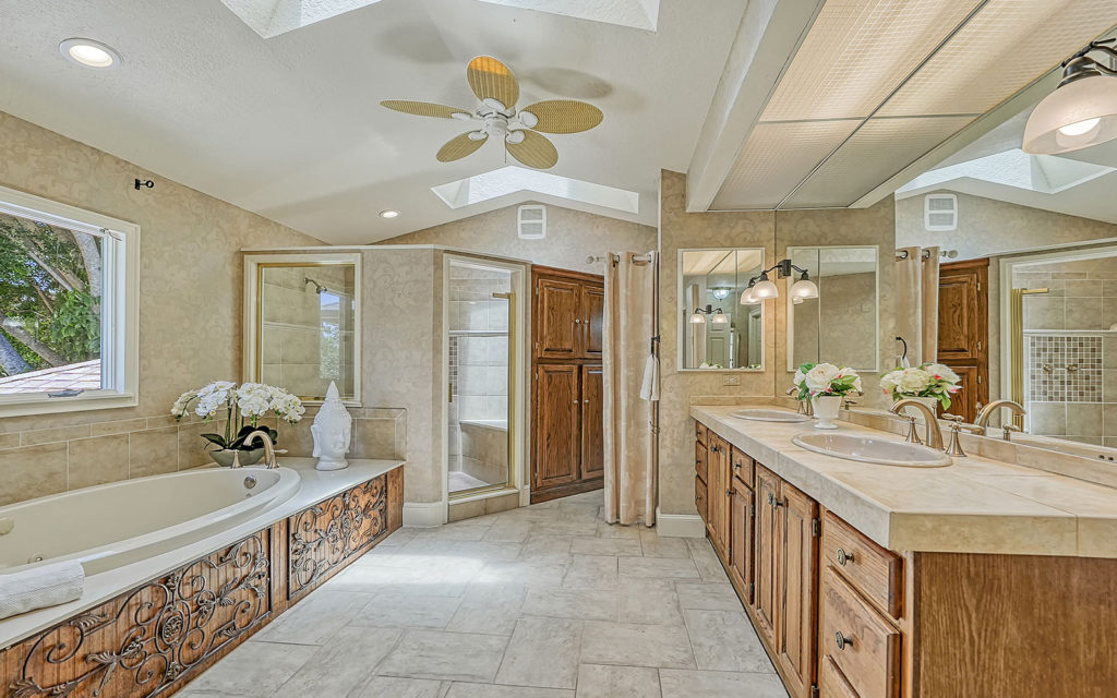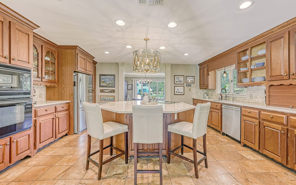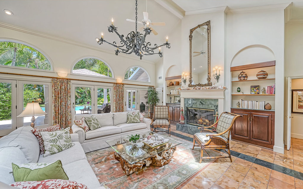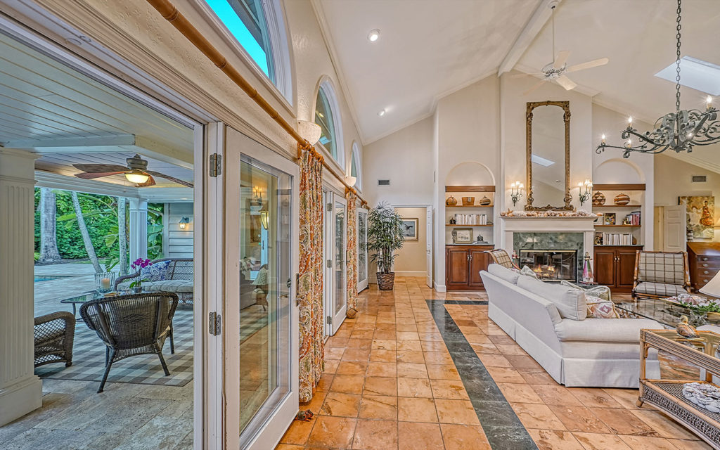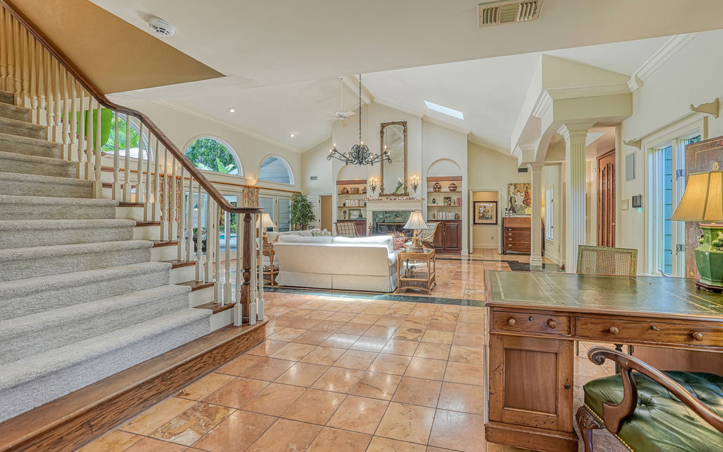 Enter through hand-carved, mahogany front doors into a lofty living room with vaulted ceiling, wood-burning fireplace and wall-to-wall glass doors that lead to the covered patio, gazebo and travertine bedecked swimming pool. The large kitchen with eat-in center island is open to the family room and adjacent to the dining room. The family room opens to the outdoor living space, and the dining room opens to the kitchen through pocket doors which can be left open for family meals or closed for formal dinners. The home’s four bedrooms include an upstairs master retreat with two balconies, as well as a downstairs bedroom wing with a private guest suite and two additional bedrooms. Across the master suite, a solid-wood paneled den/office completes the owner’s retreat. Fine finishes include marble tile flooring, five-inch baseboards, crown moulding, fluted square columns and solid wood cabinetry. Designed for enjoying the outdoors as much as indoors, the home has a covered patio with vaulted-ceiling gazebo and large 14 x 30 pool.