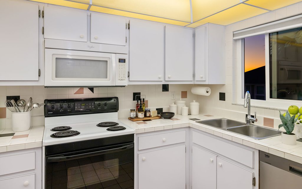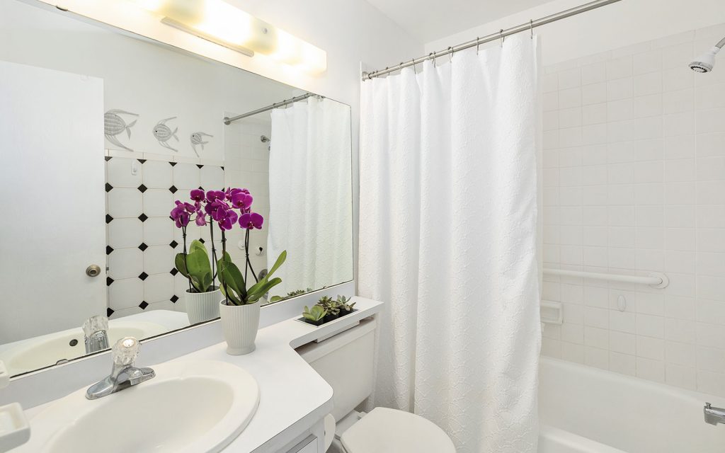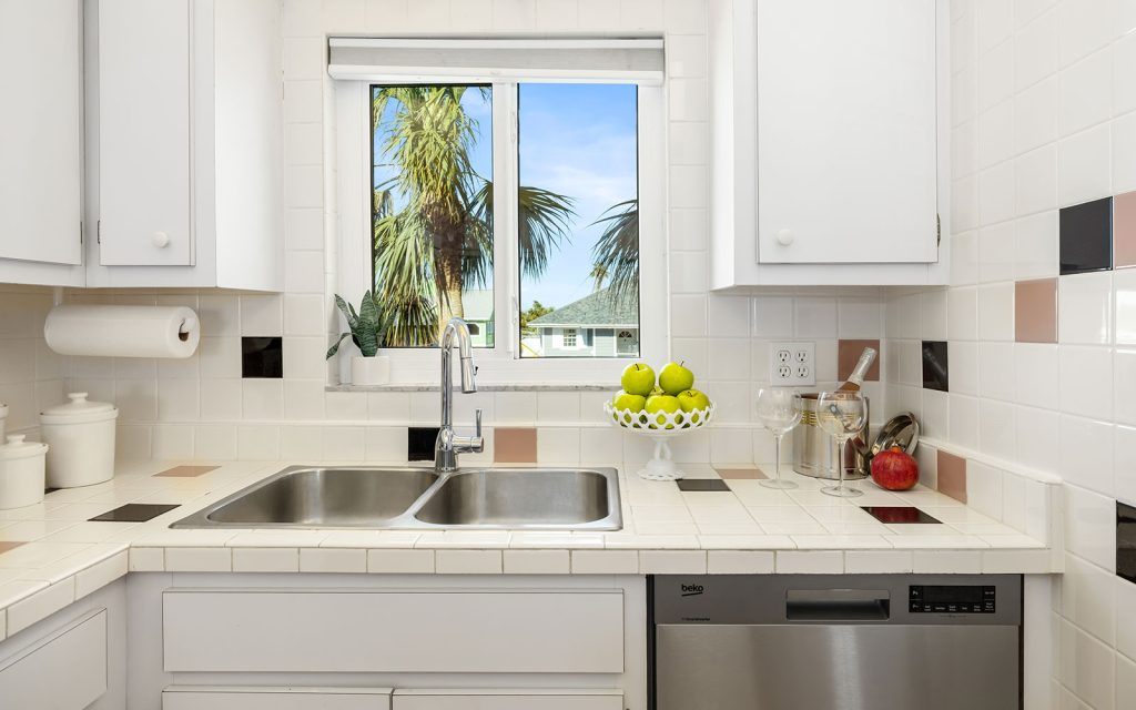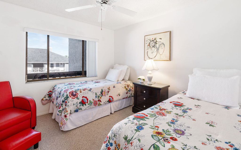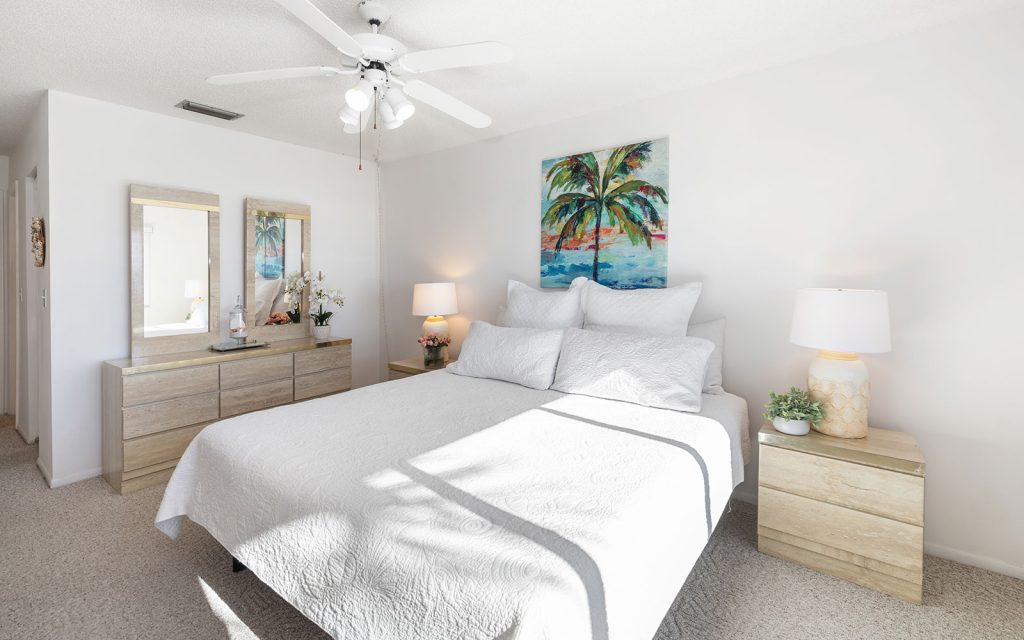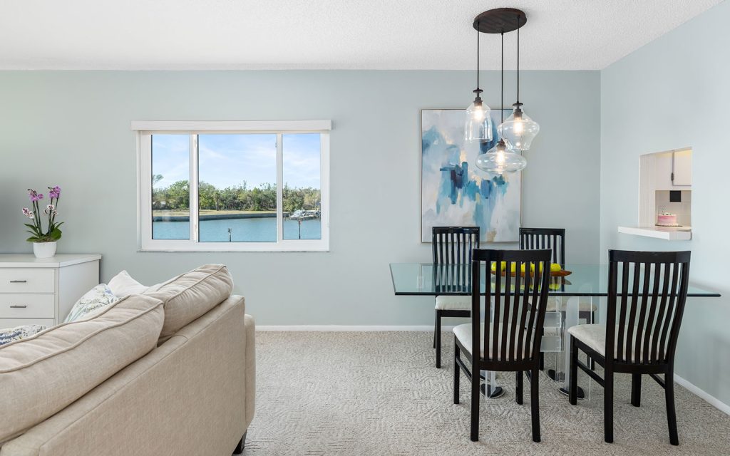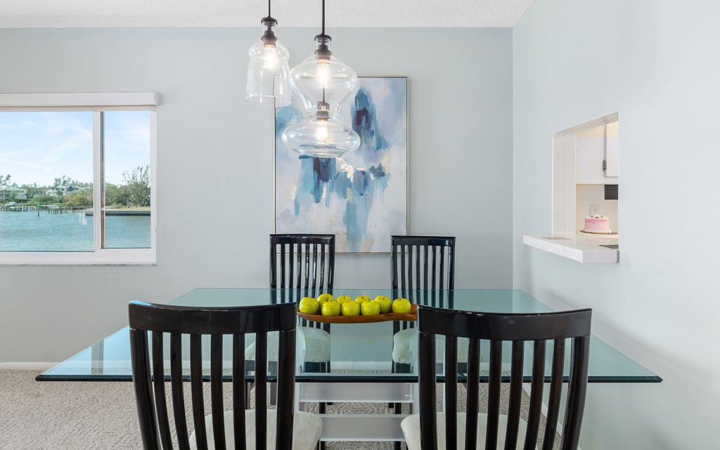 The floorplan features a great room, kitchen, two bedrooms, two baths and a Florida room with fabulous water views. A cool coastal palette complements the beachy ambiance of this sun-and-fun residence.
