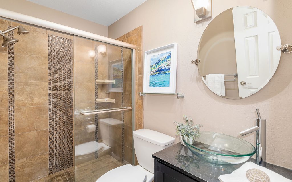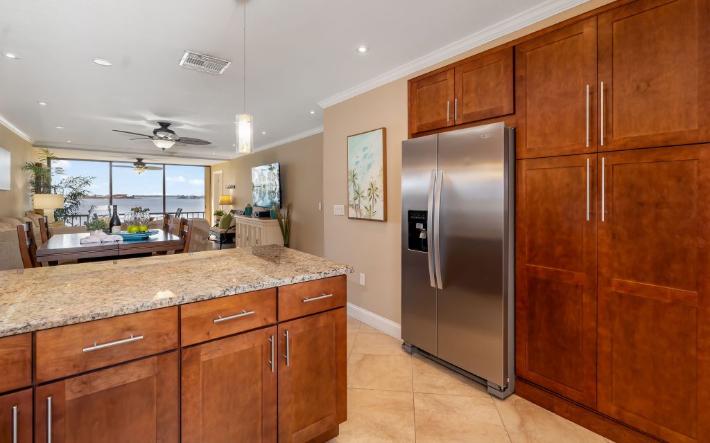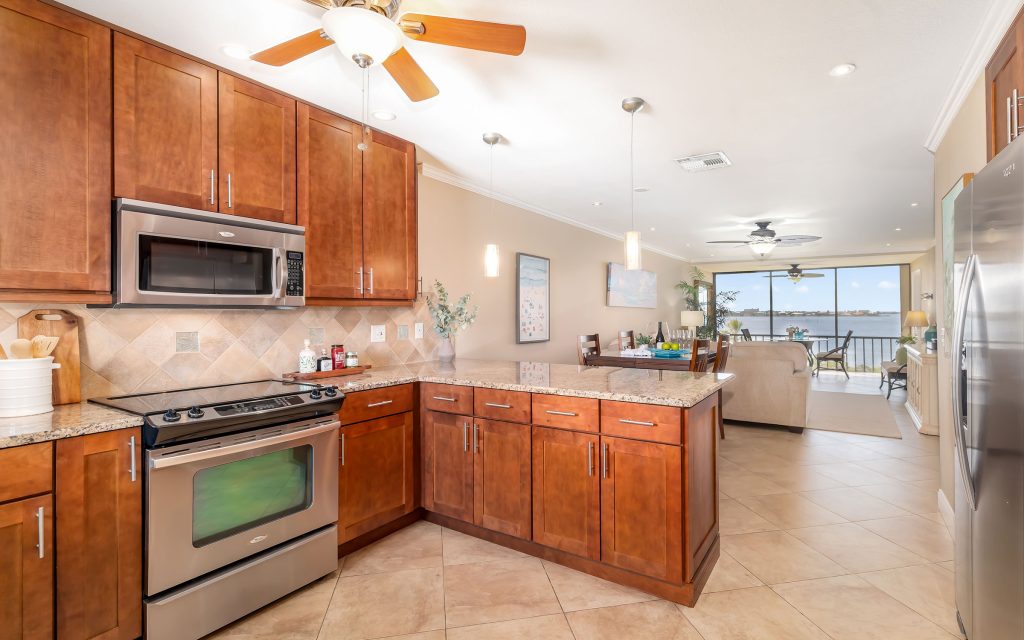 Inside, the residence lives large with an open floor plan that features a light-filled Florida room with wall-to-wall sliders framing the coveted water view. The kitchen has plenty of counter space and features wood cabinetry, granite countertops, stainless steel appliances, and under-cabinet lighting.