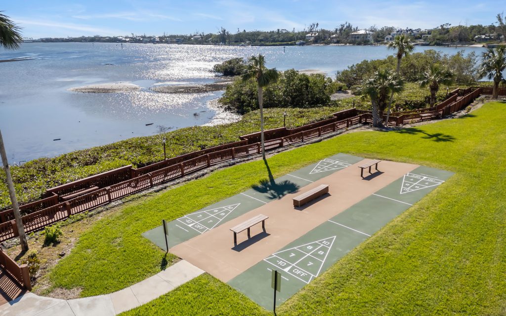 Castel del Mare is a hidden gem that embraces a waterfront lifestyle. Residents enjoy two swimming pools — one overlooking the bay and another tucked into a garden setting — plus a tennis court with pickleball lines, a bayside fishing pier, kayak storage, and a scenic boardwalk that weaves along the water’s edge.