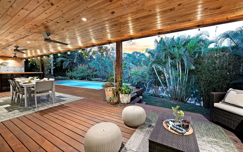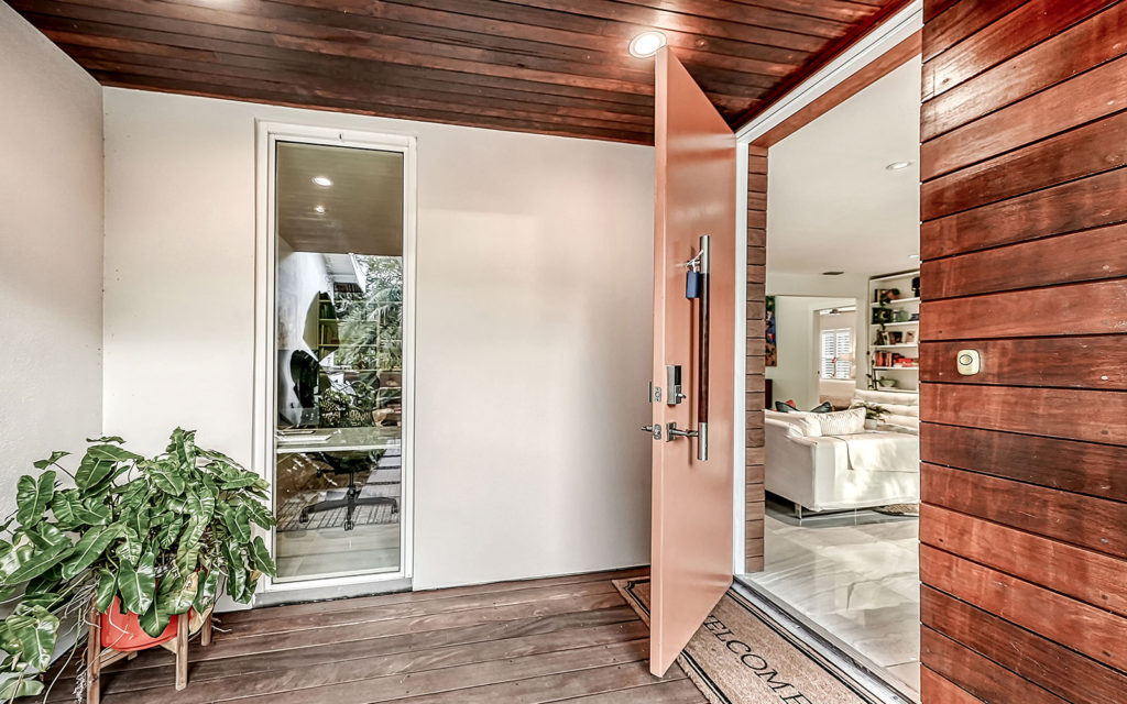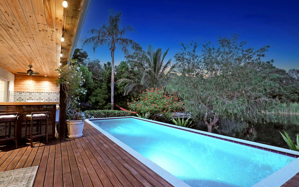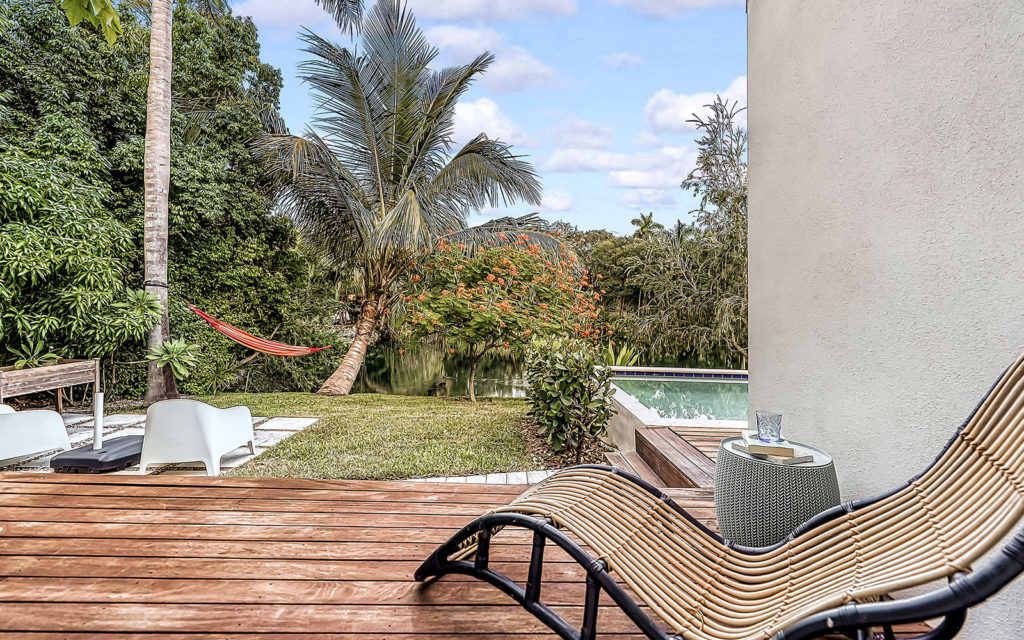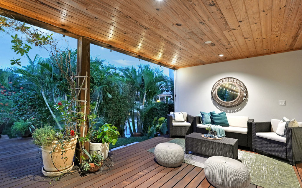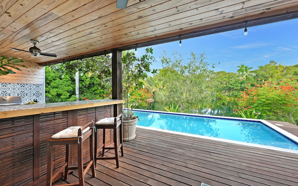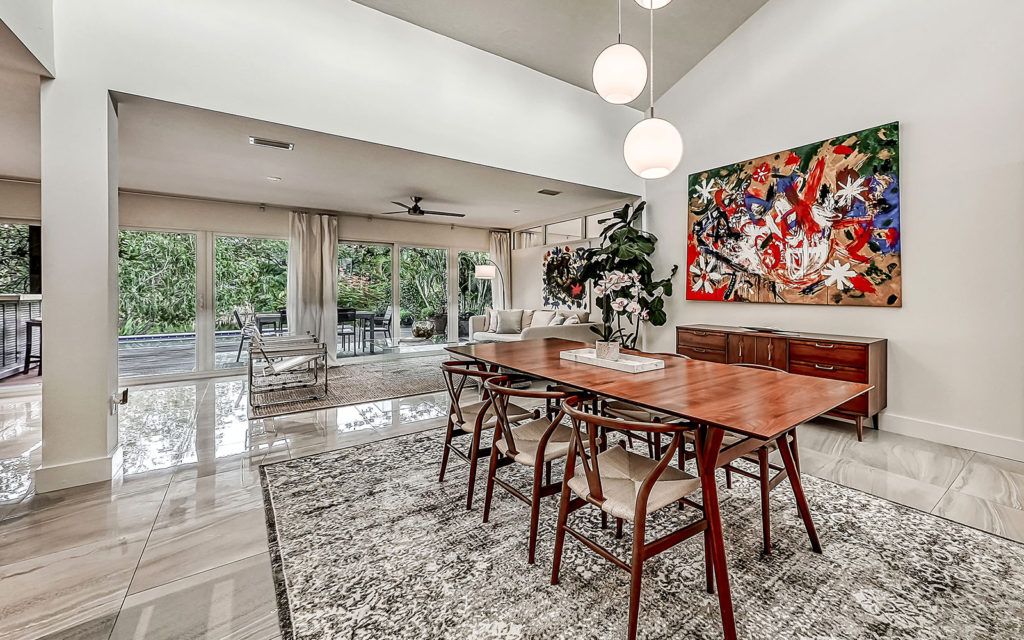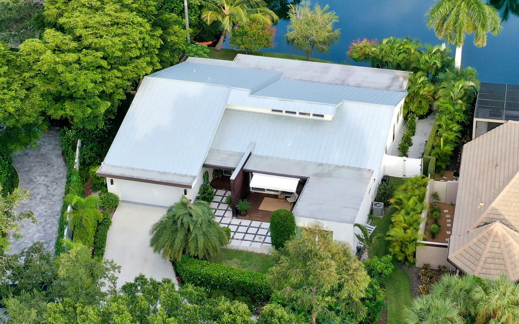 West of Trail lakefront home with end of cul de sac privacy in Oyster Bay Estates. Exquisite expression of mid-century modern infused with a spirit of positivity and delight. Completely renovated in 2015, this rare gem impresses with comprehensive upgrades that include metal roof, low-e impact windows and doors, plumbing, electrical, flooring, interior and exterior doors, all appliances, extensive Ipe-wood decks, pool, two HVAC systems, remodeled kitchen and baths, and tropical landscape design.