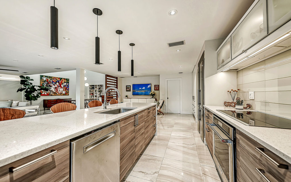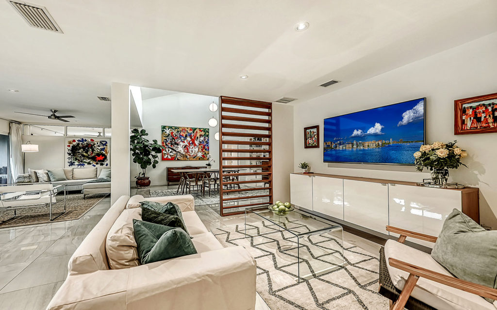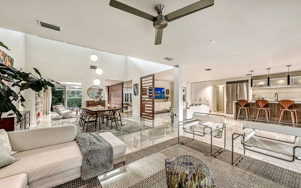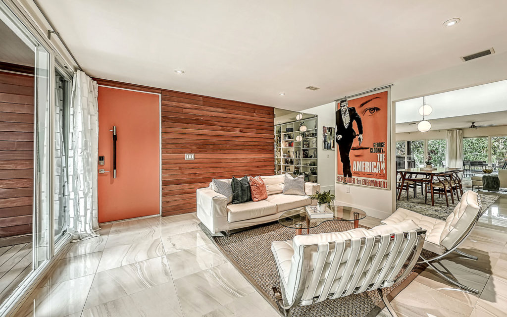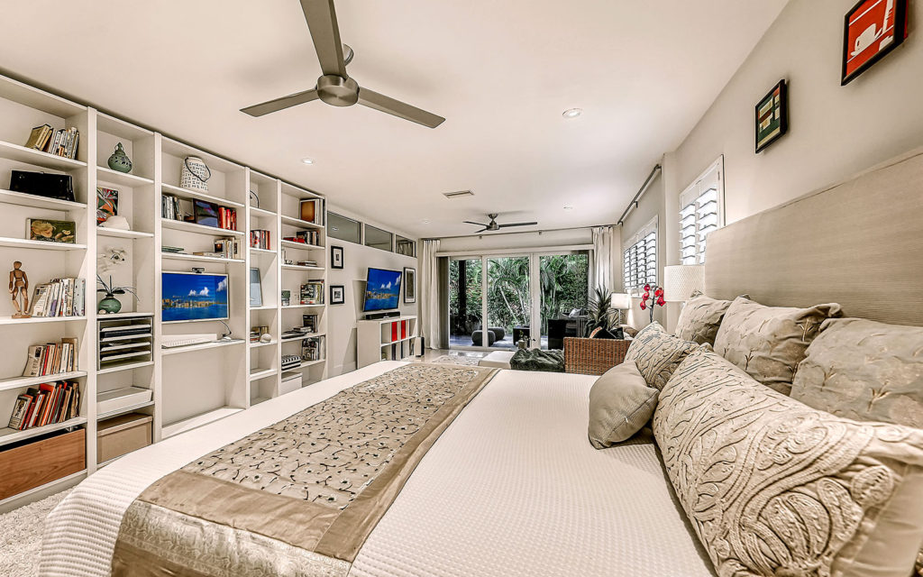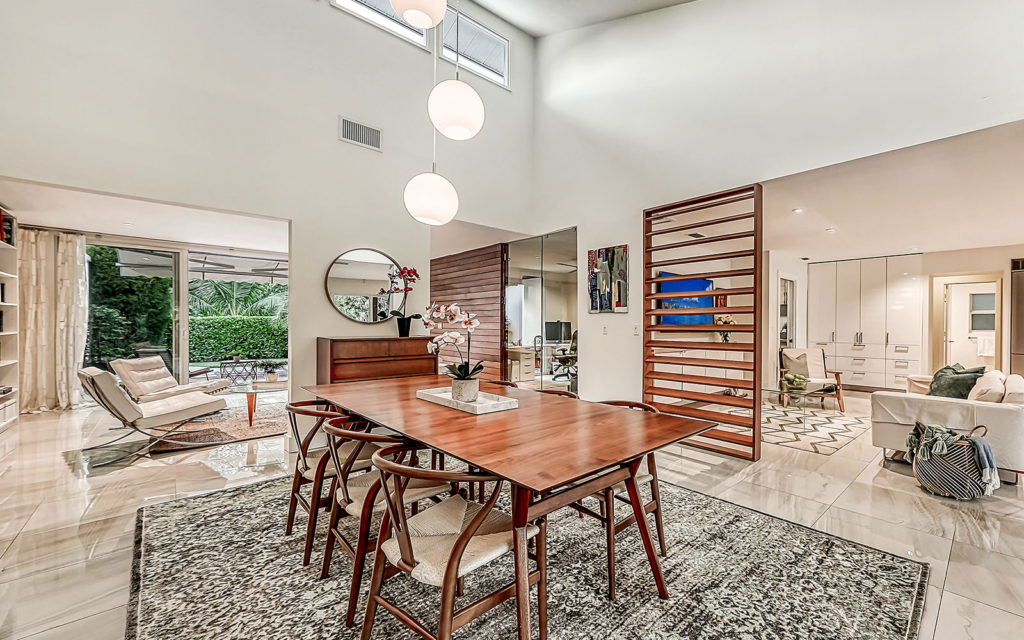 The fluid and light-filled layout features walls of glass and clerestory windows creating a vibrant indoor-outdoor lifestyle. Open living areas include living room, dining room, sitting room, family room and kitchen — each with distinct flair. The dining room has a soaring cathedral ceiling with three dimensional globe pendant lights. A hand-crafted mahogany partition adds texture to the family room. The sitting room’s stained-wood accent wall makes it warm and cozy. The open format of the kitchen keeps things fresh, contemporary and connected. The European cabinetry is fitted out with a combination of wood grain, gloss white and opaque glass fronts. Stainless appliances include a Liebherr 48-inch refrigerator with two 28-inch bottom freezers. Sliding glass doors open to the outdoor kitchen. The massive master bedroom includes a sitting area with sliding glass doors to the covered deck and pool area. A guest suite and two bedrooms sharing a bath complete the private quarters.