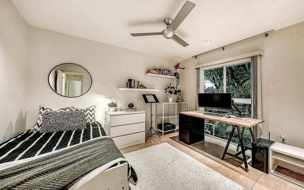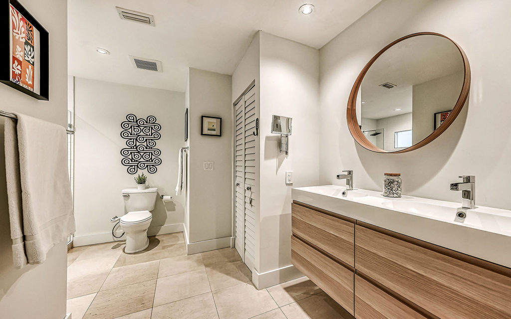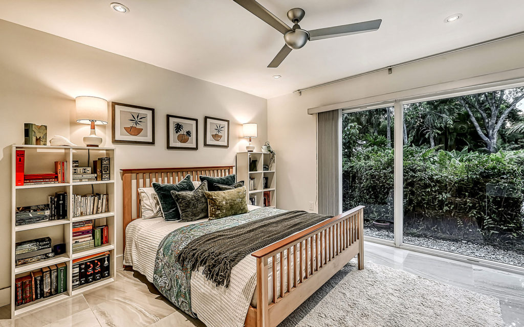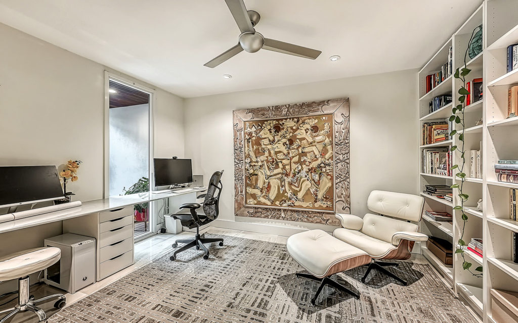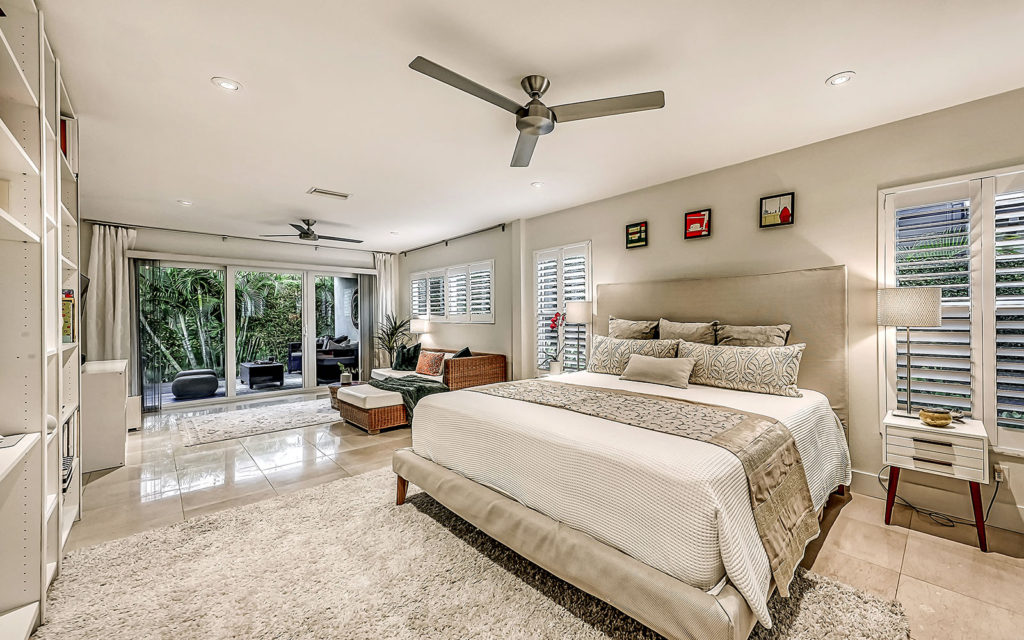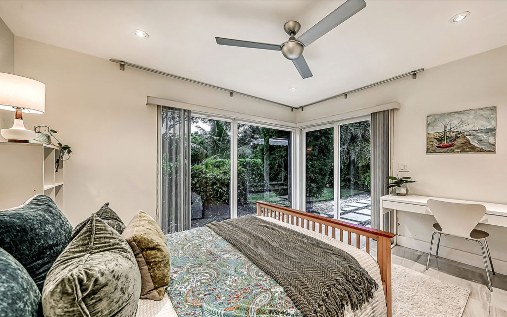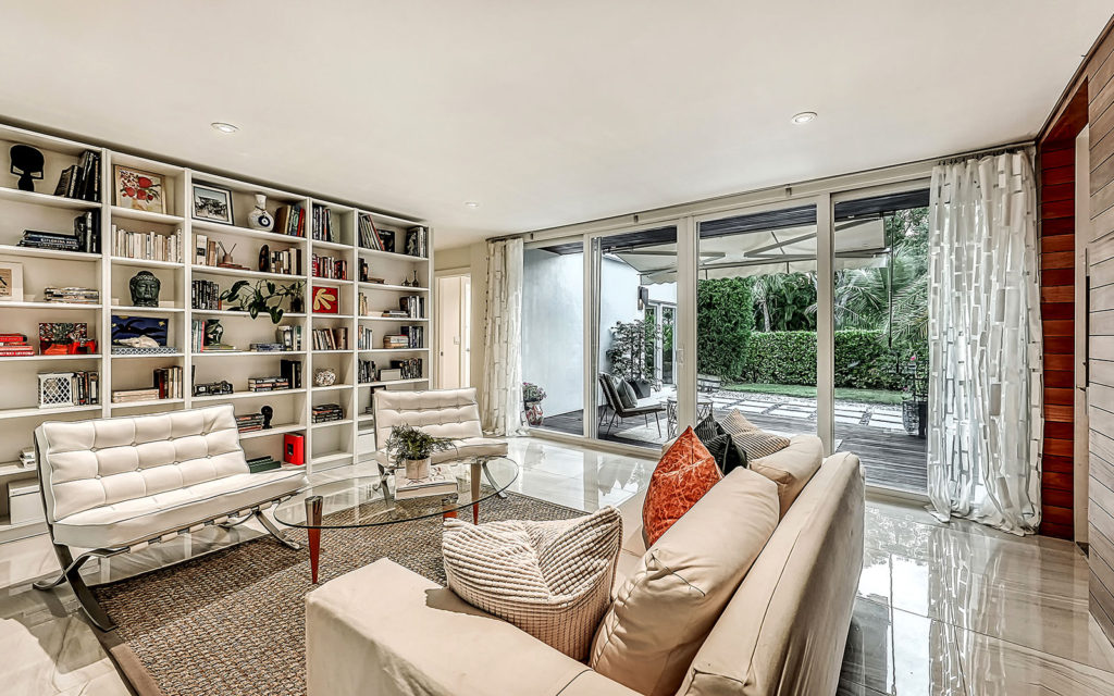 The fluid and light-filled layout features walls of glass and clerestory windows creating a vibrant indoor-outdoor lifestyle. Open living areas include living room, dining room, sitting room, family room and kitchen — each with distinct flair. The dining room has a soaring cathedral ceiling with three dimensional globe pendant lights. A hand-crafted mahogany partition adds texture to the family room. The sitting room’s stained-wood accent wall makes it warm and cozy. The open format of the kitchen keeps things fresh, contemporary and connected. The European cabinetry is fitted out with a combination of wood grain, gloss white and opaque glass fronts. Stainless appliances include a Liebherr 48-inch refrigerator with two 28-inch bottom freezers. Sliding glass doors open to the outdoor kitchen. The massive master bedroom includes a sitting area with sliding glass doors to the covered deck and pool area. A guest suite and two bedrooms sharing a bath complete the private quarters.