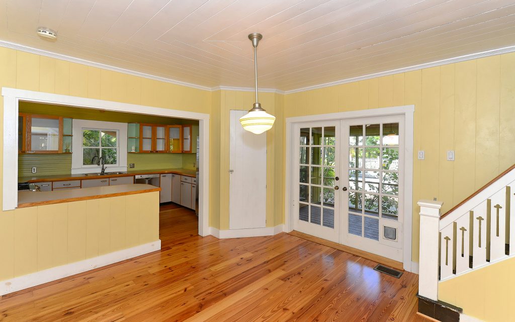 You are welcomed by a bright and expansive front porch which speaks to the rustic style that runs throughout this vintage home. Wide plank wood floors and a brick-front, wood-burning fireplace brings the feeling of country living conveniently close to town. The living room, den/office, staircase and second level all retain the original wood floors, walls and windows. The updated kitchen opens to the living and dining areas. Stainless steel appliances complement the vintage wainscoting and new knotty pine floor. From the dining room, the sturdy, wooden staircase leads to three good-sized bedrooms and two newly-renovated full baths.