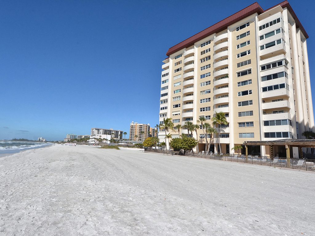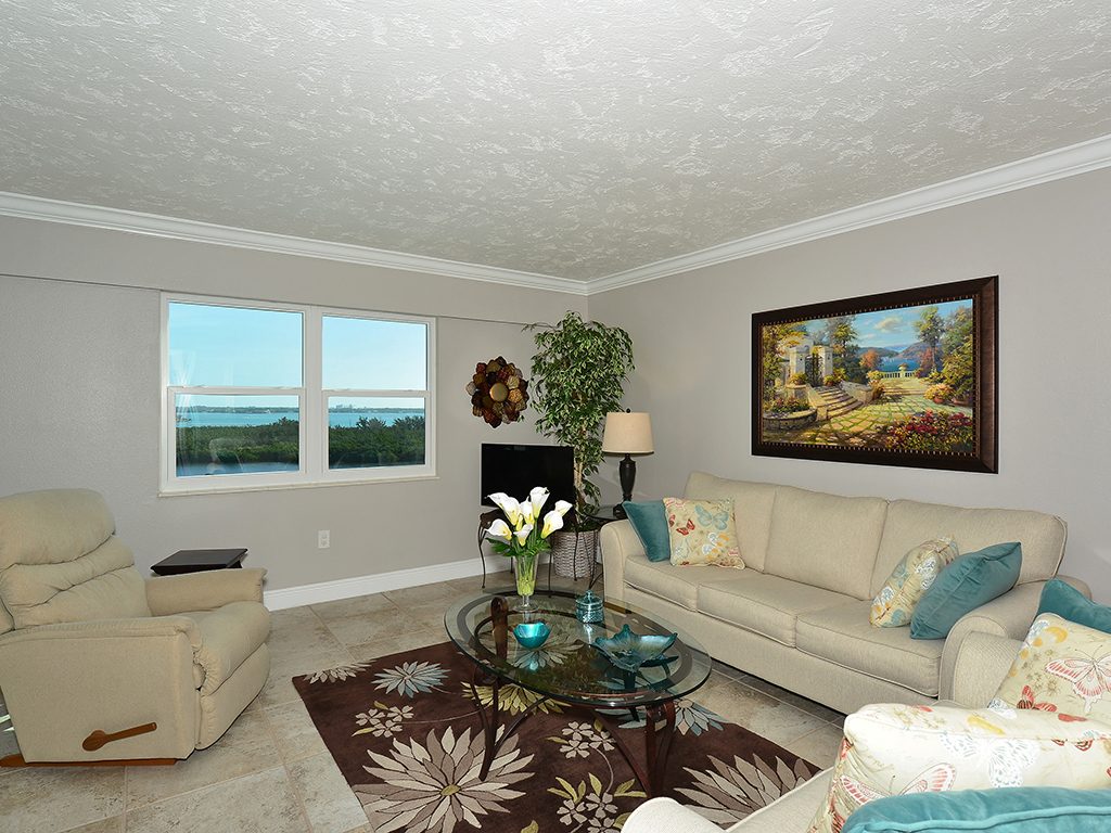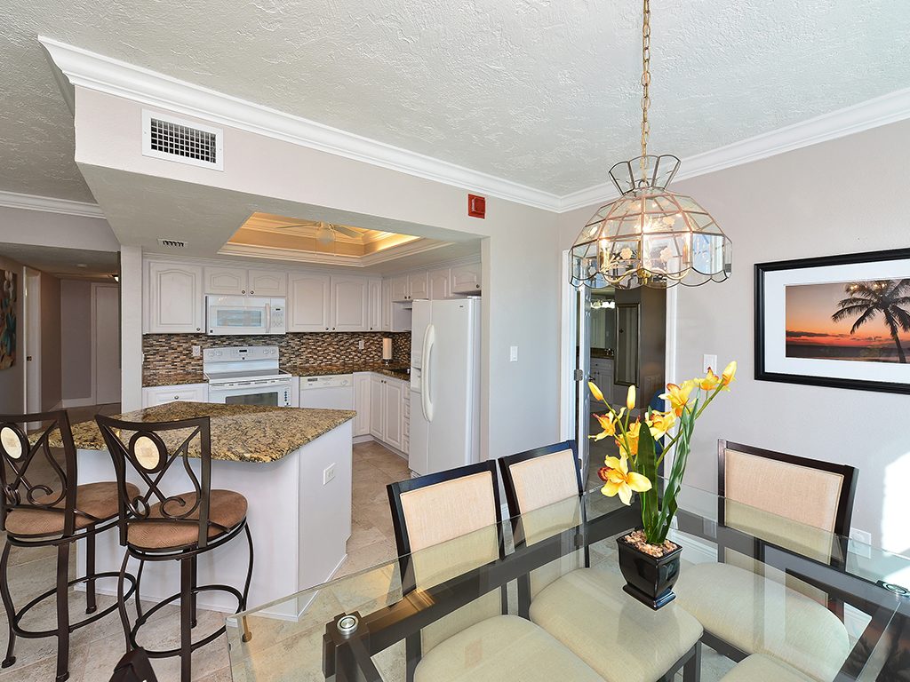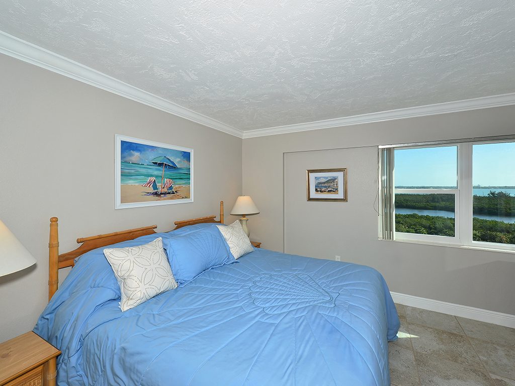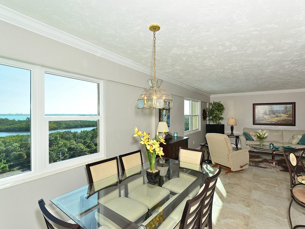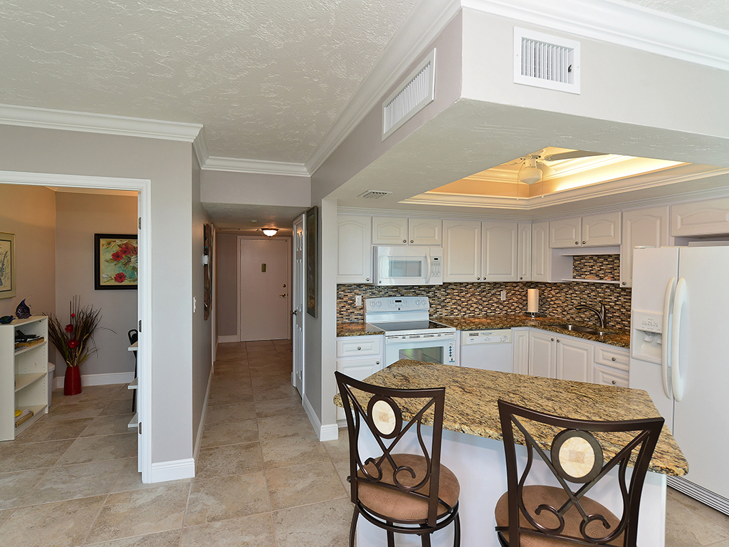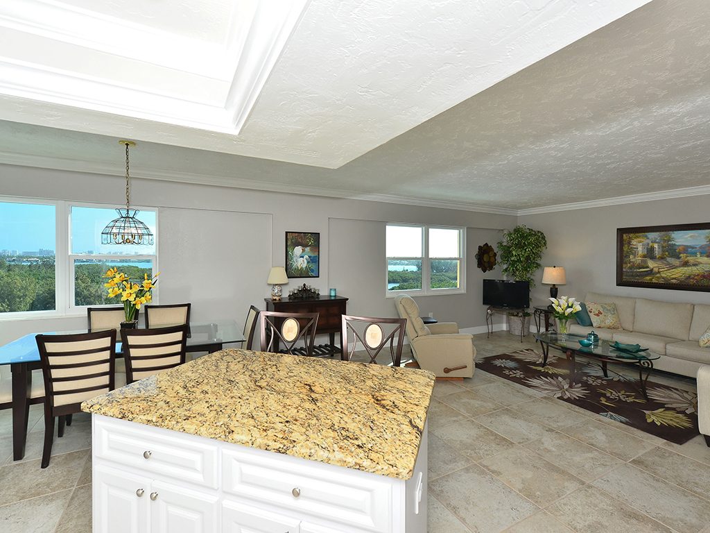 Enjoy the spectacular city and bay views from all living areas and the master bedroom. The night views are amazing. Direct access just minutes from your unit onto Lido Beach and the aquamarine waters of the Gulf of Mexico. Totally gutted and remodeled with high quality finishes. The great room encompasses the living room dining room and kitchen, with an island breakfast area. All floors are ceramic tile, granite countertops in kitchen and bathrooms. Off of the great room is an office alcove, where one can install a Murphy bed. This condo is turnkey furnished, just pack a bag and move in.