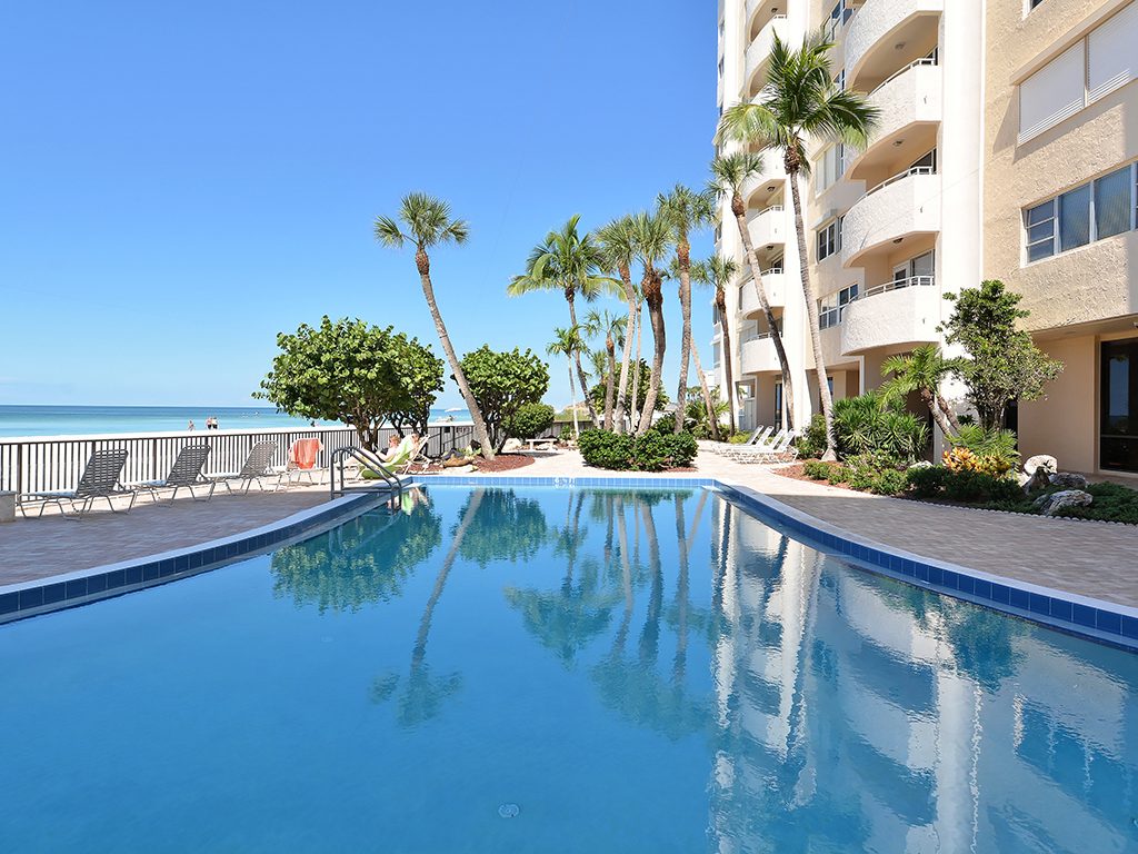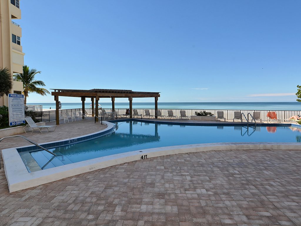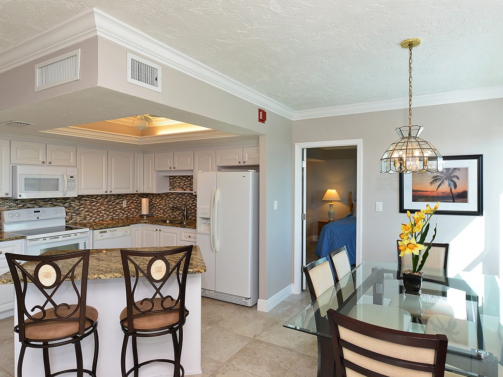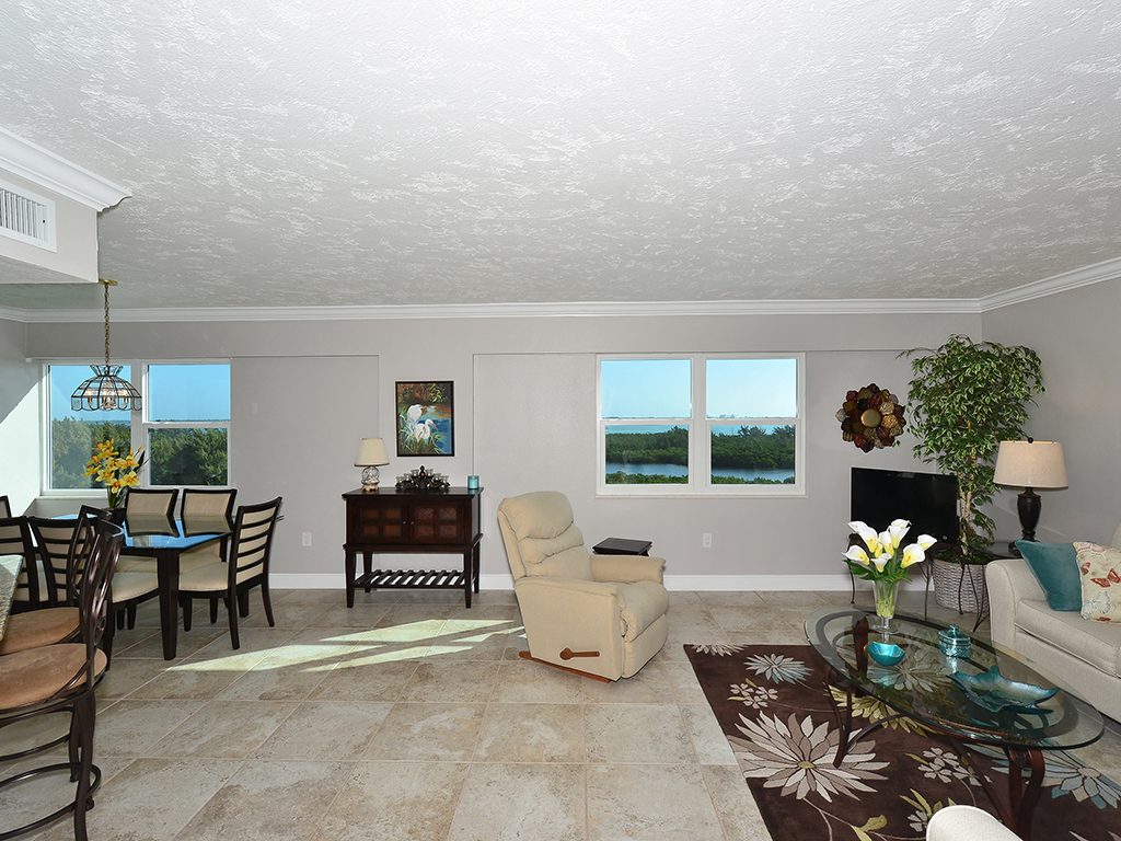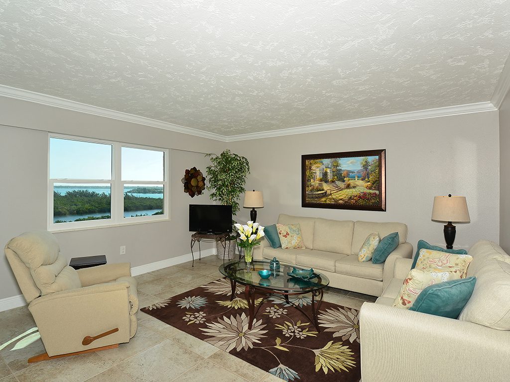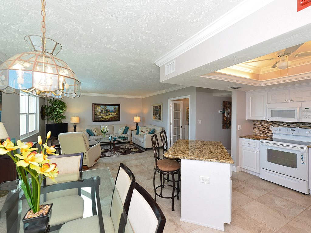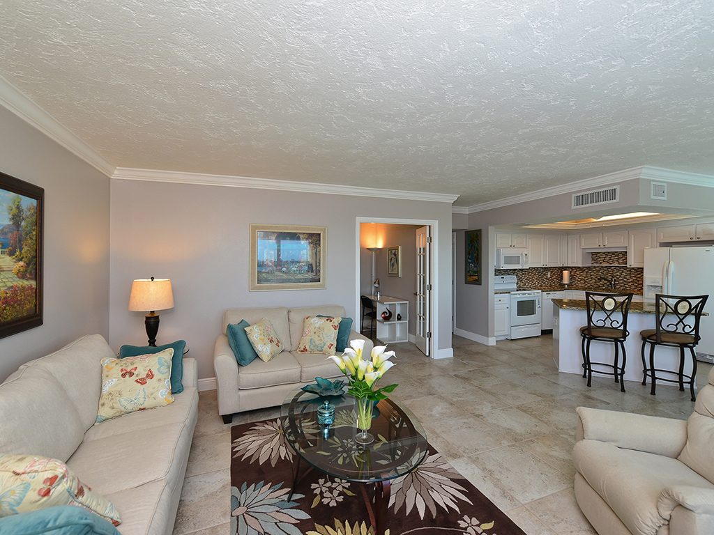 Enjoy the spectacular city and bay views from all living areas and the master bedroom. The night views are amazing. Direct access just minutes from your unit onto Lido Beach and the aquamarine waters of the Gulf of Mexico. Totally gutted and remodeled with high quality finishes. The great room encompasses the living room dining room and kitchen, with an island breakfast area. All floors are ceramic tile, granite countertops in kitchen and bathrooms. Off of the great room is an office alcove, where one can install a Murphy bed. This condo is turnkey furnished, just pack a bag and move in.