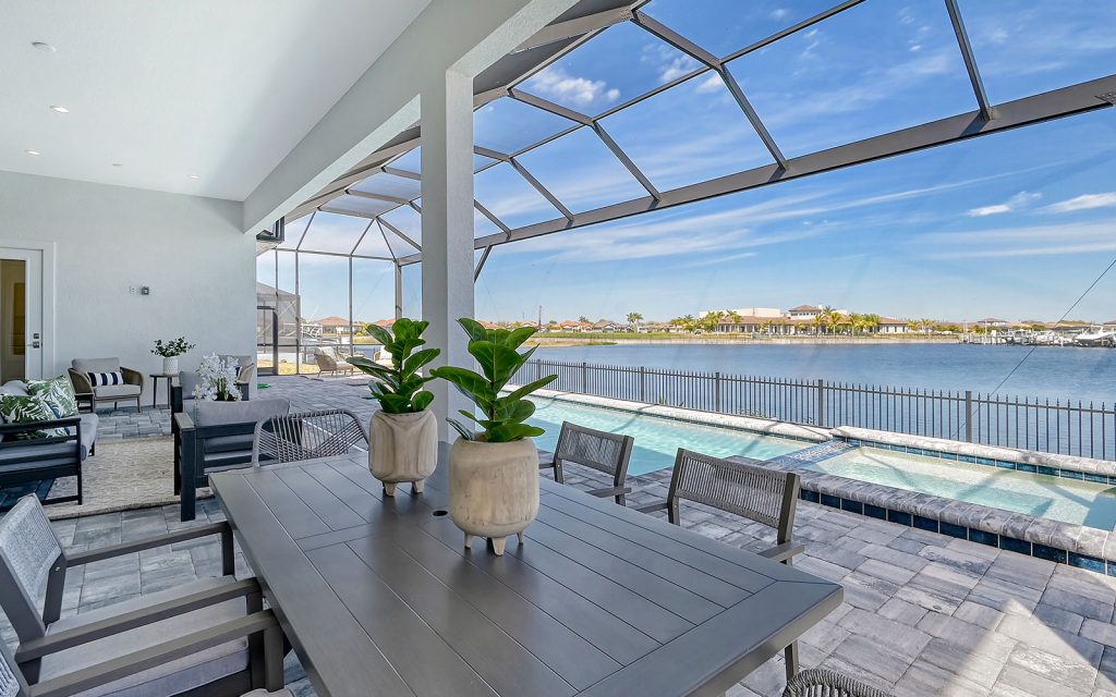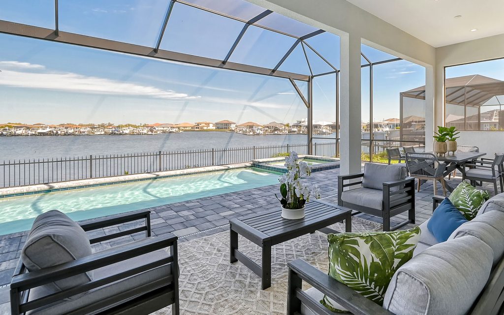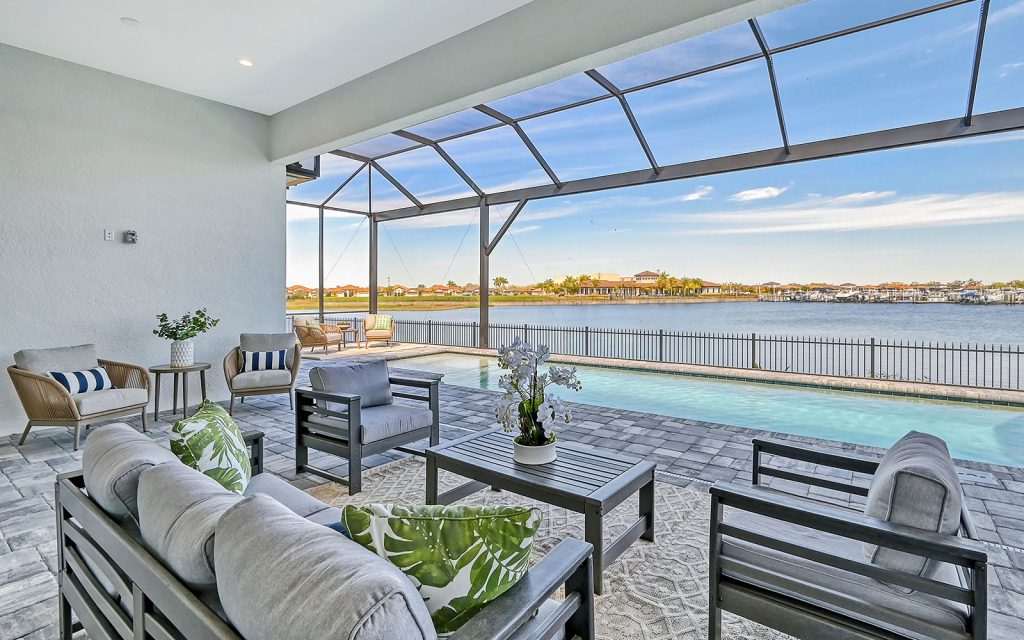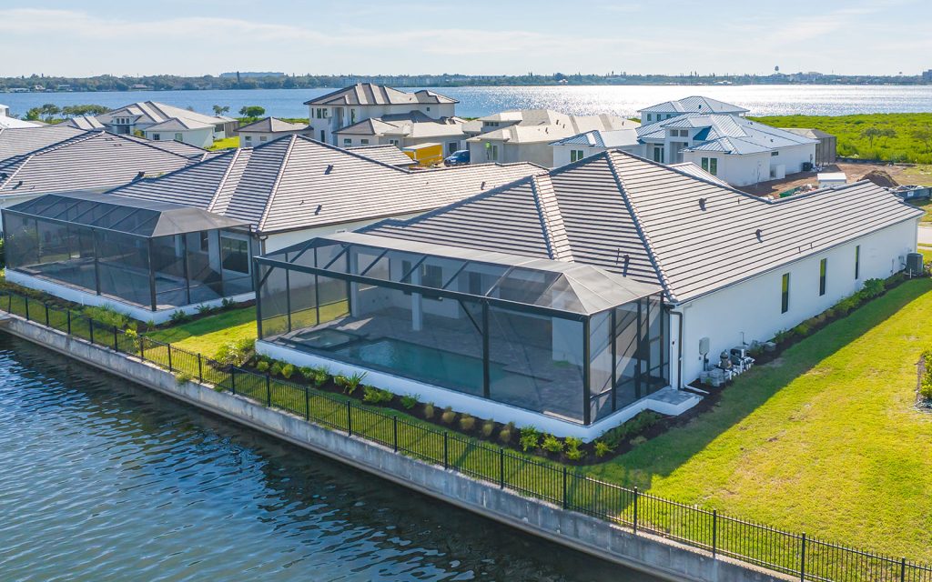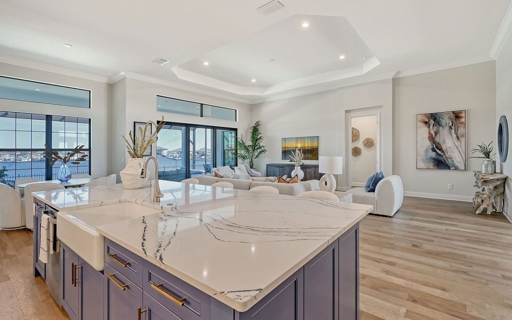 Built by Neal Signature Homes, quality features include concrete block construction, energy-efficient hurricane windows throughout, energy-saving components, wireless security system, home automation starter kit, solid-wood cabinetry with soft-close drawers, Cambria quartz countertops, solid-core doors, high ceilings, tankless water heater, hickory wood flooring, frameless pool screen, heated pool/spa and three-car garage. Designer finishes and cool coastal colors create the perfect combination for luxurious waterfront living. The home’s 3,209 sq. ft. include an open living area surrounded by four bedrooms, three baths and a home office. The spacious 260-sq. ft. kitchen has a large eat-in island, stainless appliances, oversize apron sink and walk-in pantry. Dock and boat lift are allowed on the private harbor in your backyard where a community boat lift swiftly transfers your boat from the harbor to the Manatee River.