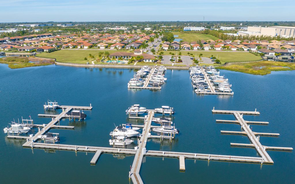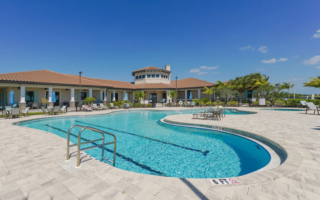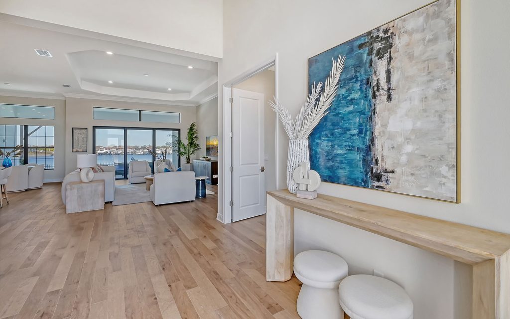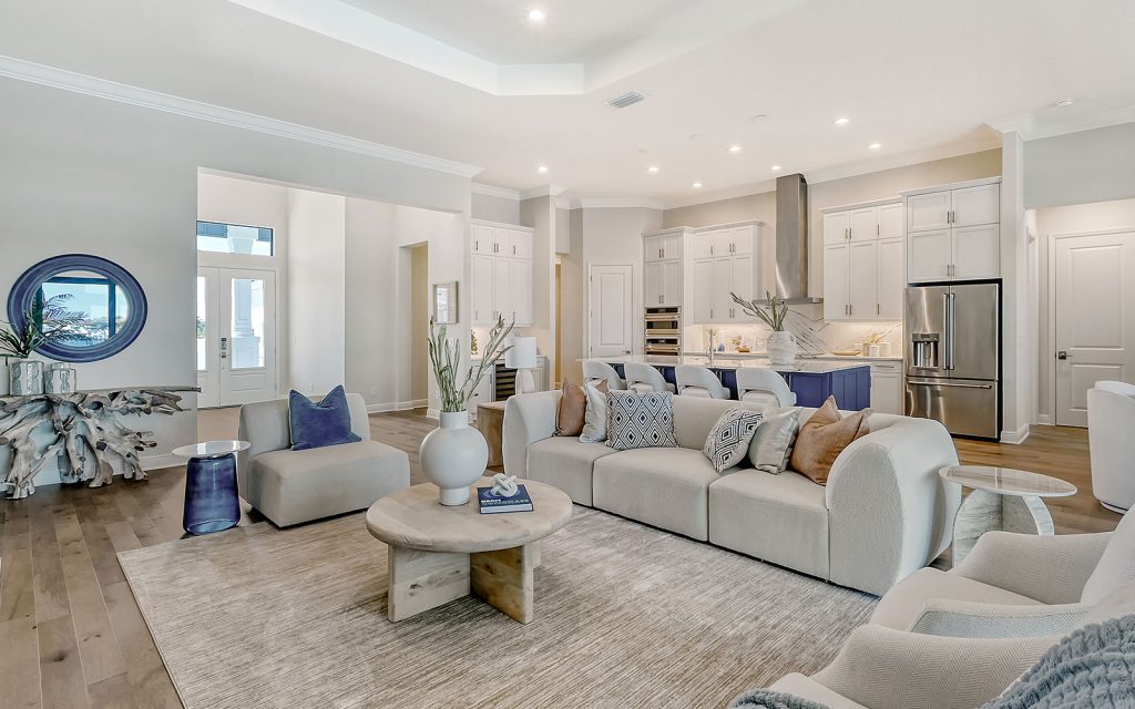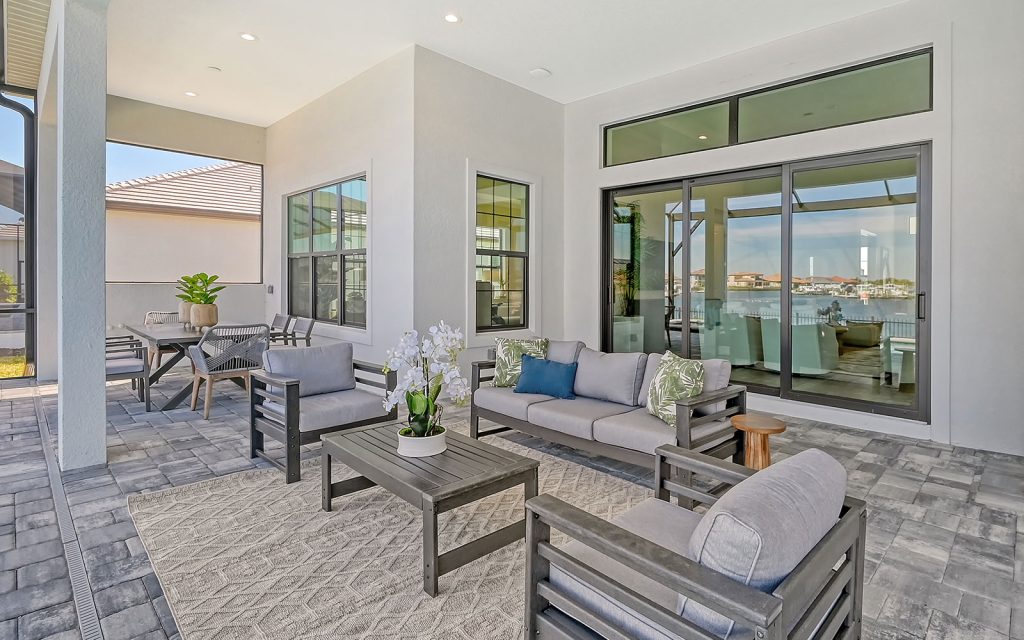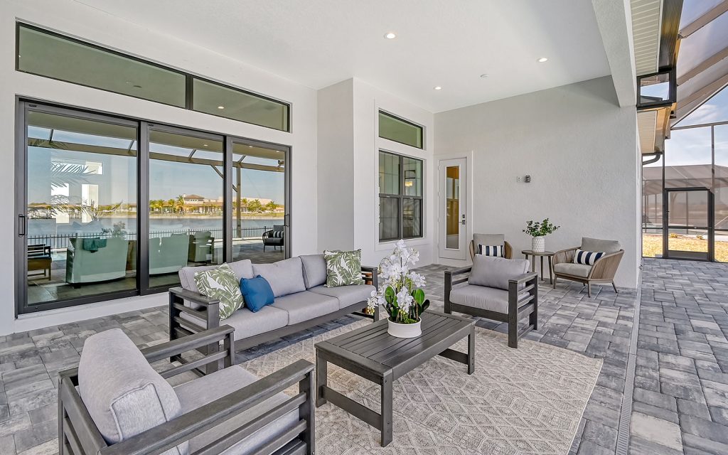 Built by Neal Signature Homes, quality features include concrete block construction, energy-efficient hurricane windows throughout, energy-saving components, wireless security system, home automation starter kit, solid-wood cabinetry with soft-close drawers, Cambria quartz countertops, solid-core doors, high ceilings, tankless water heater, hickory wood flooring, frameless pool screen, heated pool/spa and three-car garage. Designer finishes and cool coastal colors create the perfect combination for luxurious waterfront living. The home’s 3,209 sq. ft. include an open living area surrounded by four bedrooms, three baths and a home office. The spacious 260-sq. ft. kitchen has a large eat-in island, stainless appliances, oversize apron sink and walk-in pantry. Dock and boat lift are allowed on the private harbor in your backyard where a community boat lift swiftly transfers your boat from the harbor to the Manatee River.