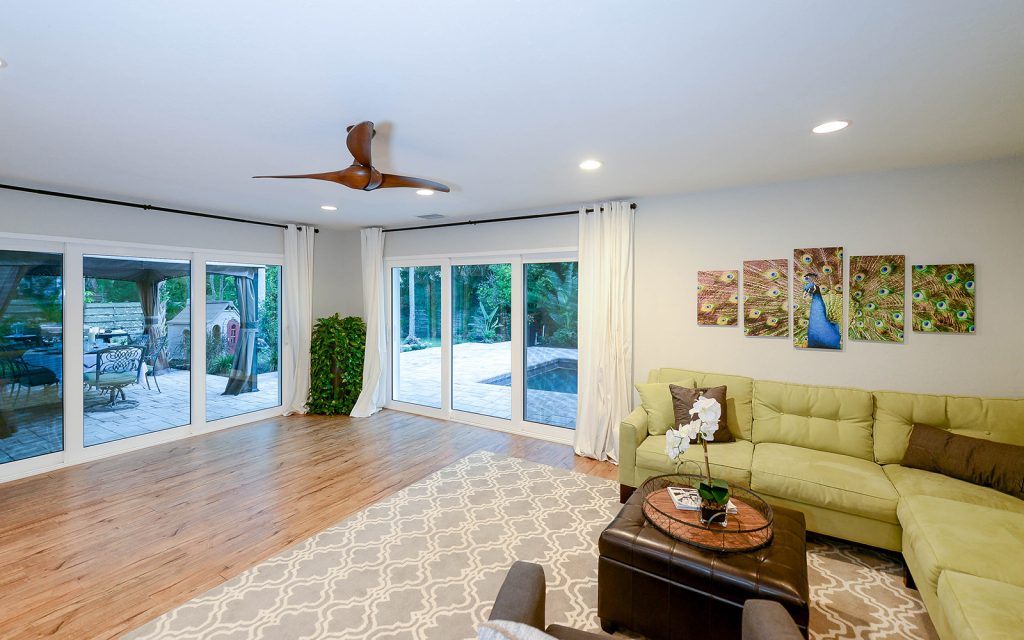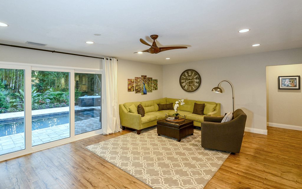 The remodeled kitchen has solid wood cabinets, granite/quartz countertops, eat-in counter and stainless steel appliances. It is open to both the family room and living/dining room. The 22 x 16 family room is light and bright with 2 impact-glass sliding doors — one to the open patio and one to the pool deck. And the 36 x 16 living/dining room with sitting alcove extension has plenty of space for gracious entertaining. All living areas have luxury vinyl plank flooring gently laid over ebony-stained maple floor.