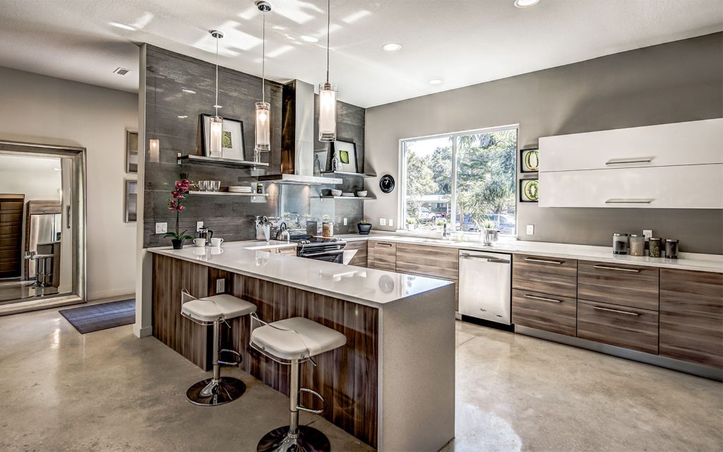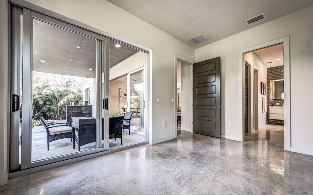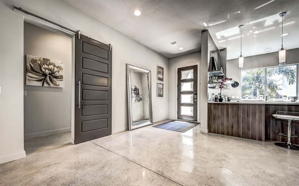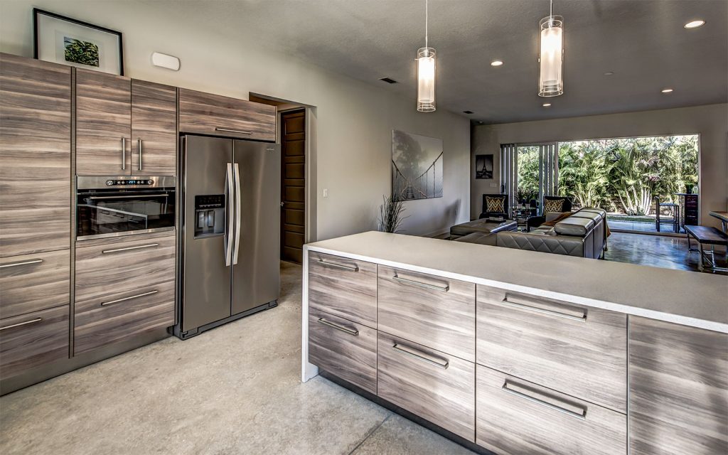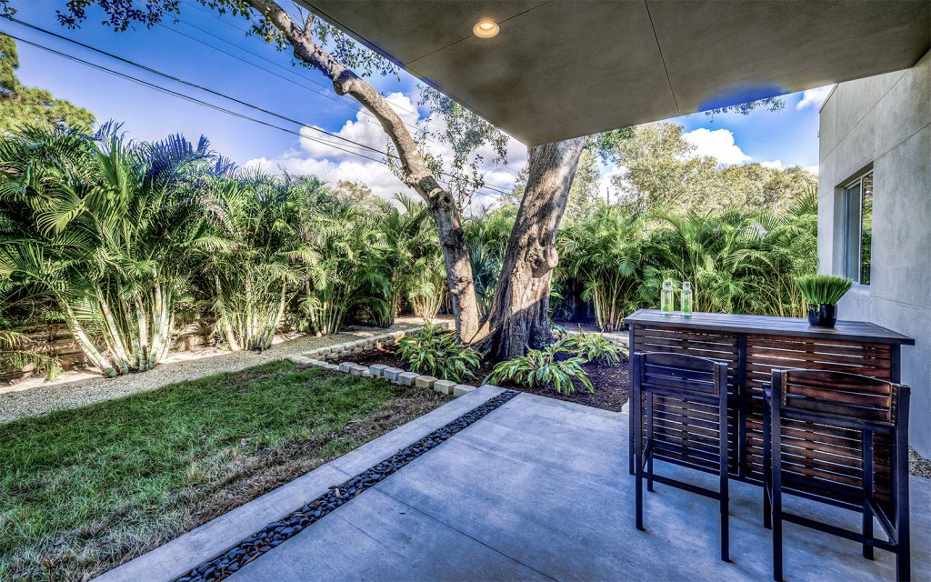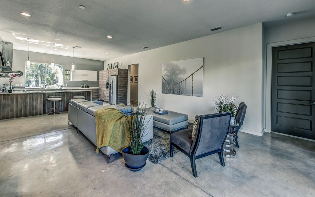 Stained polished concrete floors throughout the home bring together all the modern craftsmanship throughout this light and spacious residence. A well-appointed split floor plan with expansive great room and dining room. The superb kitchen features custom European cabinets, stainless steel appliance package, solid white quartz countertops with waterfall edge, and a range wall with oversized stainless range hood featuring open cabinetry and dazzling tile backing. The great room features sliding glass doors into the ample covered lanai and private, lushly-landscaped backyard with areca palms bordering the property for privacy.