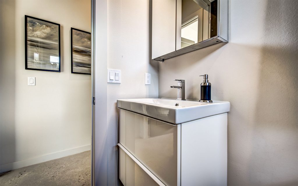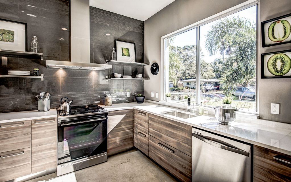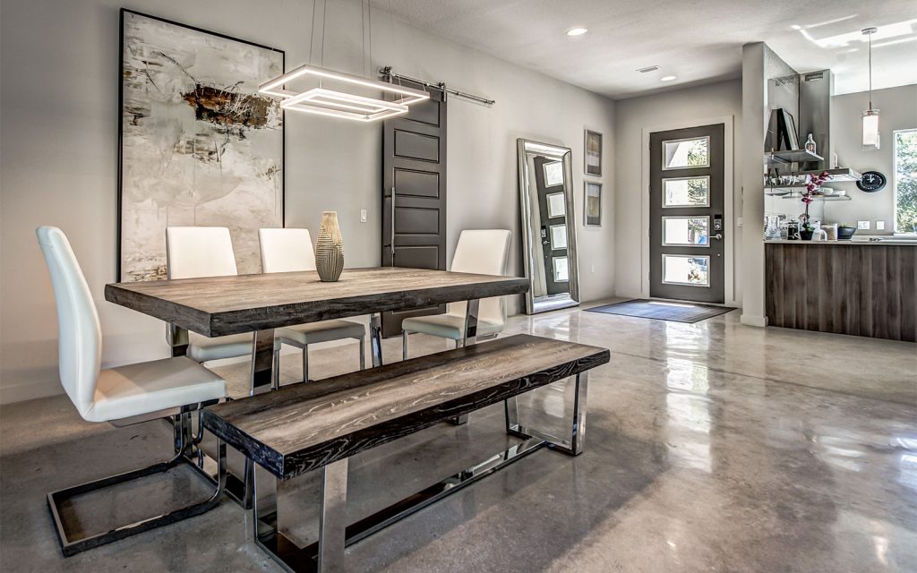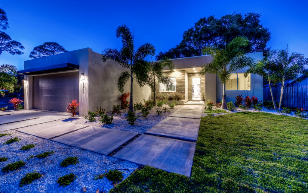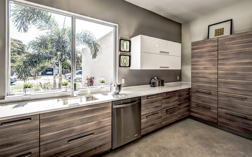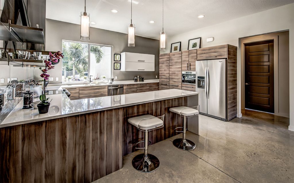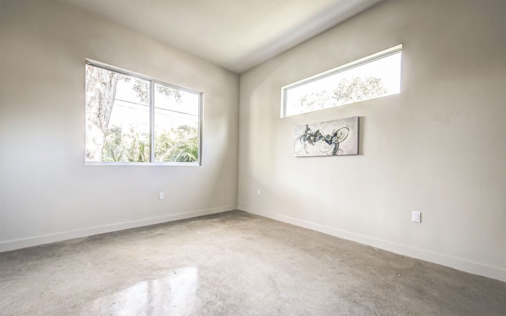 Stained polished concrete floors throughout the home bring together all the modern craftsmanship throughout this light and spacious residence. A well-appointed split floor plan with expansive great room and dining room. The superb kitchen features custom European cabinets, stainless steel appliance package, solid white quartz countertops with waterfall edge, and a range wall with oversized stainless range hood featuring open cabinetry and dazzling tile backing. The great room features sliding glass doors into the ample covered lanai and private, lushly-landscaped backyard with areca palms bordering the property for privacy.