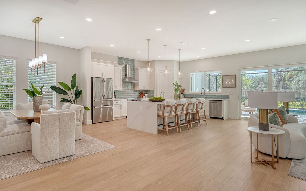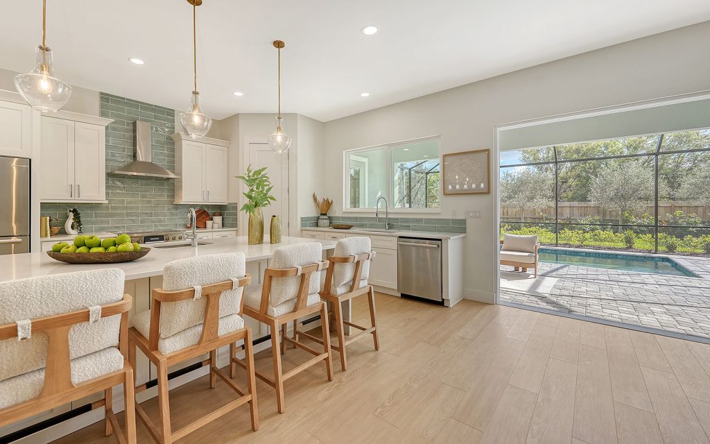 Light, airy and blissfully serene, this 3,352 sq. ft. residence reflects a coastal vibe co-mingled with urban chic. Large windows and high ceilings allow natural light to illuminate the open floor plan where common areas are connected for easy living. Quality construction includes concrete block first-floor, standing-seam metal roof, wide-plank luxury vinyl flooring, impact glass windows and sliding glass doors, solid-wood cabinets with soft-close mechanism, 8-ft. solid-core interior doors, and screened-in outdoor kitchen, lanai and swimming pool. Luxury appointments include quartz countertops, kitchen island with waterfall detail, Bosch kitchen appliances, contemporary lighting, and laundry on each floor. Private areas include four bedrooms, three full baths and two half baths. The primary suite on the first floor has a spacious bedroom, oversize walk-in closet with his and her sections, laundry alcove, and ensuite bath. Three additional bedrooms are on the second floor, along with two baths, loft and laundry closet. A home office is on the first floor.