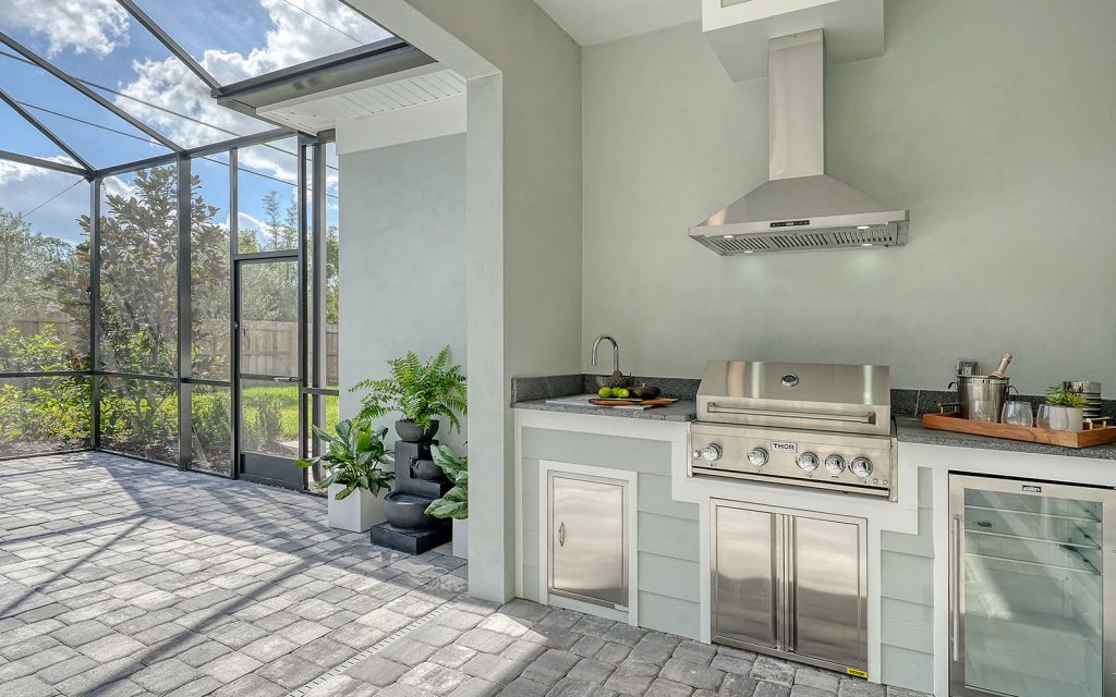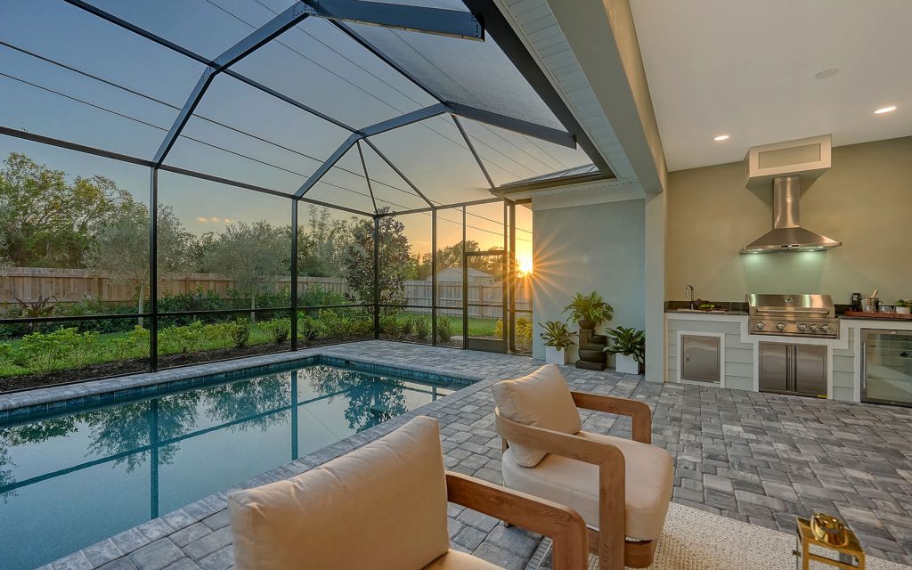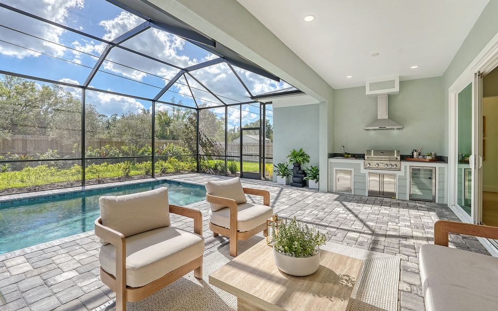 This home loves the outdoors, too. Sliding glass doors lead to a large covered lanai featuring an outdoor kitchen with built-in grill, chimney vent, stainless sink and under-counter refrigerator. This entire area is screened-in along with the swimming pool. The backyard is surrounded by easy-care landscape, and a privacy fence with gate access to the Legacy Trail.