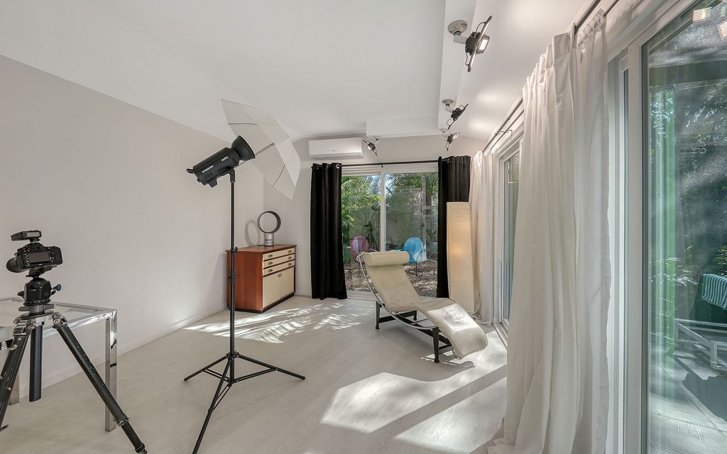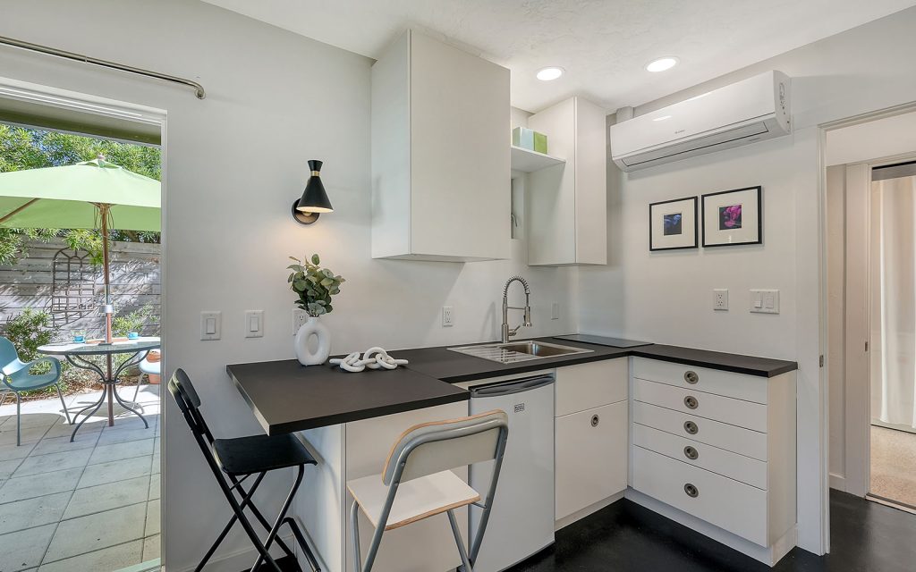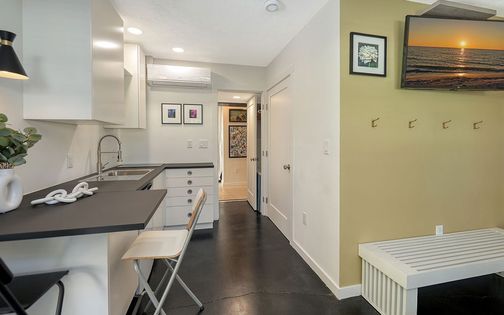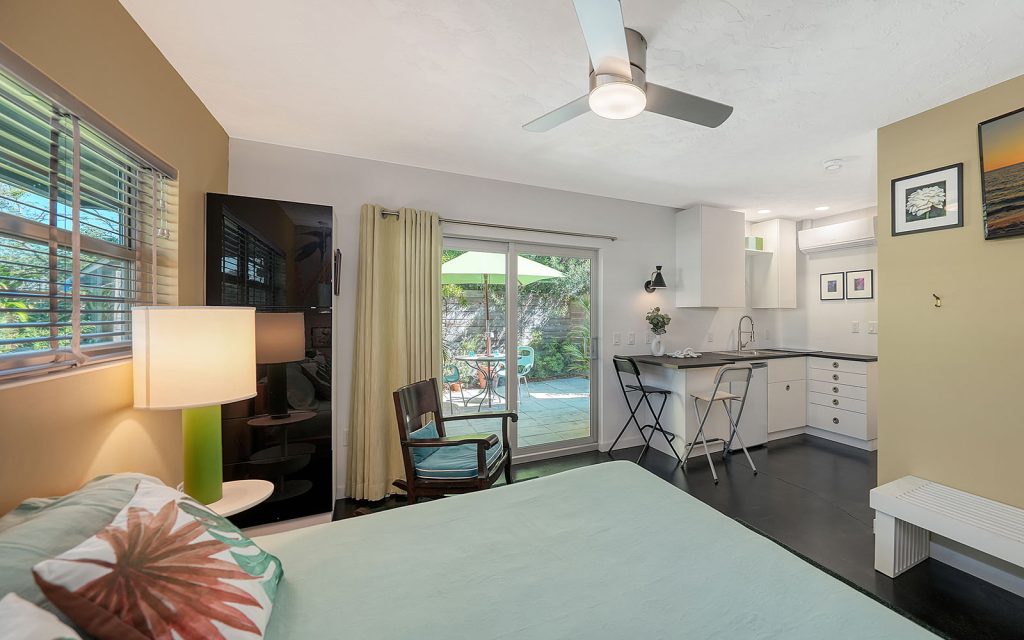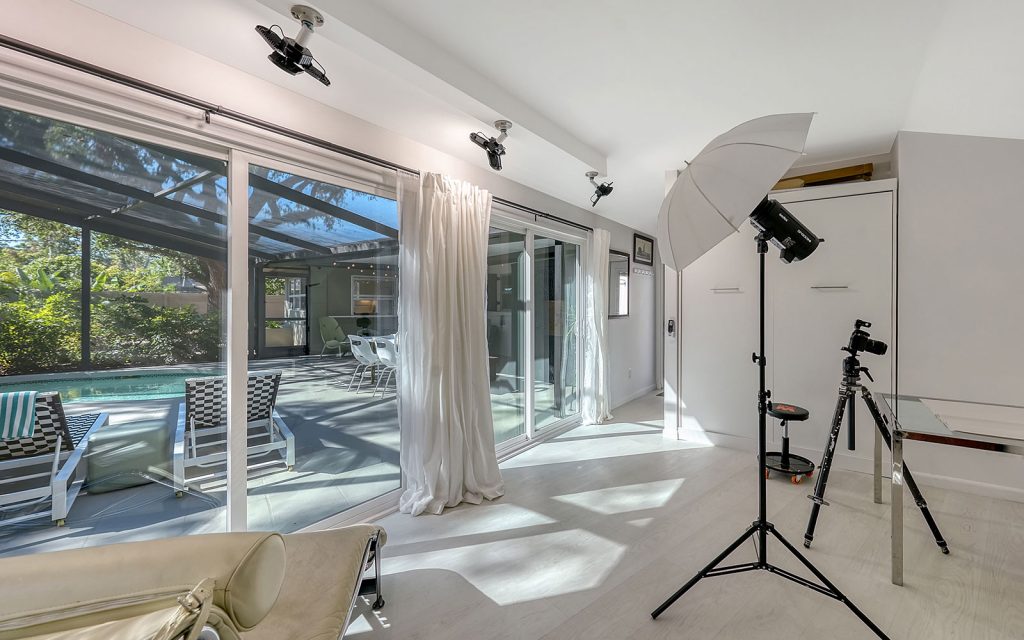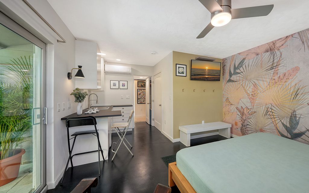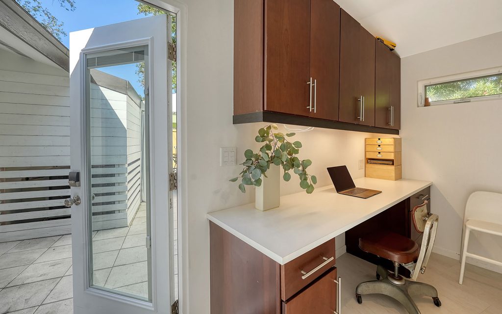Step inside to a cozy living room that flows into a kitchen fitted with wrap-around windows, a spacious center island and high-end appliances. Glass barn doors provide flexible access to the separate dining room and family room. The two main bedrooms and bath are on one side of the living area. On the other side is an in-law suite with separate entry, kitchenette, and sliding glass doors to a private courtyard and enclosed outdoor shower. A detached studio has a built-in desk area and open studio space with Murphy bed which offers additional flexibility for guests or a home office. Outside, a spacious covered lanai overlooks the screened-in pool, ideal for relaxation and entertaining. The fenced yard is thoughtfully landscaped with mature oak trees and landscape lighting for an enchanting evening ambiance.