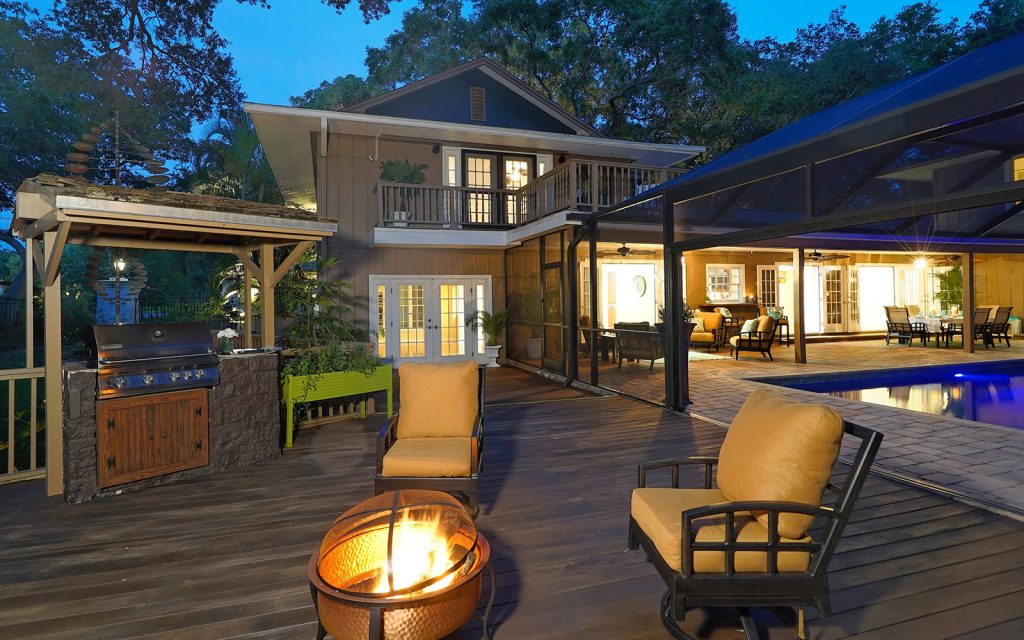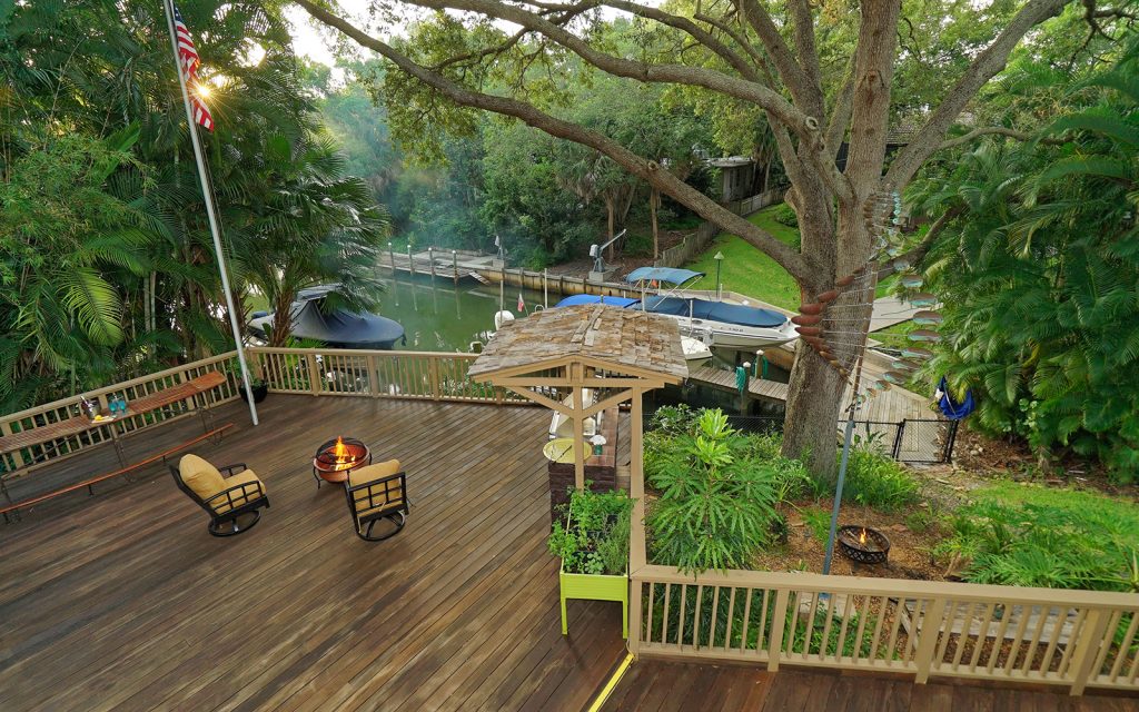 Outside, imagine the fun to be had in the extra-large screened-in pool with wide brick paver deck. Sliding screen doors open to a huge elevated ipe wood deck perfect for grilling and chilling. Step down to the 30-foot dock with large-capacity boat lift plus water and electric service.
