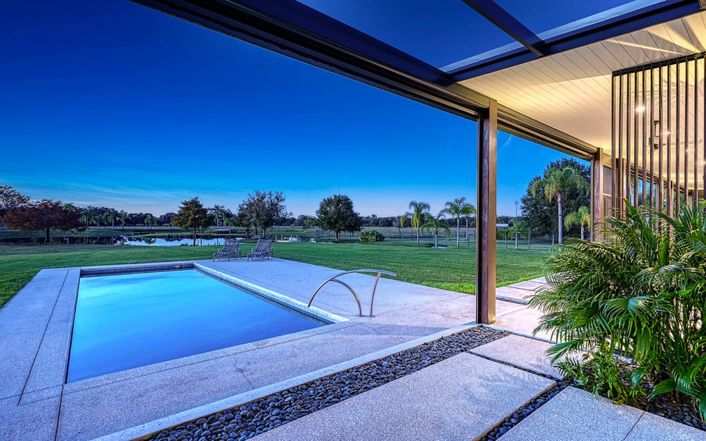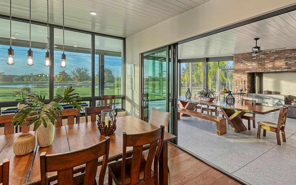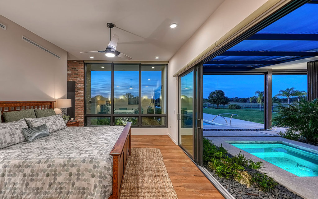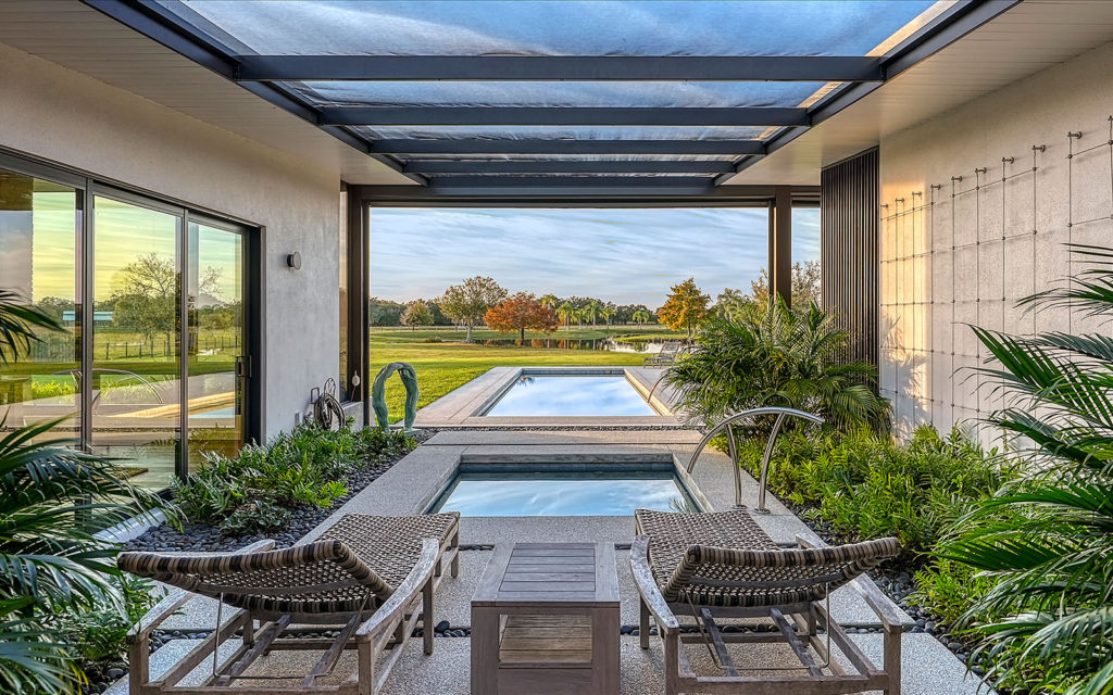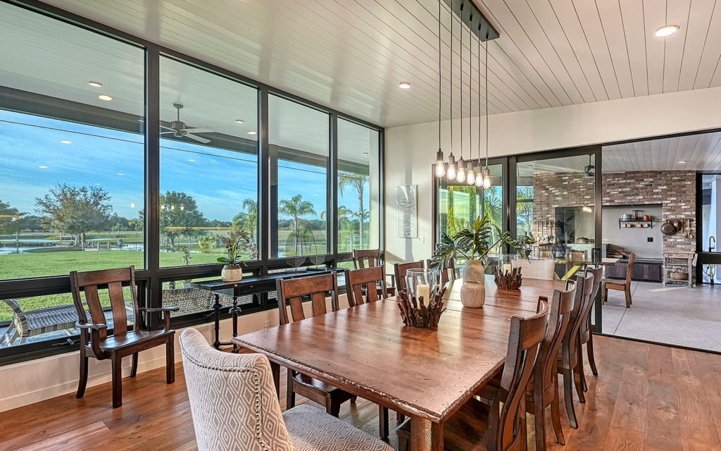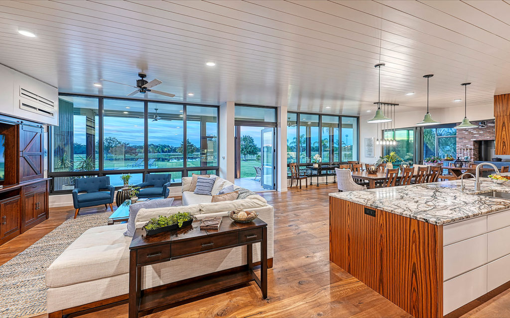 A long, oak-canopied driveway sets the tone for life here, simultaneously sublime and down to earth. The 6,901 sq. ft. residence sits above grade for a commanding view of the lake and pastures. Spread out across a single level, the home comprises a series of indoor and outdoor areas, all under one roof, linked via open-air breezeways — a nod to Florida’s iconic “dog trot” architecture designed to surround living spaces with cooling breezes. The open floor plan establishes a connection between indoor and outdoor, highlighted by floor-to-ceiling glass along the entire northwest exposure of the home. The abundance of windows provides optimal natural light, air circulation and, of course, views. Wading birds, bobcats, turkeys, deer and foxes frequent the scenery — it’s magical!