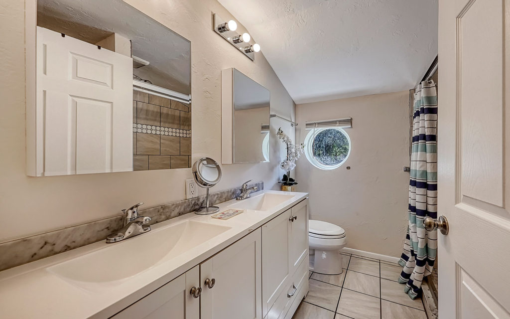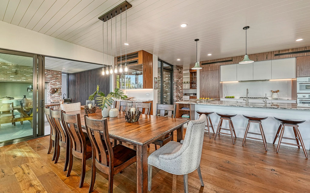 The high-end kitchen features custom wood cabinetry, 13-ft. eat-in island and a huge walk-in butler’s pantry. Not to be outdone, the outdoor kitchen/dining space elevates al fresco dining with authentic Brazilian wood-burning stove and 600 sq. ft. under roof. Outdoor living continues with a 12-ft. deep lanai that spans the back of the home with a massive wall of motorized screens to control insects and increase shade in the late afternoon. The breezeway to the private quarters adjoins a courtyard garden with a heated spa and access to the 40-ft. heated outdoor pool. Quietly removed from the living areas, this section has three bedrooms, two baths, a home office and the laundry.