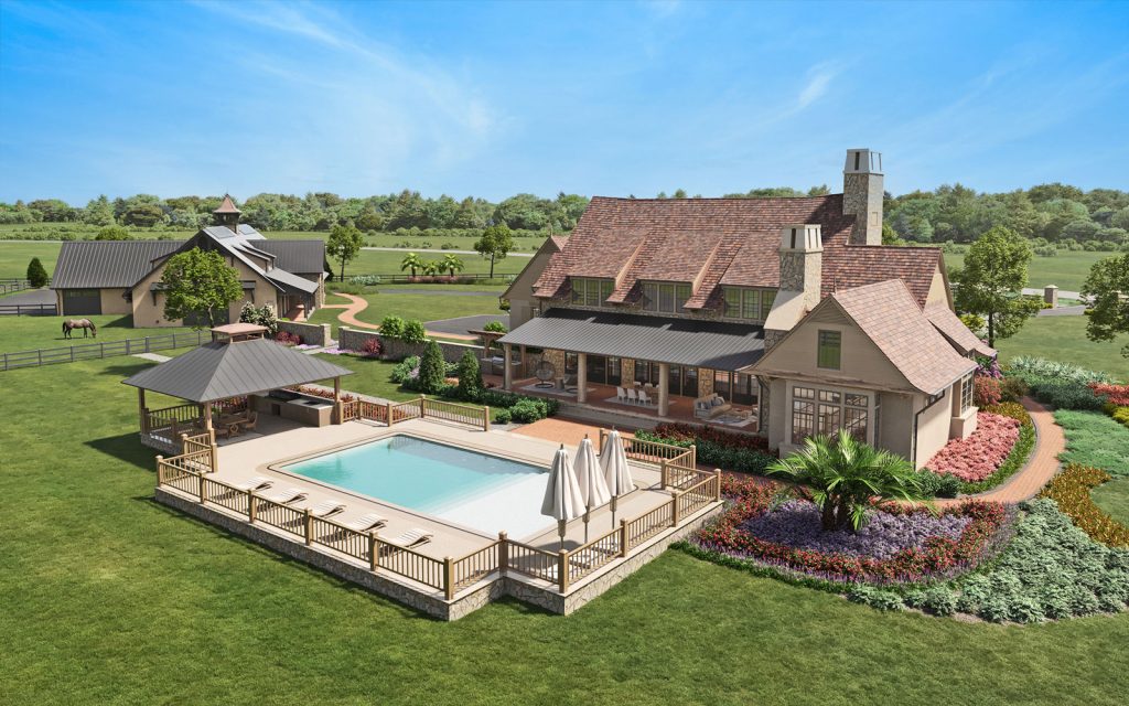 From its grand architecture to the smallest finishing touch, every detail is carefully crafted to create a residence that offers not just beauty, but the ultimate in functionality and sophistication. From handmade pegs to hand-hewn accent posts, to unique ironwork and millwork, it’s the little things that make this home special and unique. Artisan-designed and crafted elements include exposed wood-beam ceilings, reclaimed wood lintels, natural stone exterior walls, statement staircase, rustic brick walkways and hand-forged wrought-iron light fixtures. The first floor of this two-story residence has a central open floor plan, primary suite, study and mud room. The second floor has three bedrooms with en-suite baths and gathering loft area. The spacious mud room features storage cubbies, walk-in closet, laundry room access and side-entry covered porch with walkway to the horse barn. The open living area has three sets of oversize French doors that open to a generous 780-square-foot covered lanai. The lanai features a wood-burning fireplace and overlooks the swimming pool and pastures beyond.