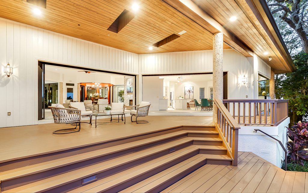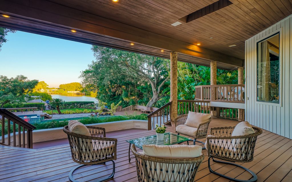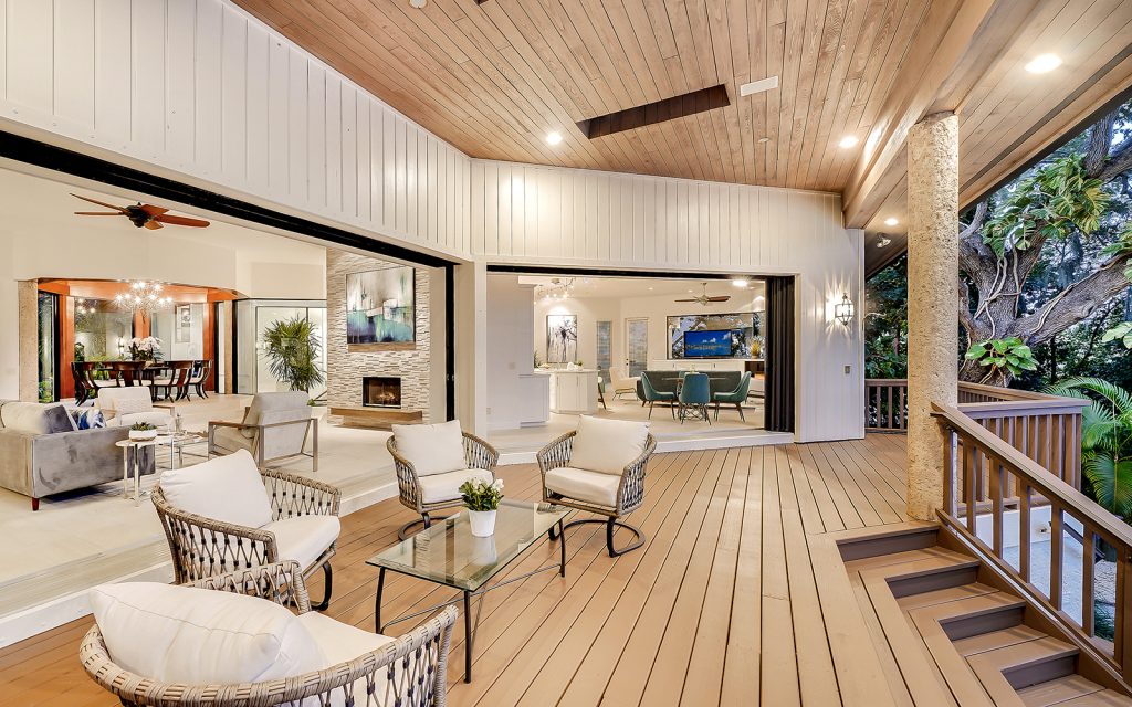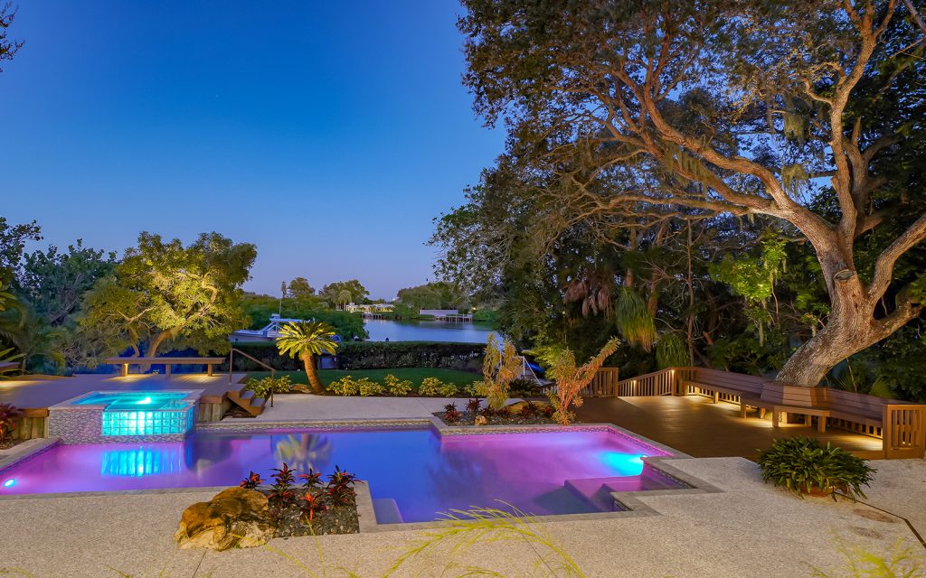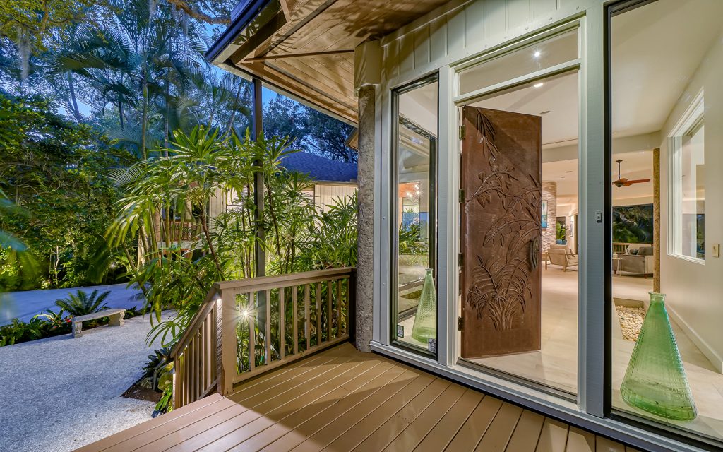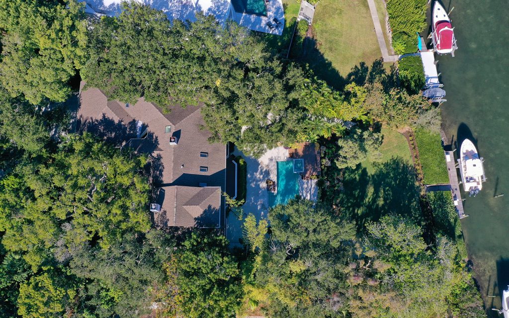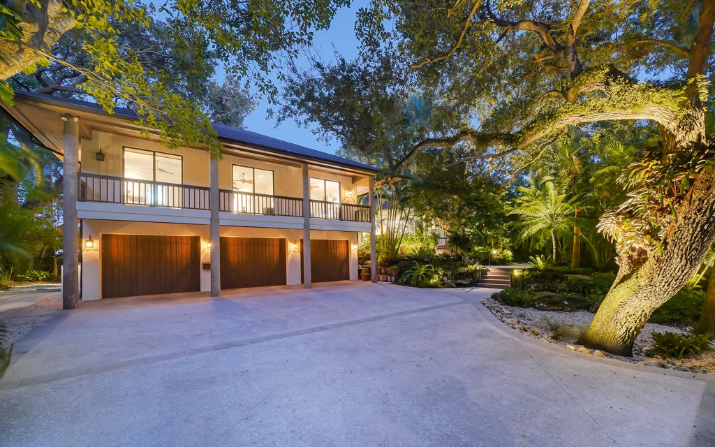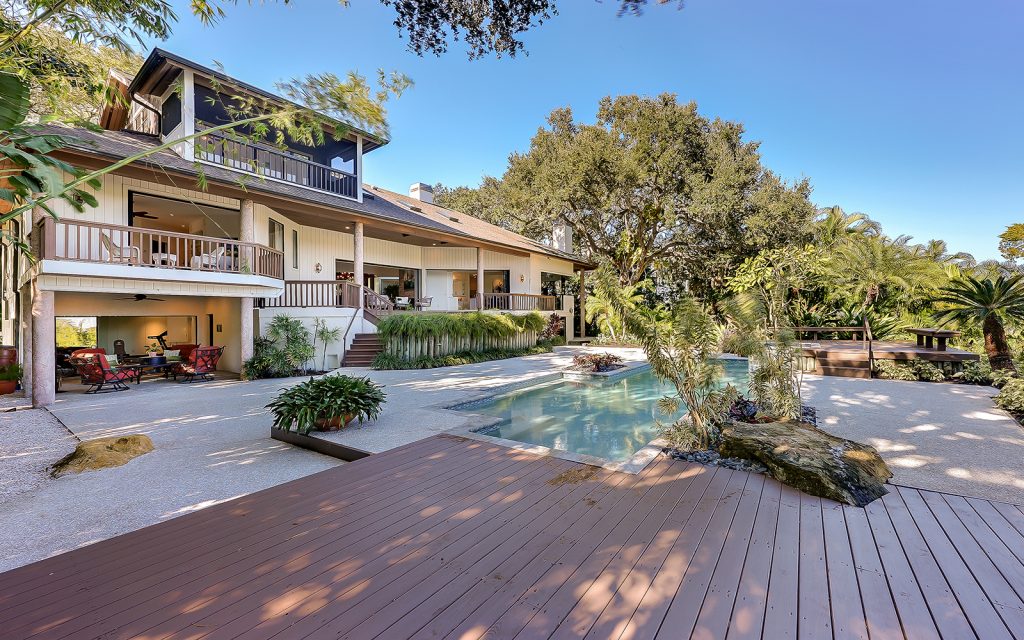 Secluded waterfront playground on North Siesta Key. Immerse yourself in a rich and many-layered world deeply-rooted in ecology and grounded in place and community. Built on one of the highest natural grades on Siesta Key, this residence draws upon the principles of organic architecture, with interior and exterior in balanced harmony. Affectionately referred to as “Selby of Siesta,” the native landscape is sublime. Each room has a beautiful view of the outdoors where old oak trees create a filtered light canopy over the residence. There’s plenty of room to play, too. The oversize driveway accommodates basketball and skateboarding. The large back lawn is perfect for soccer, football and volleyball. The pool/spa with surrounding decks invite water fun and relaxation. The deep-water dock with 16,000-lbs. boat lift and kayak/paddleboard rack get you out on the water for enjoying the salt life. Private, gated beach access for the exclusive use of Cocoanut Bayou residents.