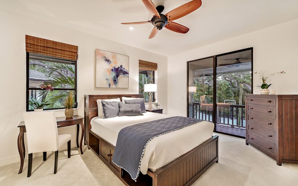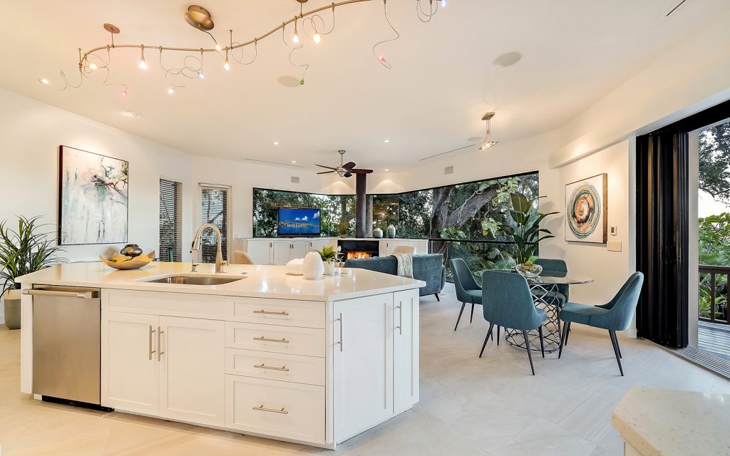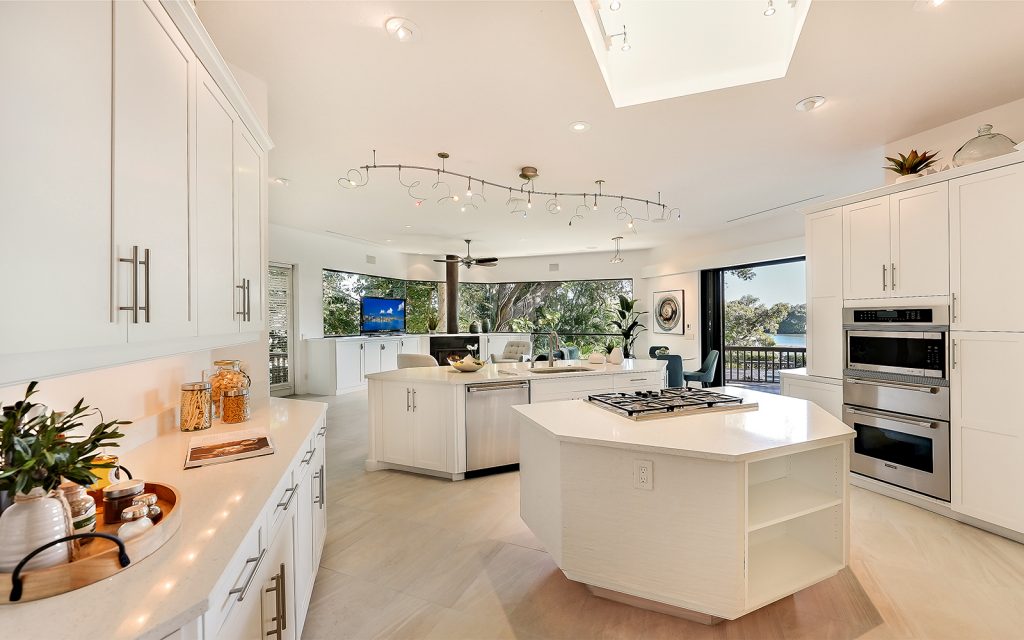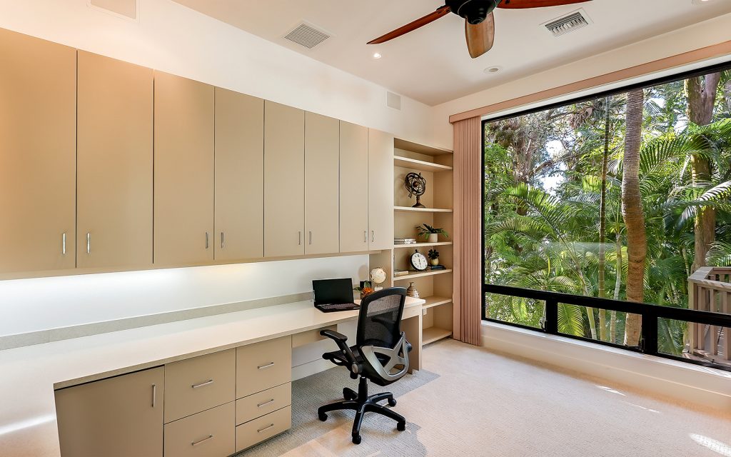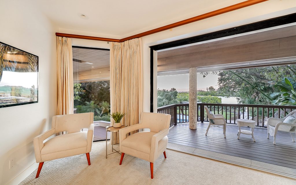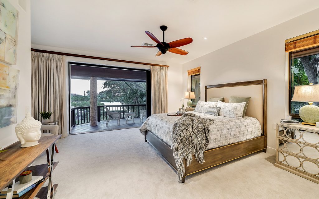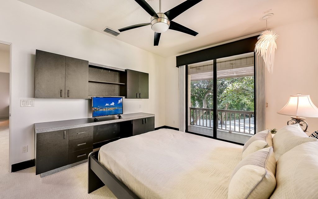 Inside, high ceilings, skylights and exceptionally large windows create an open space with a calming ambiance. The living room and family room both have fully-pocketed sliding glass doors to the covered back deck with water view. The cook’s kitchen features two islands, gas cooktop with downdraft ventilation, new solid-wood cabinet fronts and quartz countertops. The split floorplan has three bedrooms on one side of the home and the master suite on the other. Each of the four bedrooms has an ensuite bath and sliding glass doors to a covered balcony. The master suite features a large, private loft that can be used to your heart’s desire – meditation room, library, yoga studio, office. From the loft’s balcony, you can see the bay, Siesta Key bridge and beyond. The home’s ground level offers a full floor of non-conforming, conditioned flex space for recreation and storage.