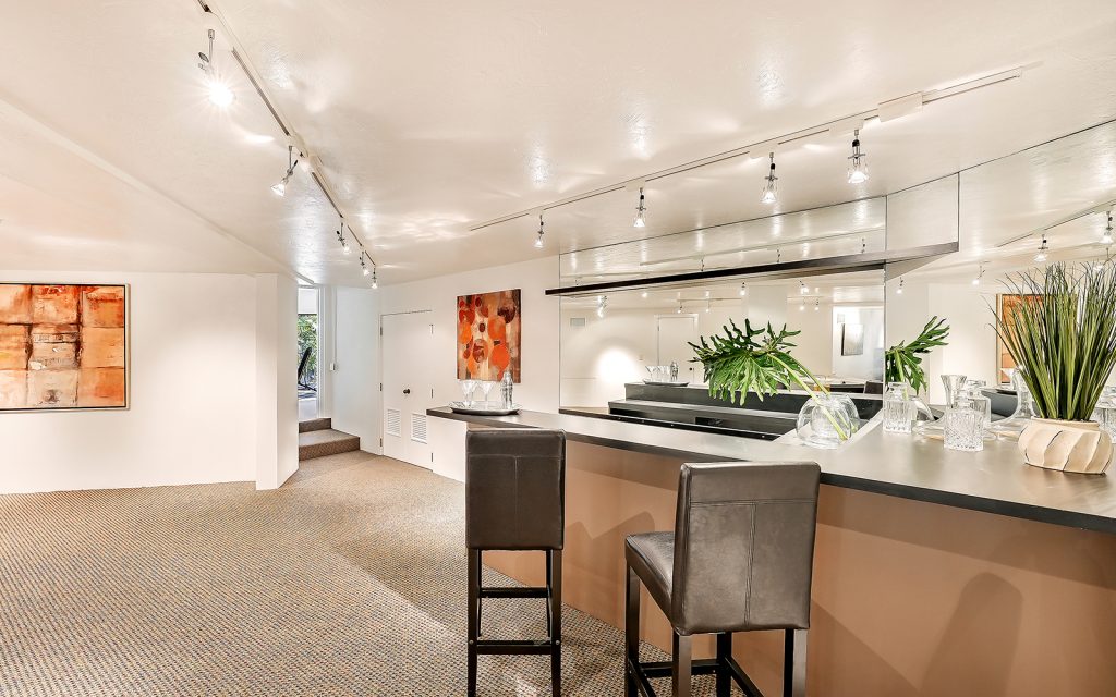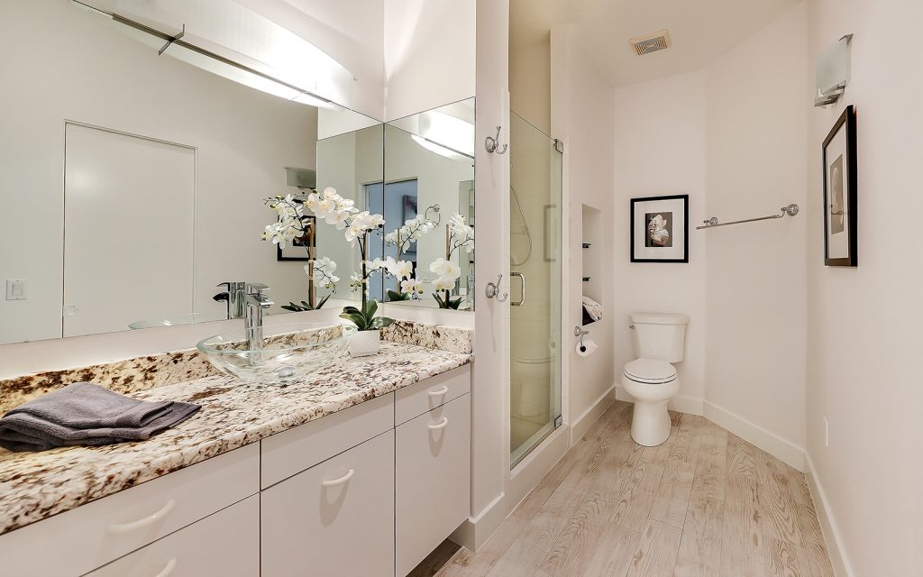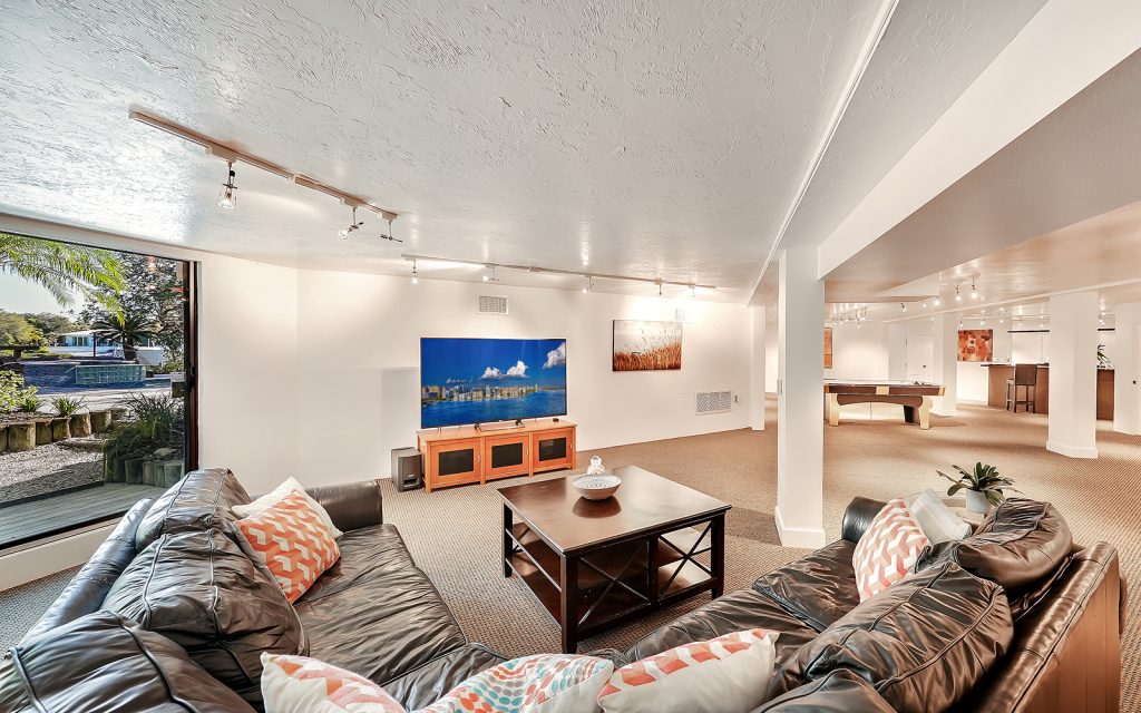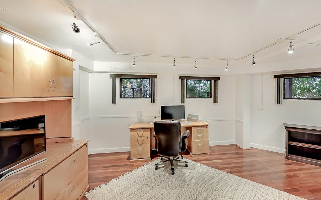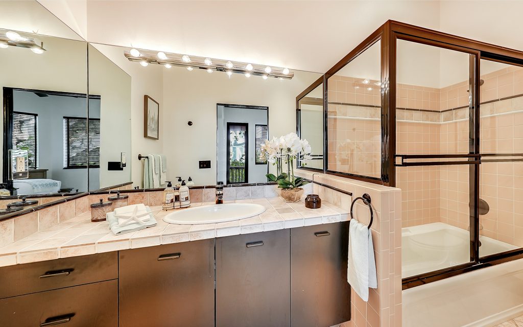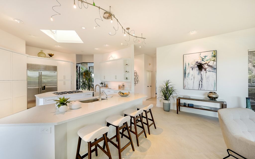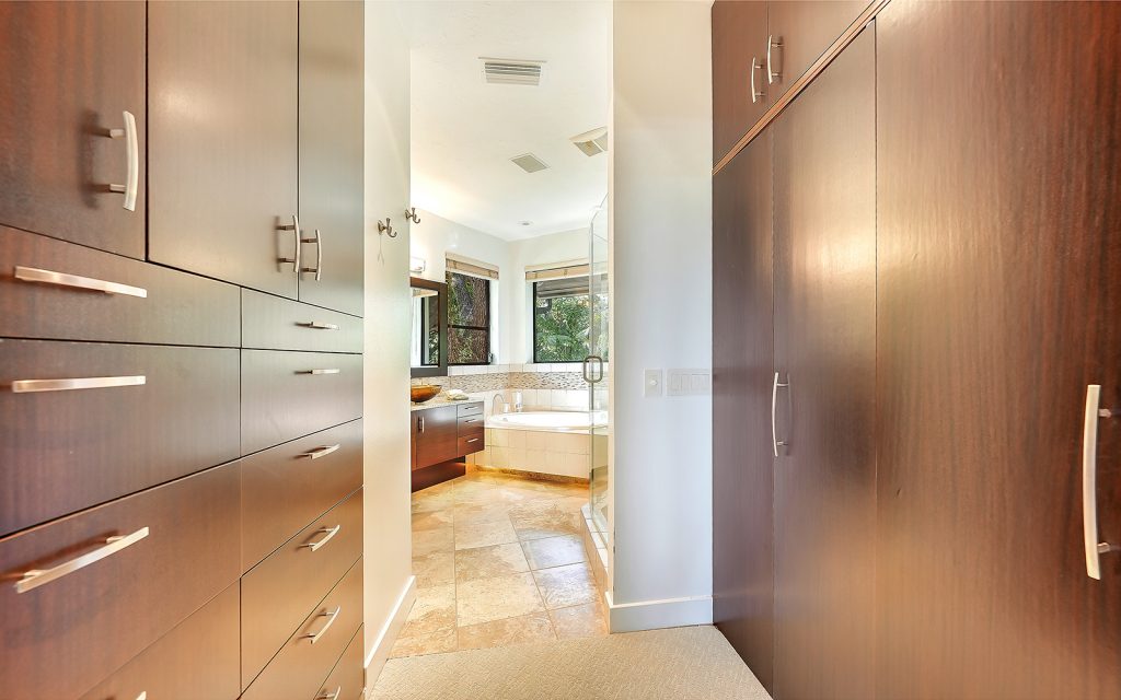Inside, high ceilings, skylights and exceptionally large windows create an open space with a calming ambiance. The living room and family room both have fully-pocketed sliding glass doors to the covered back deck with water view. The cook’s kitchen features two islands, gas cooktop with downdraft ventilation, new solid-wood cabinet fronts and quartz countertops. The split floorplan has three bedrooms on one side of the home and the master suite on the other. Each of the four bedrooms has an ensuite bath and sliding glass doors to a covered balcony. The master suite features a large, private loft that can be used to your heart’s desire – meditation room, library, yoga studio, office. From the loft’s balcony, you can see the bay, Siesta Key bridge and beyond. The home’s ground level offers a full floor of non-conforming, conditioned flex space for recreation and storage.