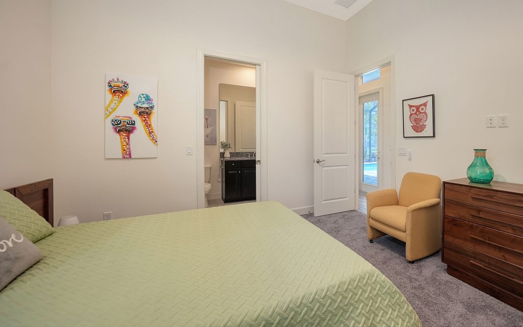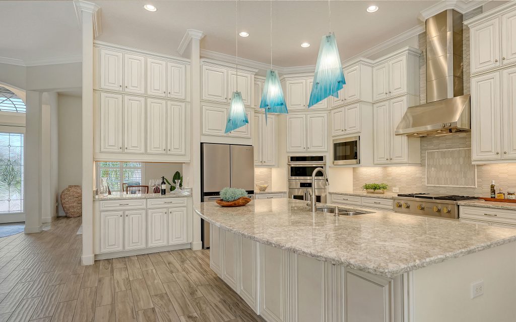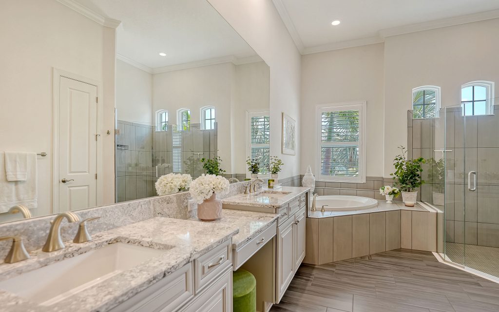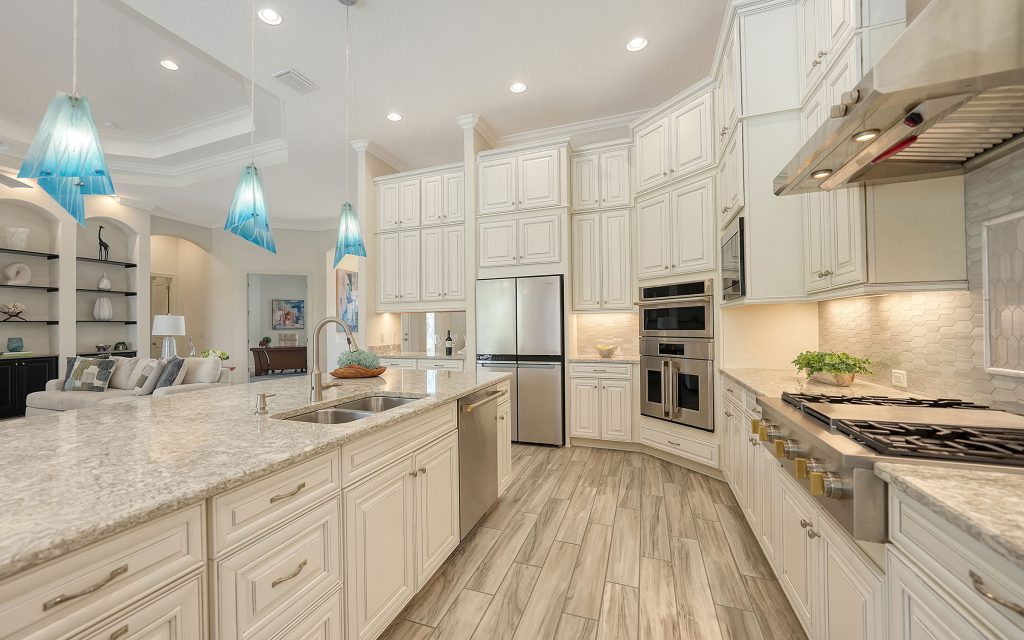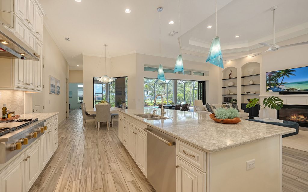 Luxury details abound, from impact glass windows and eight-foot solid-core doors to crown molding, plantation shutters and a gas fireplace. The chef’s kitchen is a showstopper, featuring double-stacked solid-wood cabinetry, granite countertops, and a generous eat-in center island with storage on both sides. GE Monogram luxury stainless steel appliances and a walk-in pantry make everyday meal prep a delight. The primary suite is a private retreat, featuring clerestory windows, his-and-her walk-in closets with custom organizers, direct access to the lanai and pool, and an ensuite bath with a jetted tub and walk-in shower.