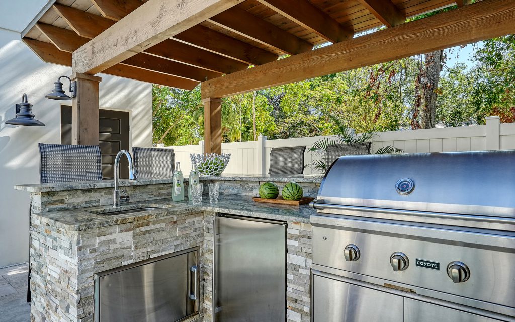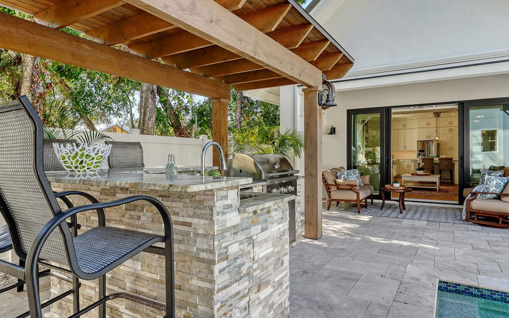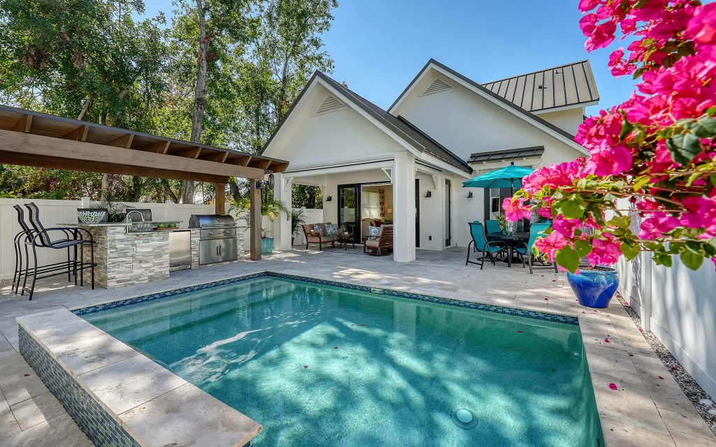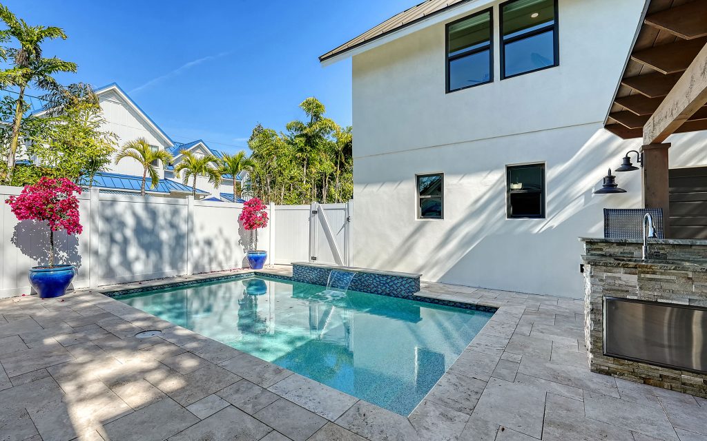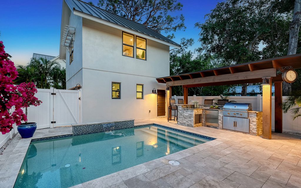 The al-fresco courtyard between the main residence and the garage has a swimming pool, travertine deck with outdoor seating area, and outdoor kitchen with built-in Coyote gas grill under a wood pergola.