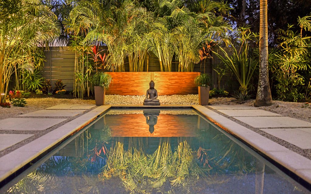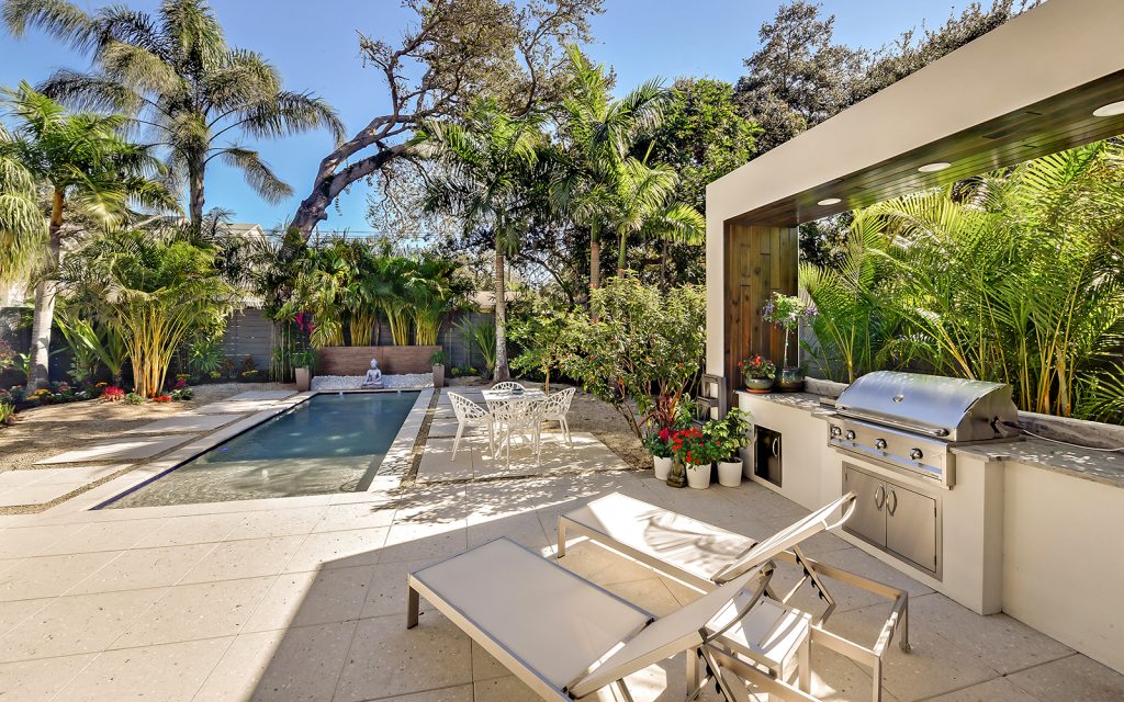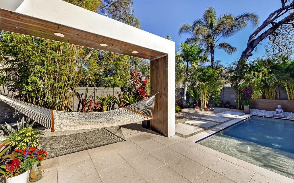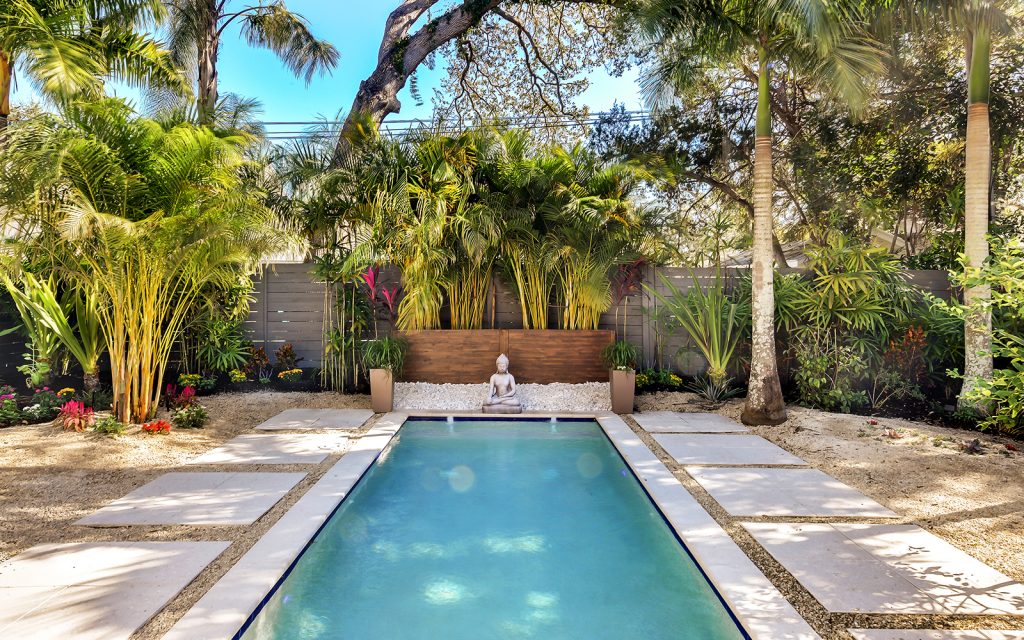 salt-water swimming pool, outdoor shower and easy-care landscape with bamboo and native plants.