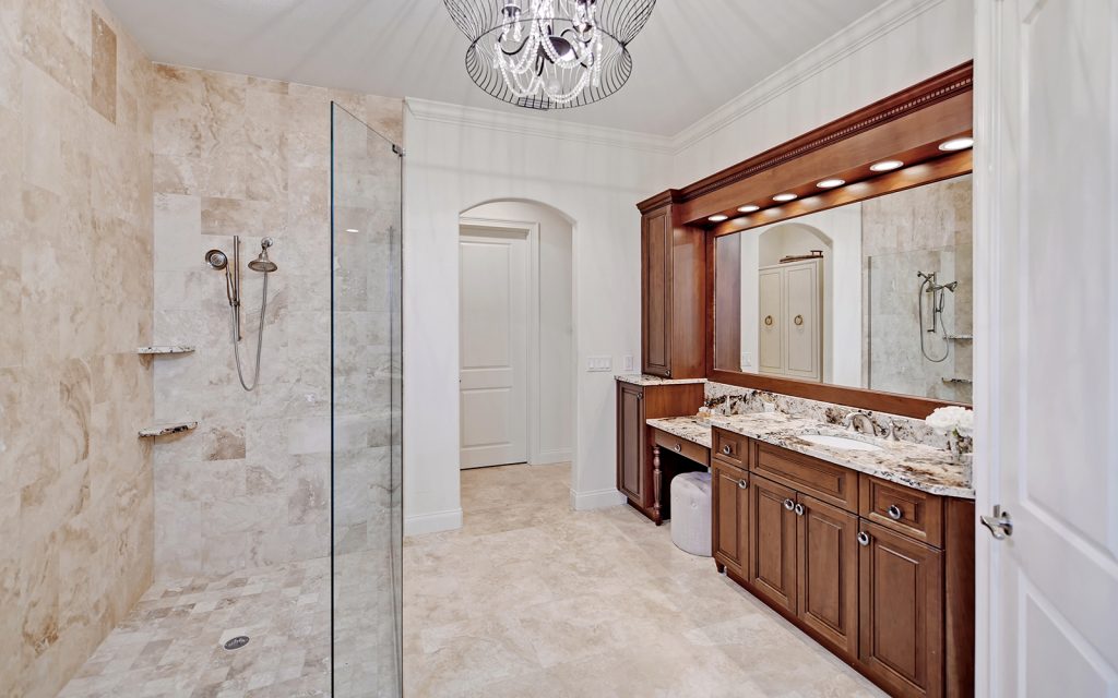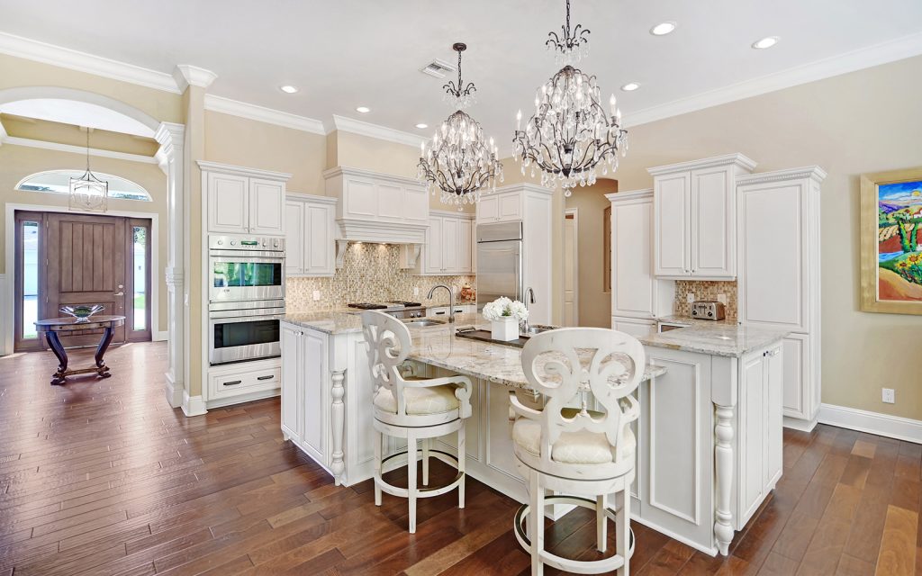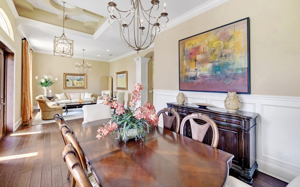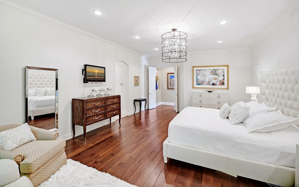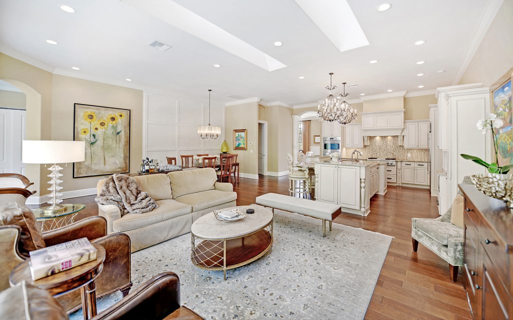 At the front of the house, the adjoining living and dining rooms provide a welcoming ambiance for social gatherings. Further in, the open concept family room and kitchen feature oversize windows and skylights where indirect sunlight make daily living bright and cheery. The high-end kitchen is a cook’s delight with Monogram luxury appliances, two clean-up stations each with sink and dishwasher, solid-wood cabinets, granite countertops and eat-in island. Through a glass door, the sparkling swimming pool awaits, surrounded by lush landscaping. Serenity reigns in the private, cool and quiet master retreat. Three additional bedrooms (one of which could be a large bonus room) complete the family’s quarters. Outside, the property boasts a beautiful, well-maintained landscape with privacy plantings and swimming pool.