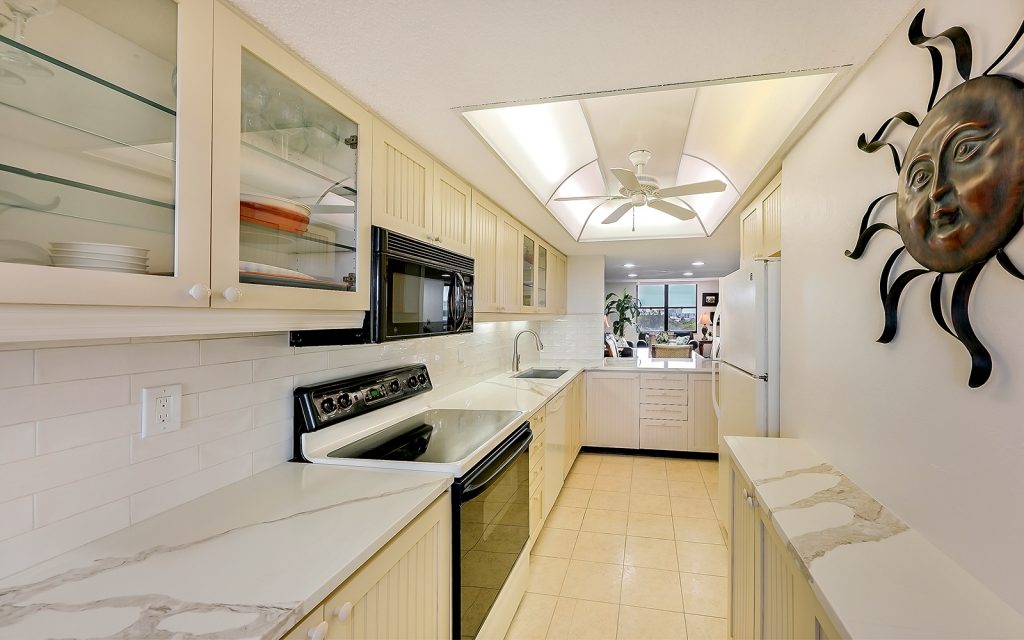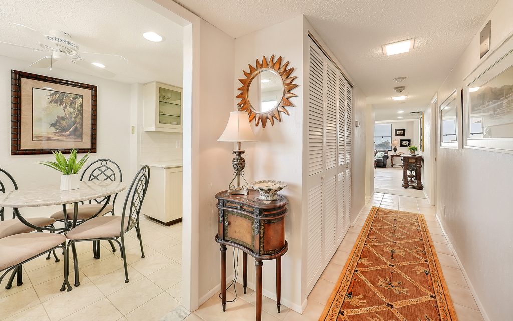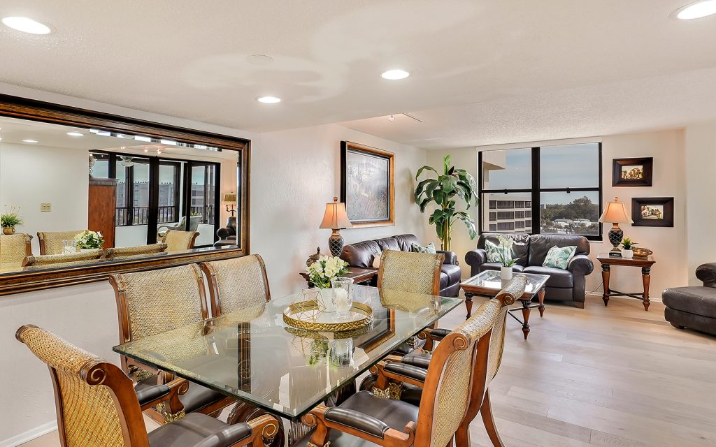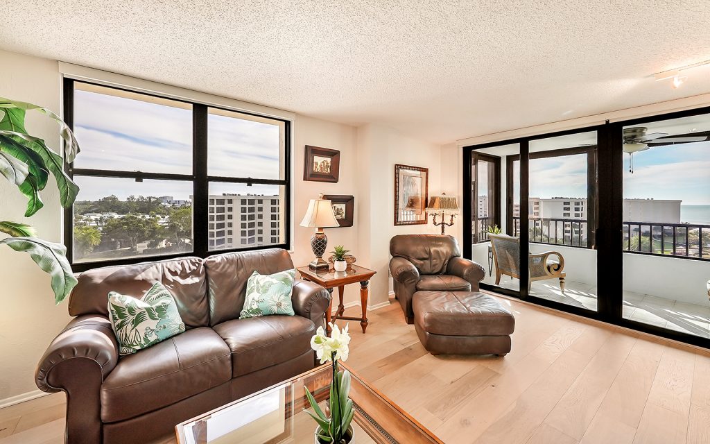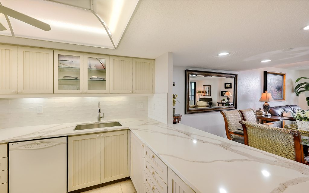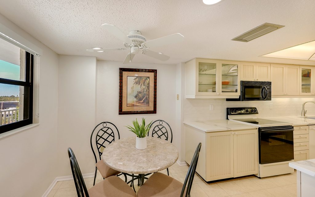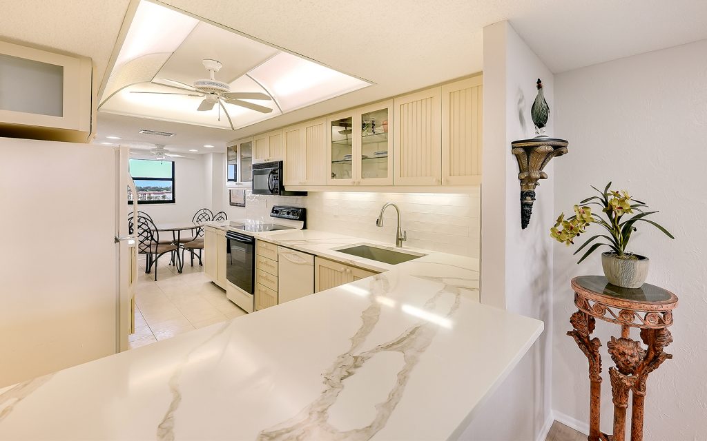 This rarely available and highly desirable top-floor unit is superbly situated to enjoy views of the Gulf of Mexico, picturesque sunsets, and expansive community courtyard. It features two spacious bedrooms with Gulf views, an open-concept great room/dining room, large pass-through opening to the kitchen, and in-unit laundry with stacked washer/dryer. Both the master suite and great room have sliding glass doors to the enclosed Florida room, the perfect place to enjoy lounging on “island time.” The kitchen has new countertops, new tile backsplash and eat-in area. Gulf and Bay Club amenities include 800-ft. private white sand beach on the Gulf of Mexico, three large heated pools including a lap pool, eight tennis courts, fitness center, six saunas, two clubhouses, BBQ/picnic areas, and a beautifully-landscaped courtyard promenade around two freshwater lakes.