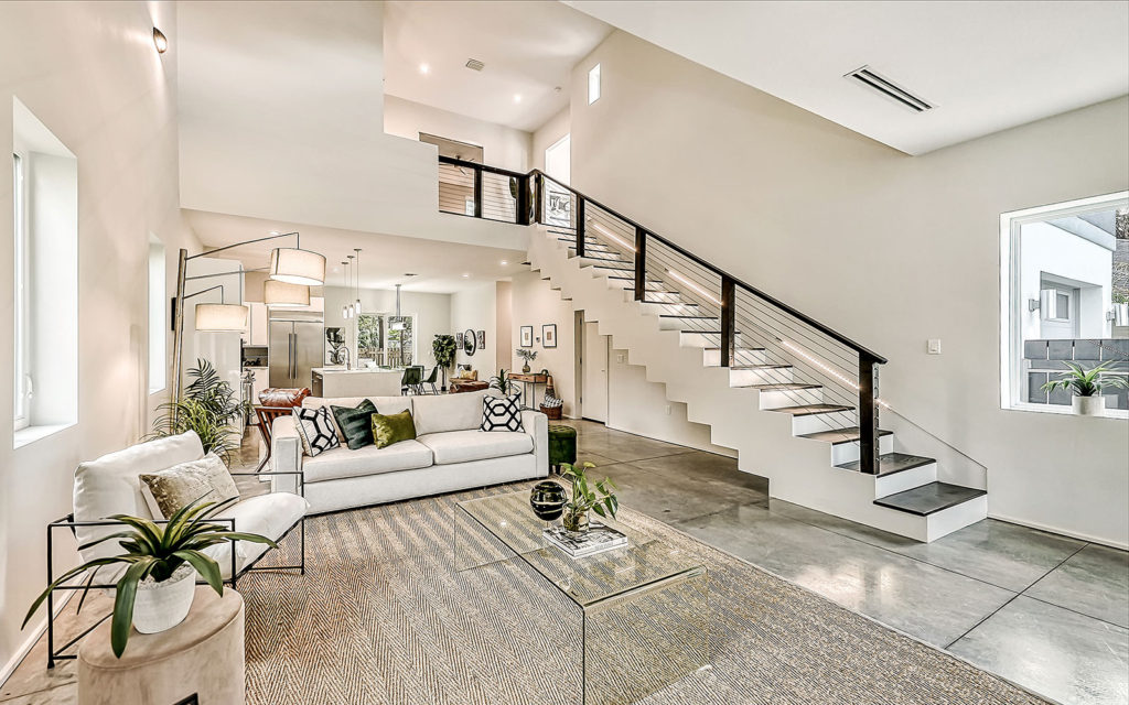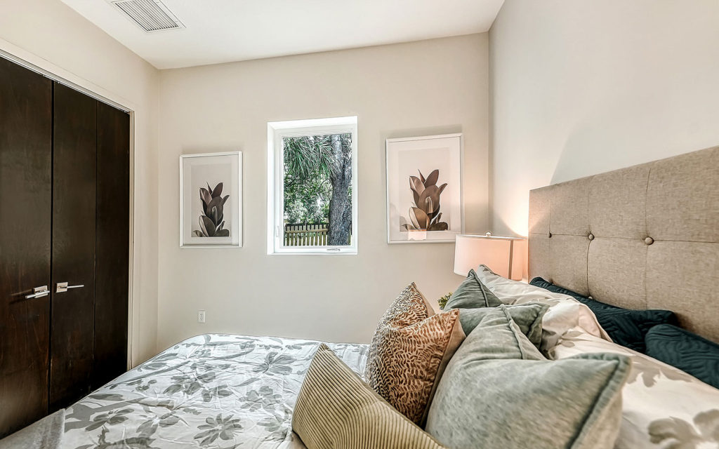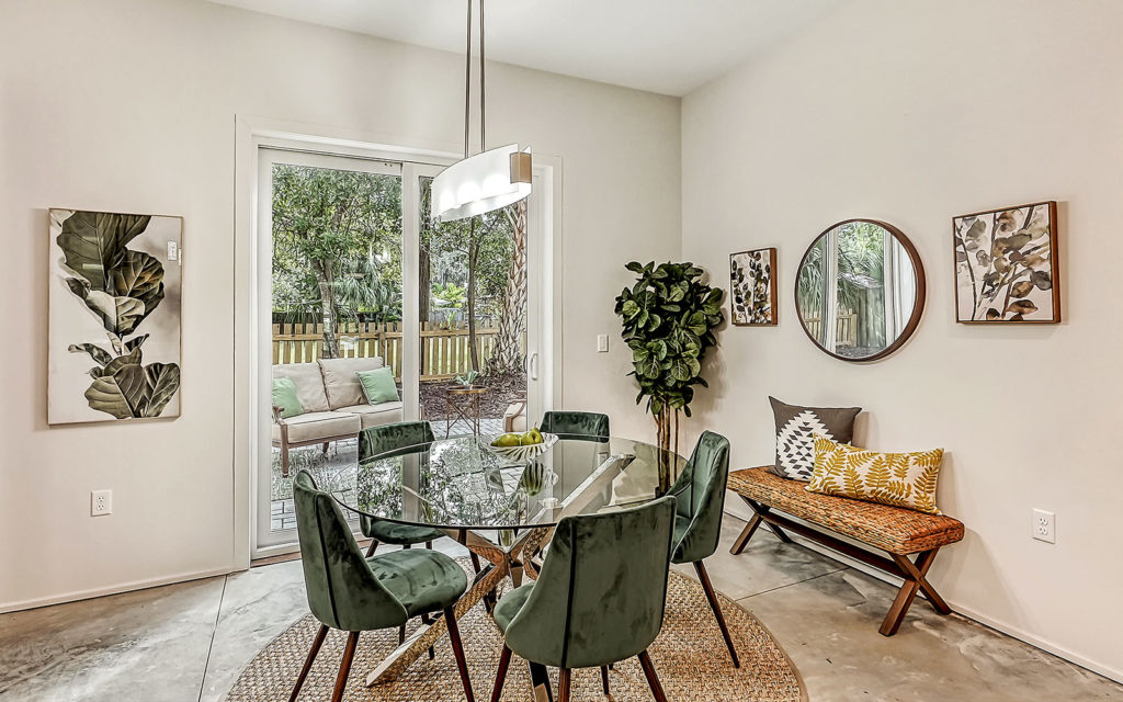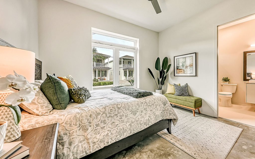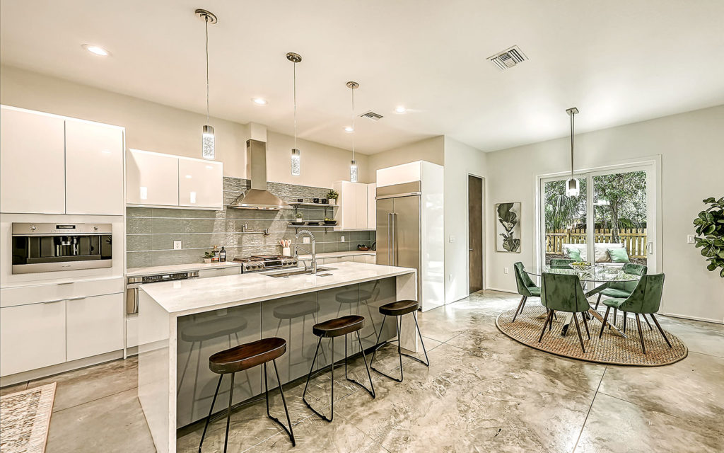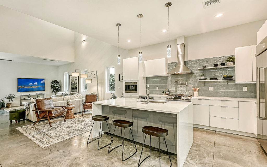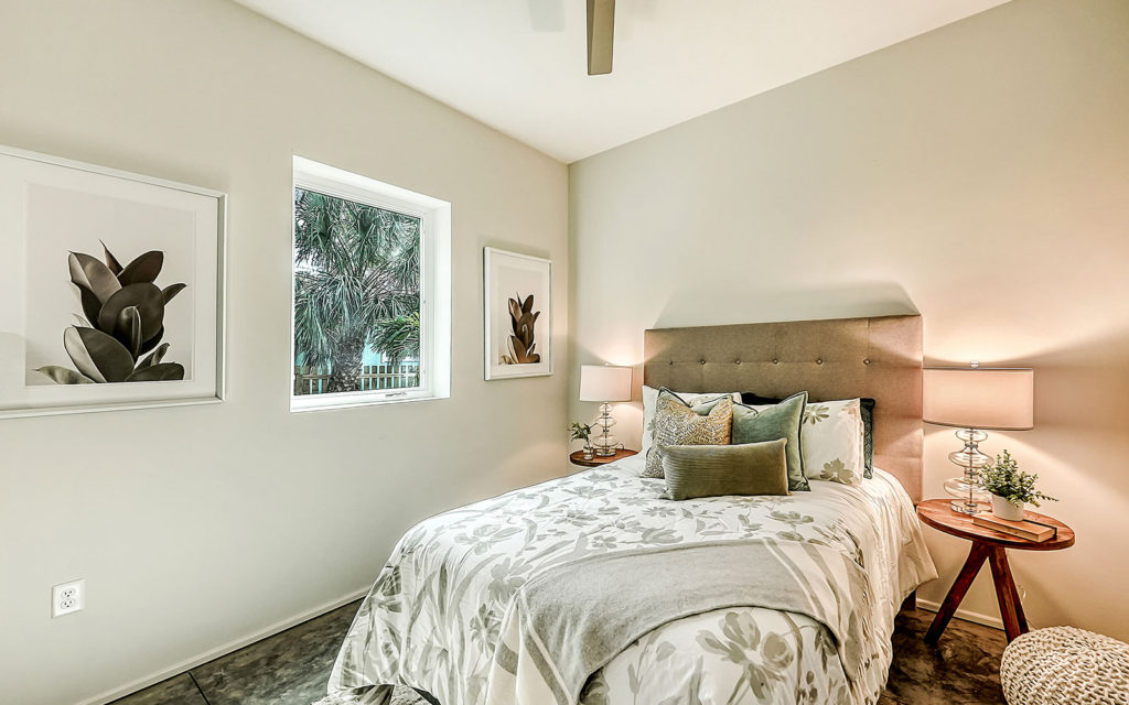 Open living areas, high ceilings and concrete floors create an urban flow throughout the home which features three bedrooms, three baths, and is clad with impact-resistant windows. At the heart of the home is an expansive social space that incorporates kitchen, dining and living areas. The kitchen features a large eat-in island,  quartz countertops and stainless steel appliances. The three bedrooms and open loft are what make this home so appealing. They can be used as bedrooms for a family, or can be creatively configured as home offices for flexible work-from-home lifestyles. Two bedrooms are on the first floor on separate sides of the home. The owner’s suite is on the second floor which also includes the loft. Outside, the property is fenced and gated, and includes a one-car garage + driveway, and a brick patio with fire pit.