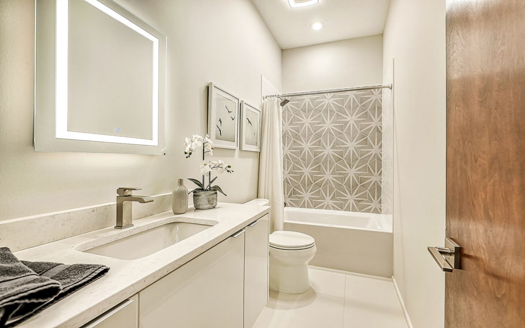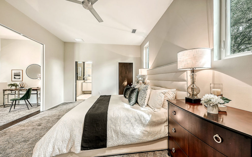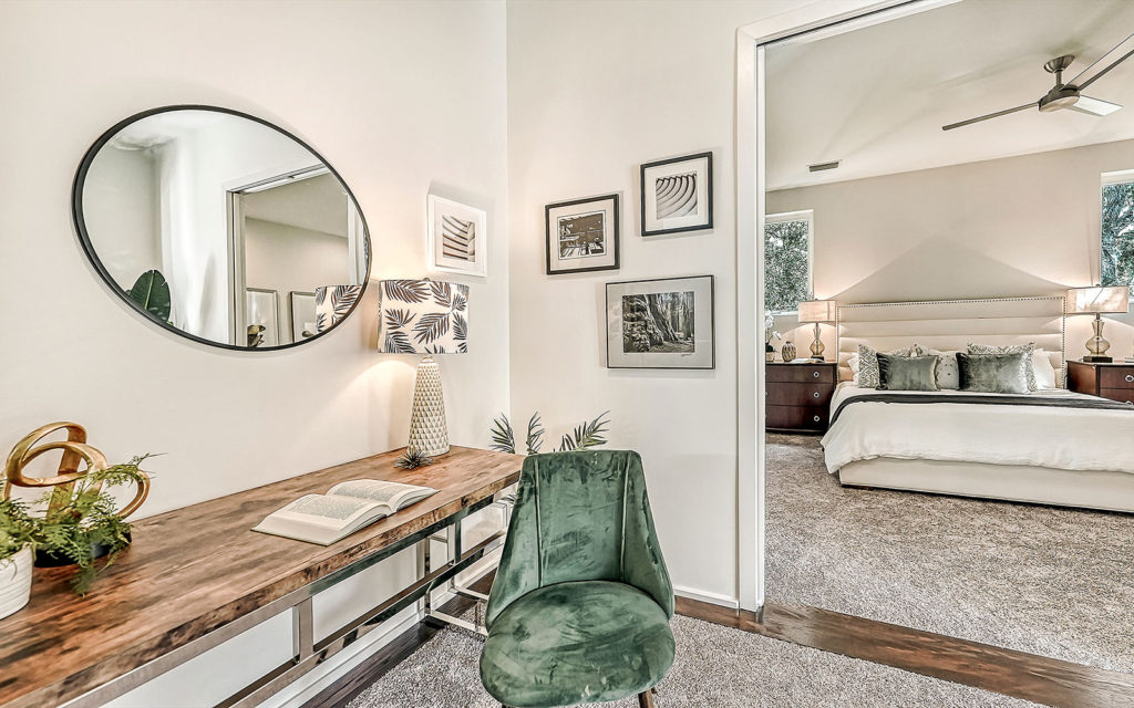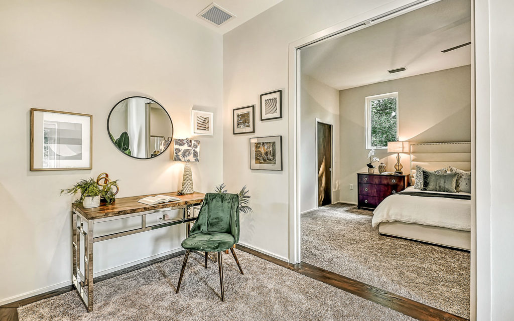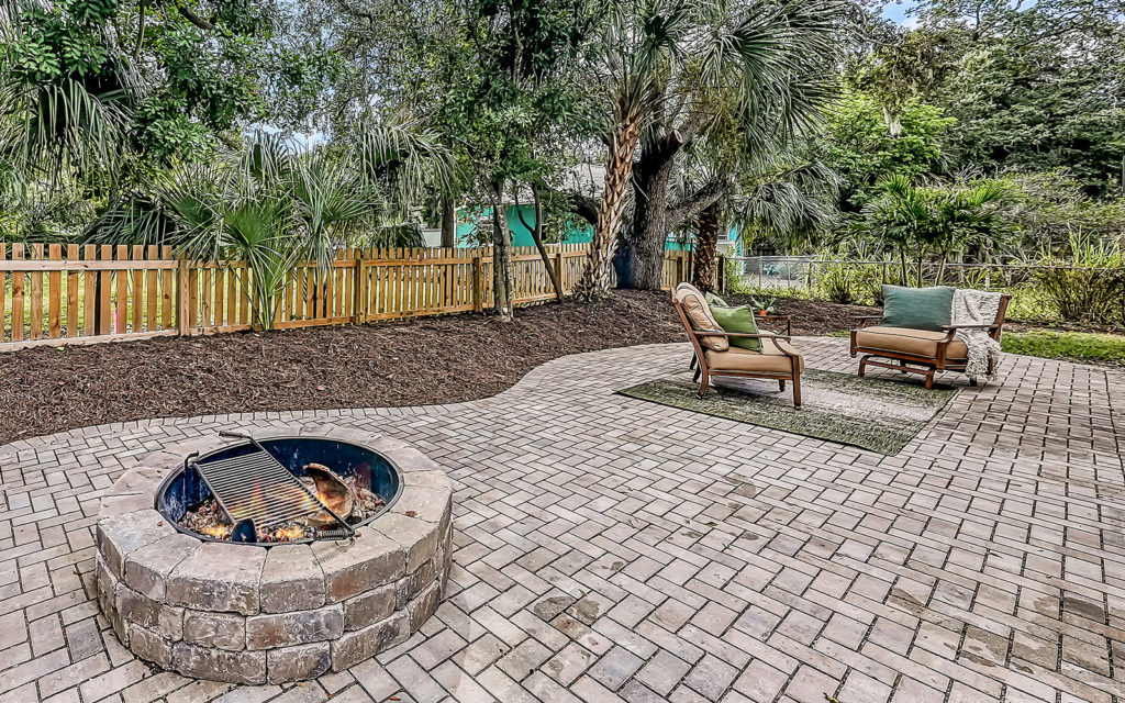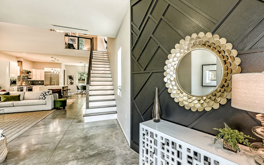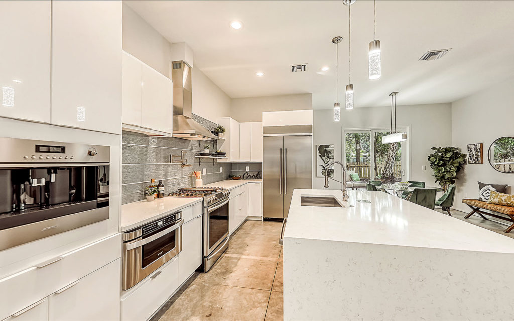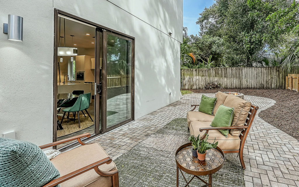 Open living areas, high ceilings and concrete floors create an urban flow throughout the home which features three bedrooms, three baths, and is clad with impact-resistant windows. At the heart of the home is an expansive social space that incorporates kitchen, dining and living areas. The kitchen features a large eat-in island,  quartz countertops and stainless steel appliances. The three bedrooms and open loft are what make this home so appealing. They can be used as bedrooms for a family, or can be creatively configured as home offices for flexible work-from-home lifestyles. Two bedrooms are on the first floor on separate sides of the home. The owner’s suite is on the second floor which also includes the loft. Outside, the property is fenced and gated, and includes a one-car garage + driveway, and a brick patio with fire pit.