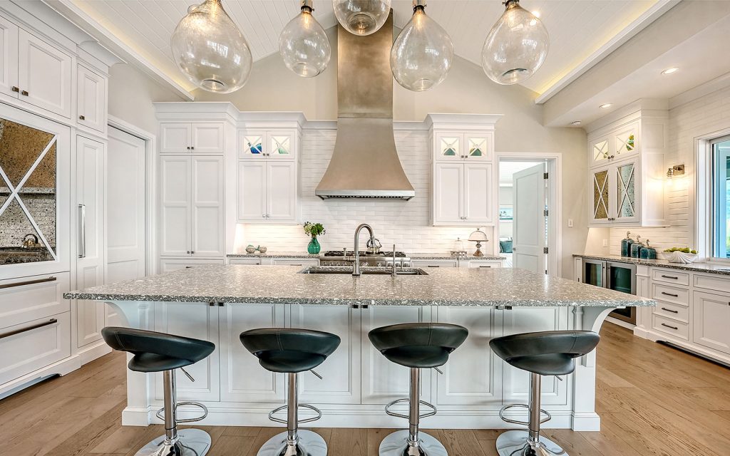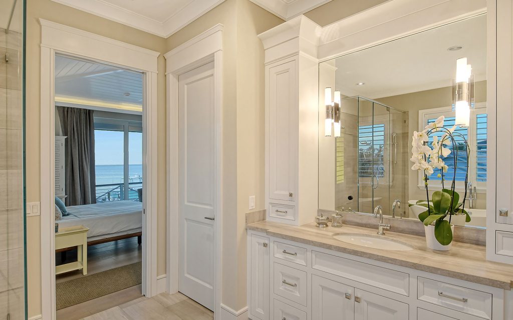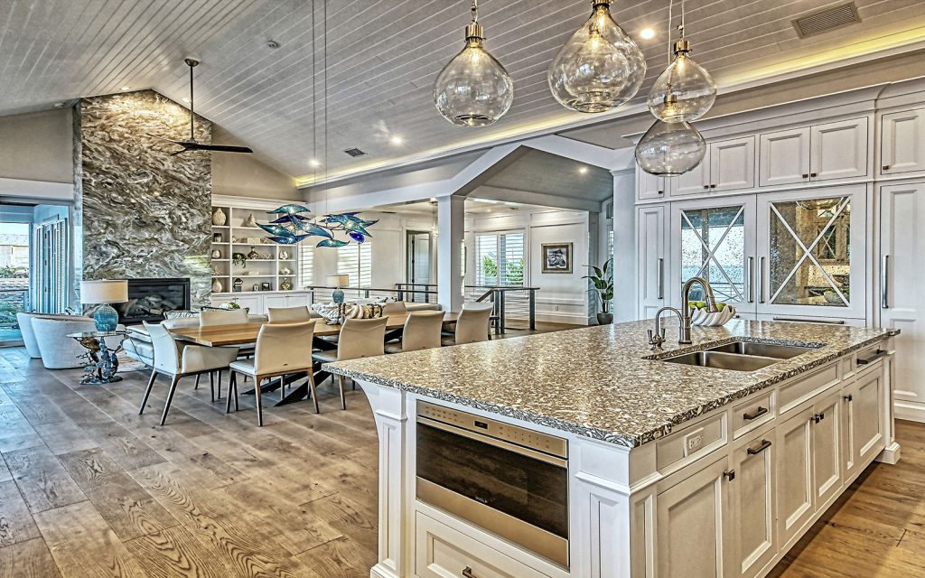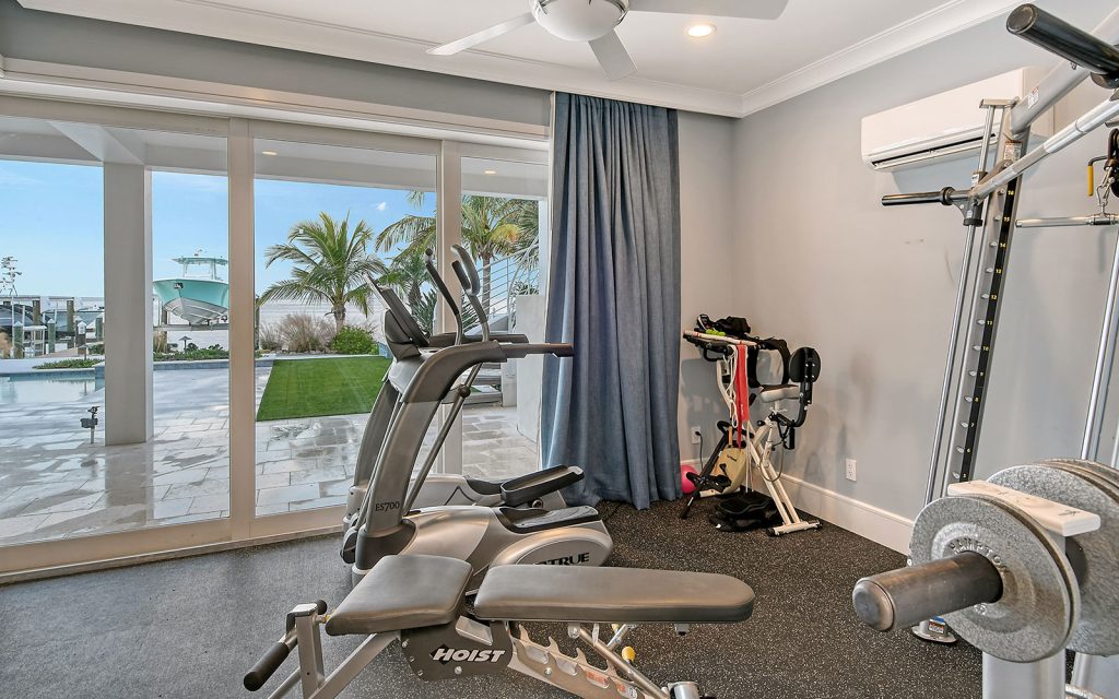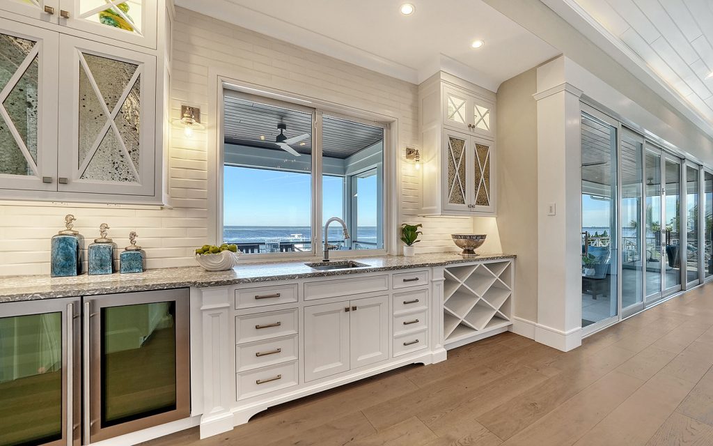This spectacular home has a stunning interior featuring white shiplap cathedral ceiling and wall-to-wall glass for uninterrupted water views. Calming coastal colors complement the seaside setting. The generous 3,388 sq. ft. floor plan includes four bedrooms, four baths, sitting room, flex room, bonus room, gym, and open living area with living room, dining room and kitchen. Luxury features include elevator, high ceilings, hardwood flooring, solid-core doors, solid-wood cabinetry, stone countertops, shiplap plank ceilings, plantation shutters, gas fireplace with massive floor-to-ceiling granite accent wall, Lutron lighting, automated screens, and garage parking for four cars. The immaculate high-end kitchen features Thermador and SubZero appliances, oversize eat-in island and solid-wood cabinetry with honed stone countertops.