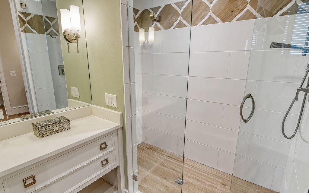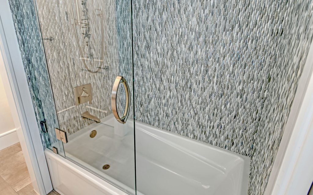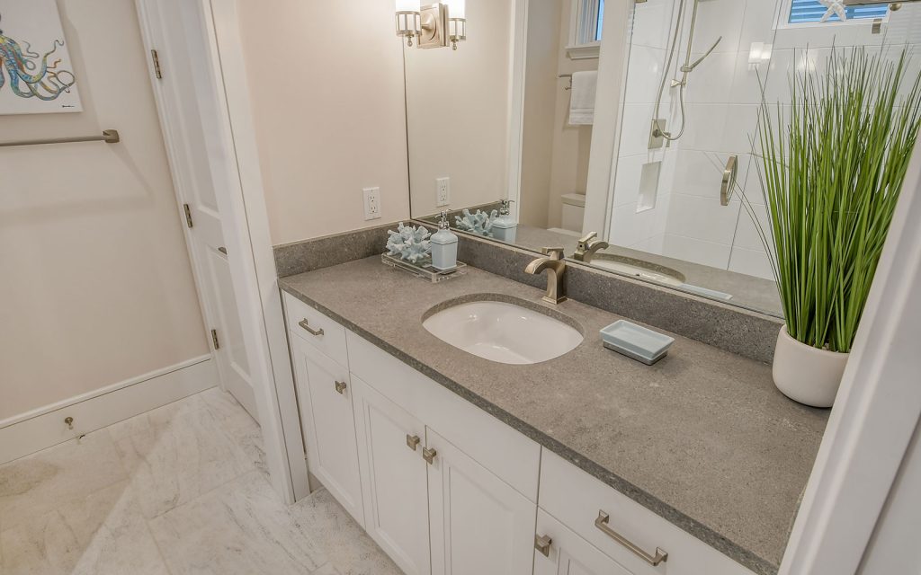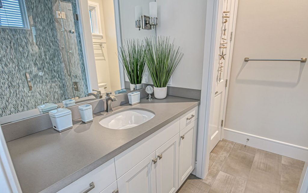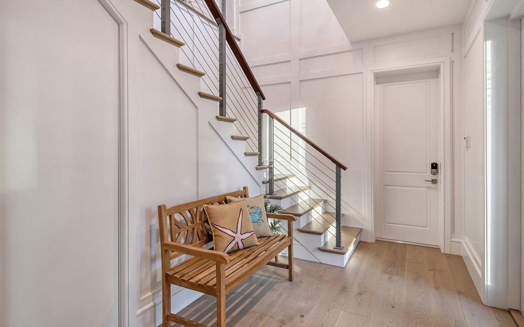 This spectacular home has a stunning interior featuring white shiplap cathedral ceiling and wall-to-wall glass for uninterrupted water views. Calming coastal colors complement the seaside setting. The generous 3,388 sq. ft. floor plan includes four bedrooms, four baths, sitting room, flex room, bonus room, gym, and open living area with living room, dining room and kitchen. Luxury features include elevator, high ceilings, hardwood flooring, solid-core doors, solid-wood cabinetry, stone countertops, shiplap plank ceilings, plantation shutters, gas fireplace with massive floor-to-ceiling granite accent wall, Lutron lighting, automated screens, and garage parking for four cars. The immaculate high-end kitchen features Thermador and SubZero appliances, oversize eat-in island and solid-wood cabinetry with honed stone countertops.