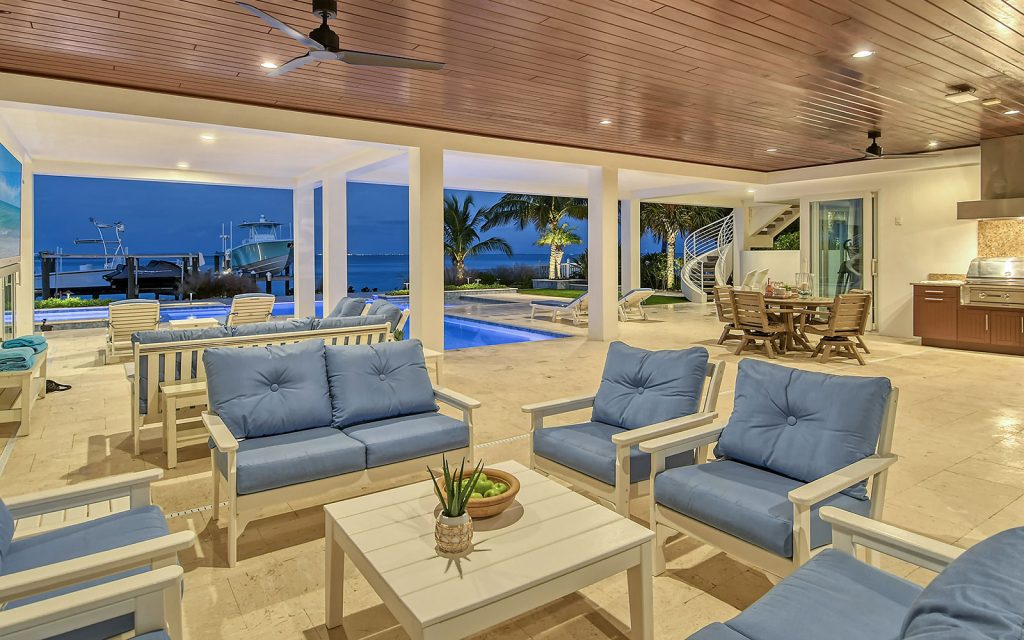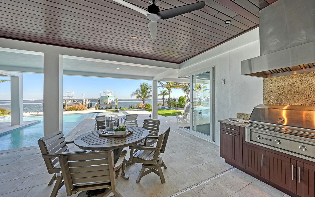 This waterfront masterpiece opens to an outdoor setting where exceptional living continues — covered patio with outdoor kitchen, outdoor dining and lounge area; heated pool/spa with infinity edge; sun deck; fire pit; and dock with four lifts. Located on a quiet, dead-end street in Key Royale on north Anna Maria Island, just minutes to white-sand beaches, and quaint shopping and dining.