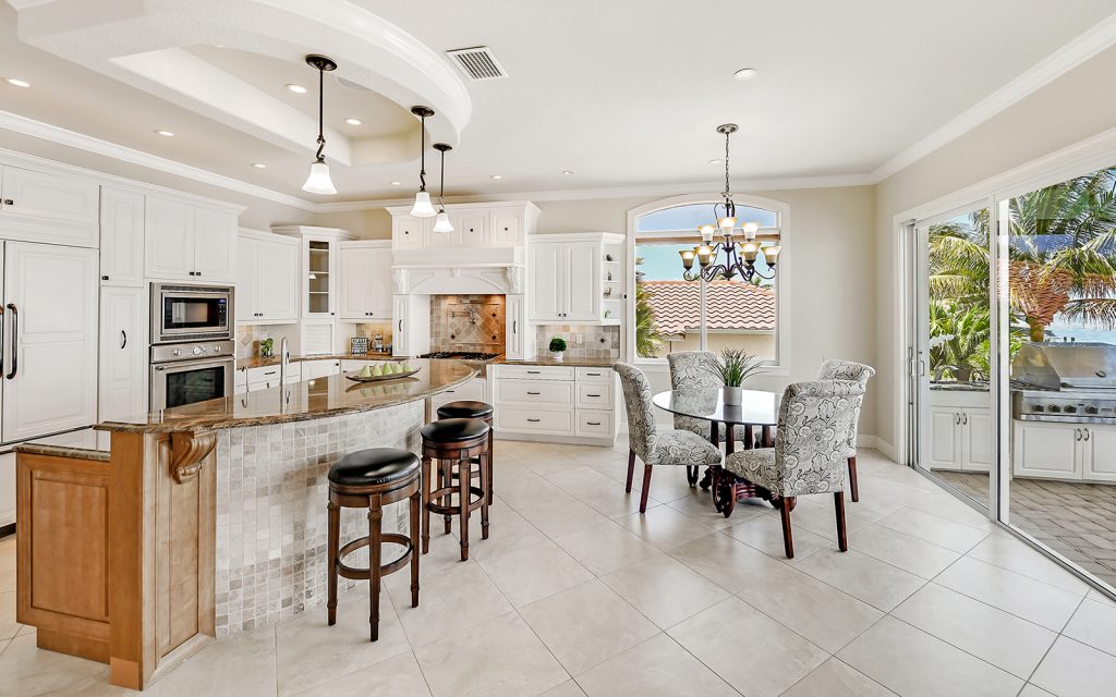 This waterfront home opens up to an outdoor setting where exceptional living continues — covered patio with outdoor kitchen, heated pool/spa, and deep-water dock with boat lift.